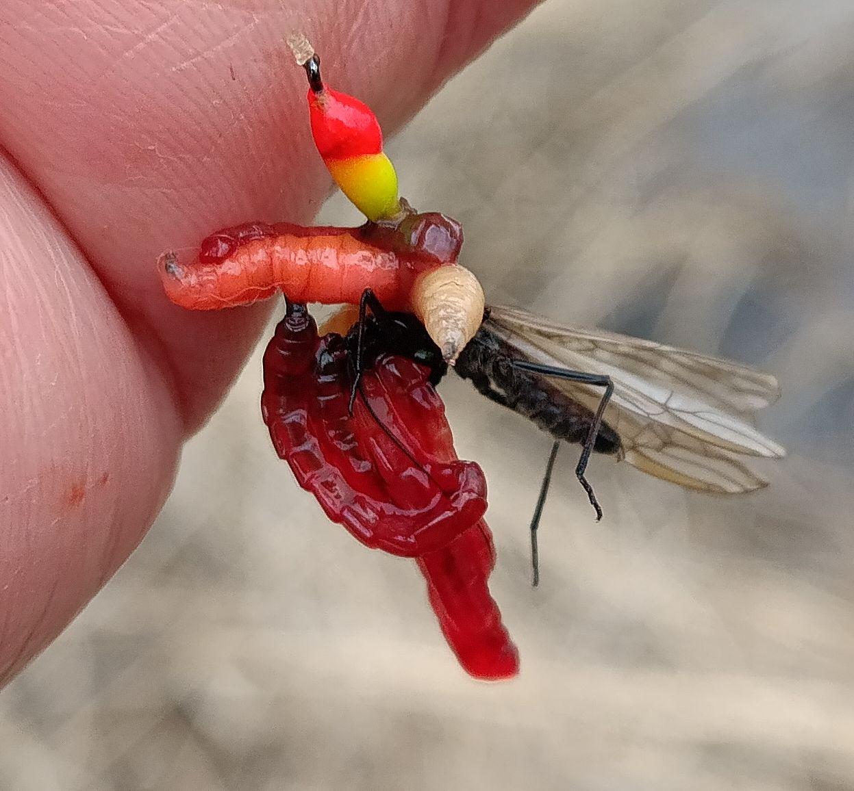 Валера ,а что за зверь такой , с крылышками и лапками , насажен на крючок между мотылем и опарышем ?