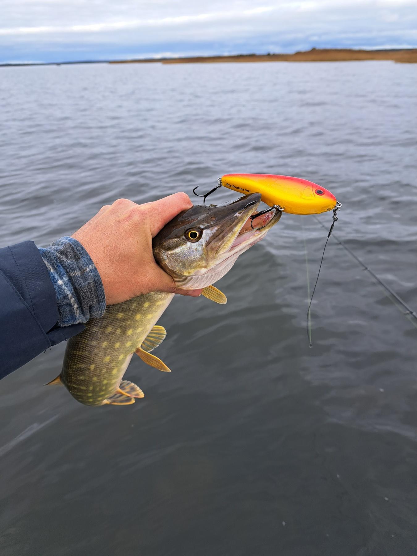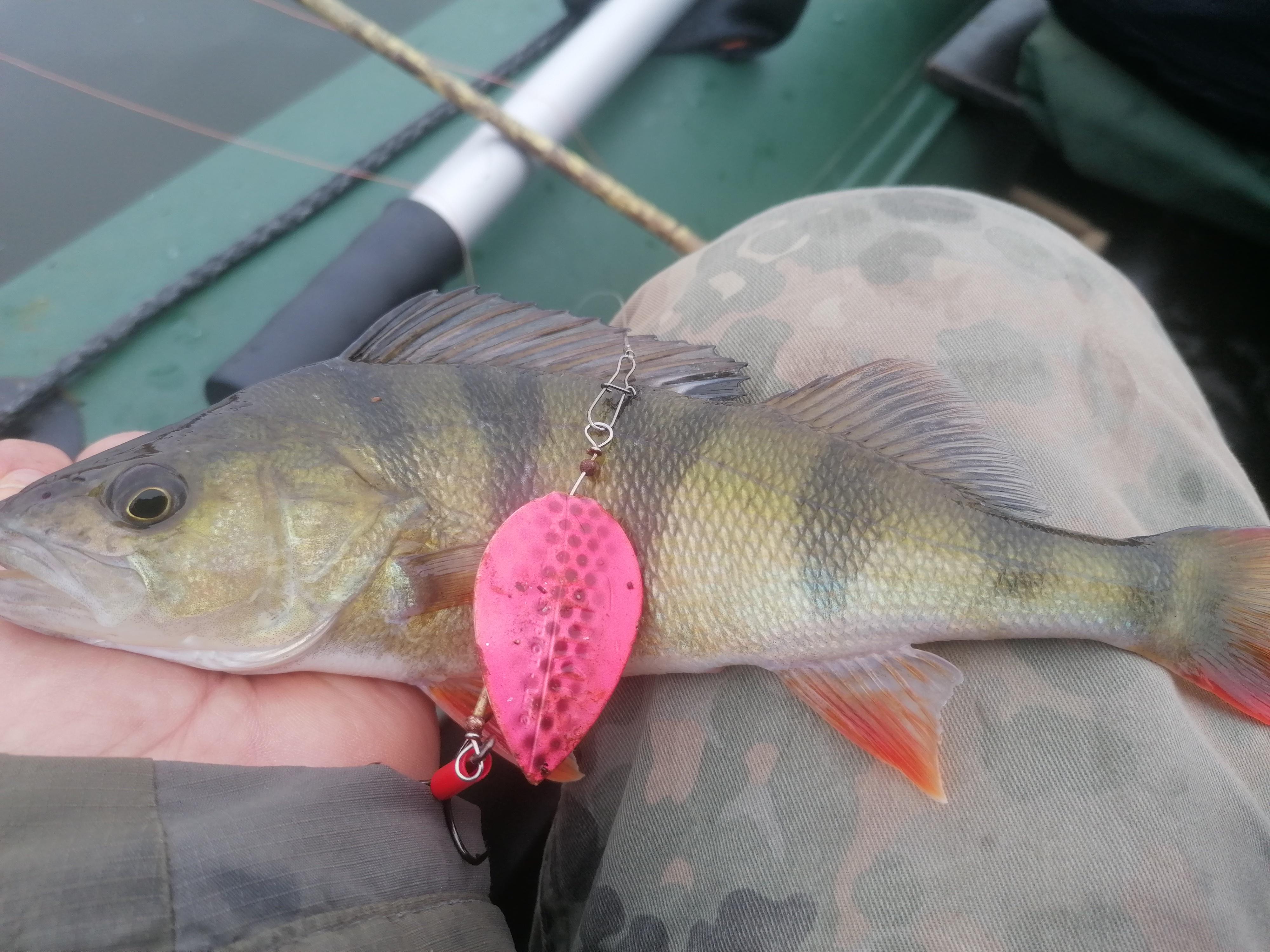 В субботу приехали первым паромом. Погода красивая, лёгкий ветерок. Первого окуня я взял на 4 забросе в 50 метрах от слипа. Напарник первую щуку взял на 5 запросе.