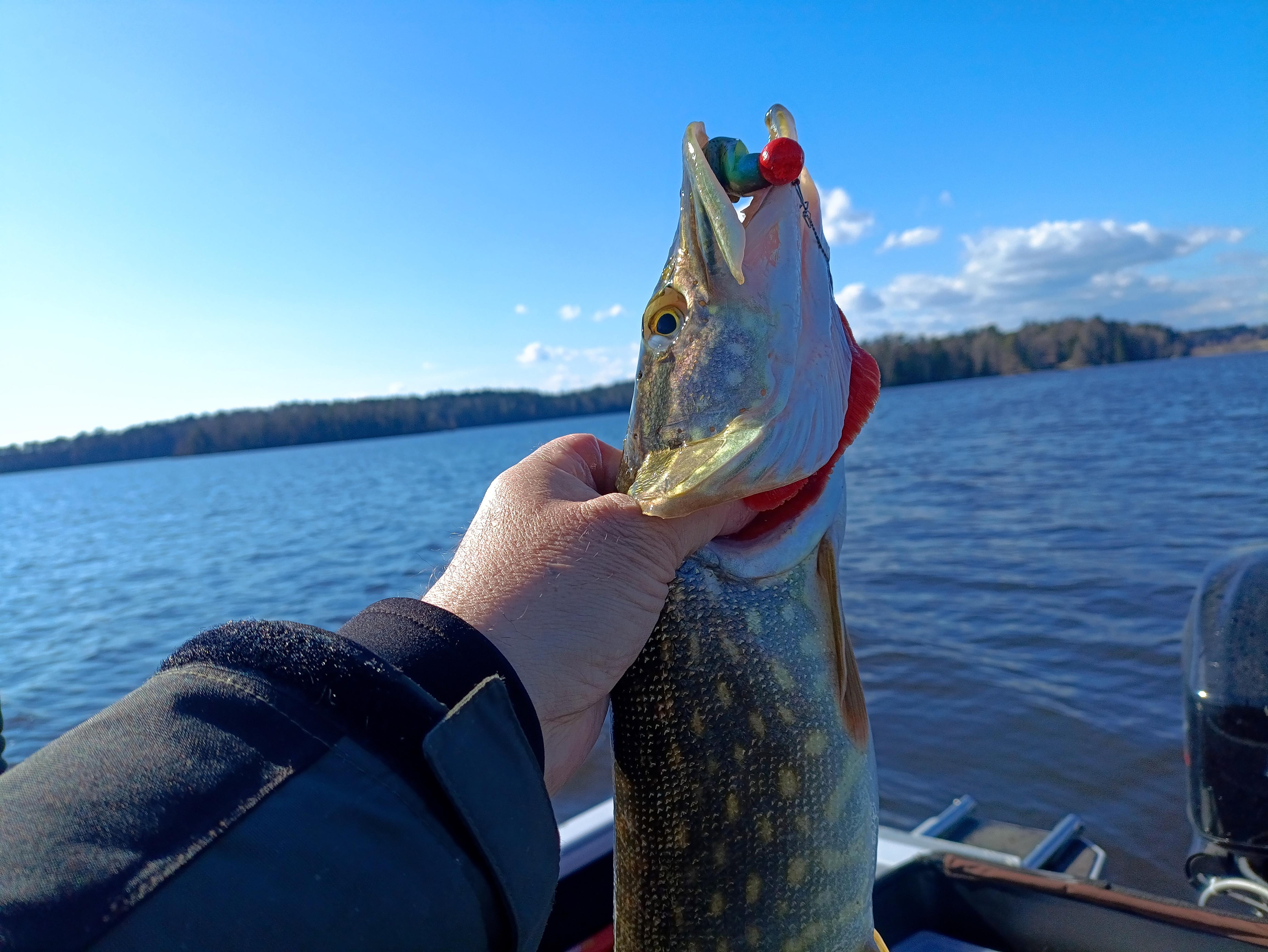 На следующий день как в ванне. Щуку приходилось уговаривать. На двоих с трудом вымучили 7 штук, причём 3 из них было «эстонского» размера ( 54-55см ). Окунь вообще не попадался.