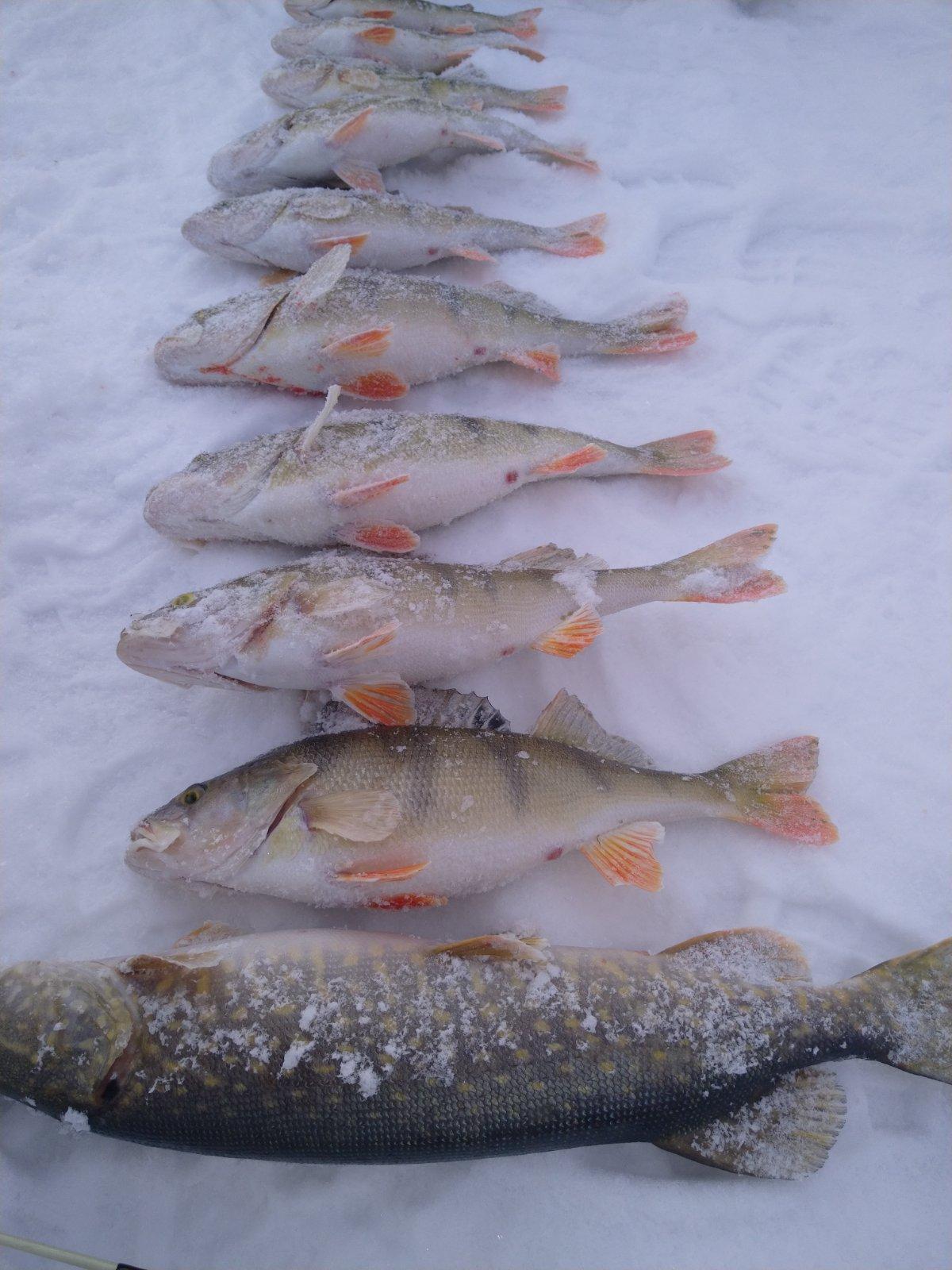 Окушки ( 186 и 200гр ) взяты на жерлицы. Щуки: одна околодвушка, вторая 1580гр. Тоже на жерлицы. Пару недомерков отпущено, много холостых поклёвок ( окунь балуется ). Хорошо, что с утра были свои живцы, в основном на них и ловили. Но они закончились около 15-ти часов, поэтому рыбаки поехали домой.