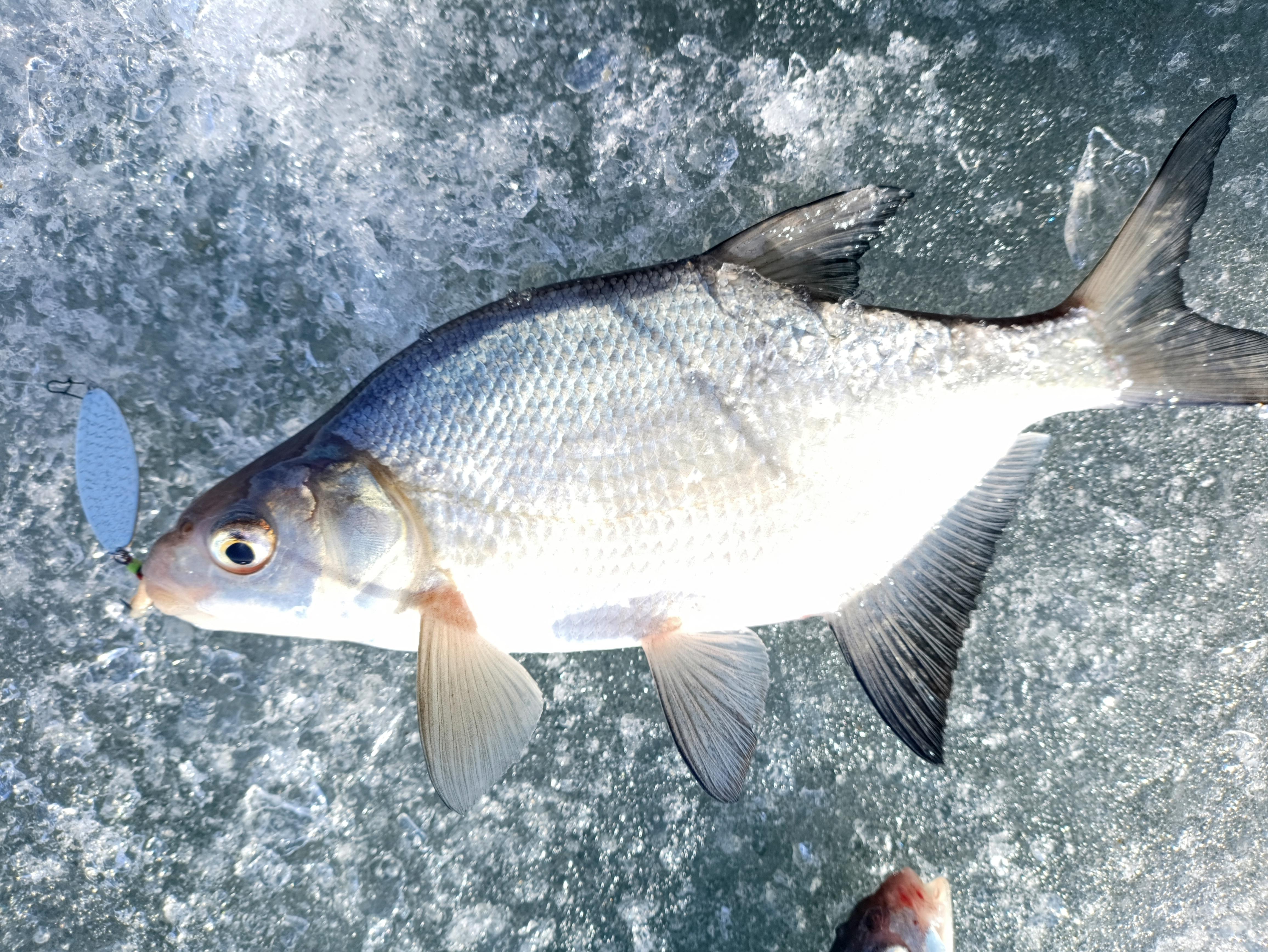 А вот (по ощущению) щупак примерно на 1,5 — 2 кг сожрал кусочек серебра! До лунки я его довёл, а вот когда продольная ось рыбки сраснялась с леской в прямую линию призошёл: