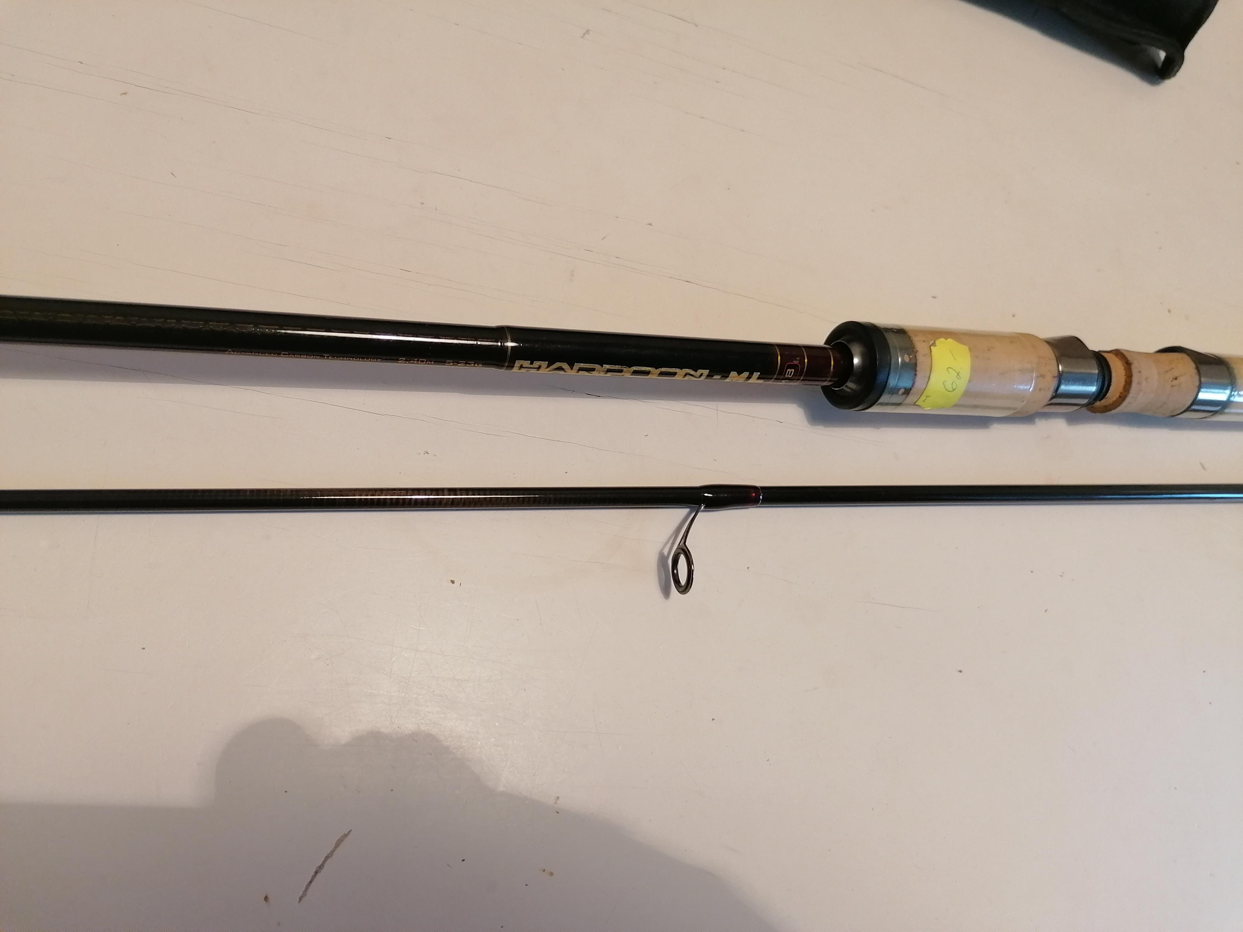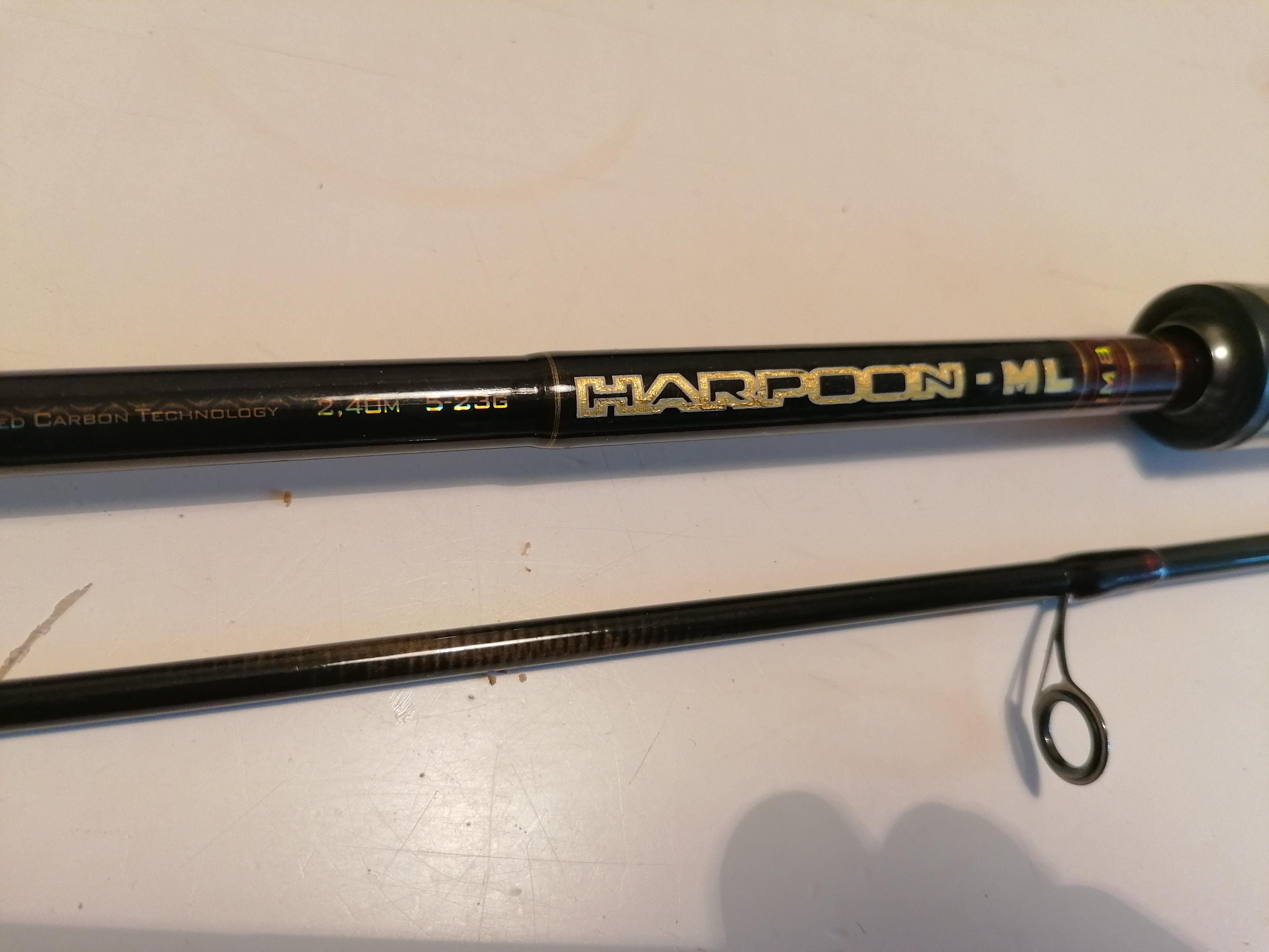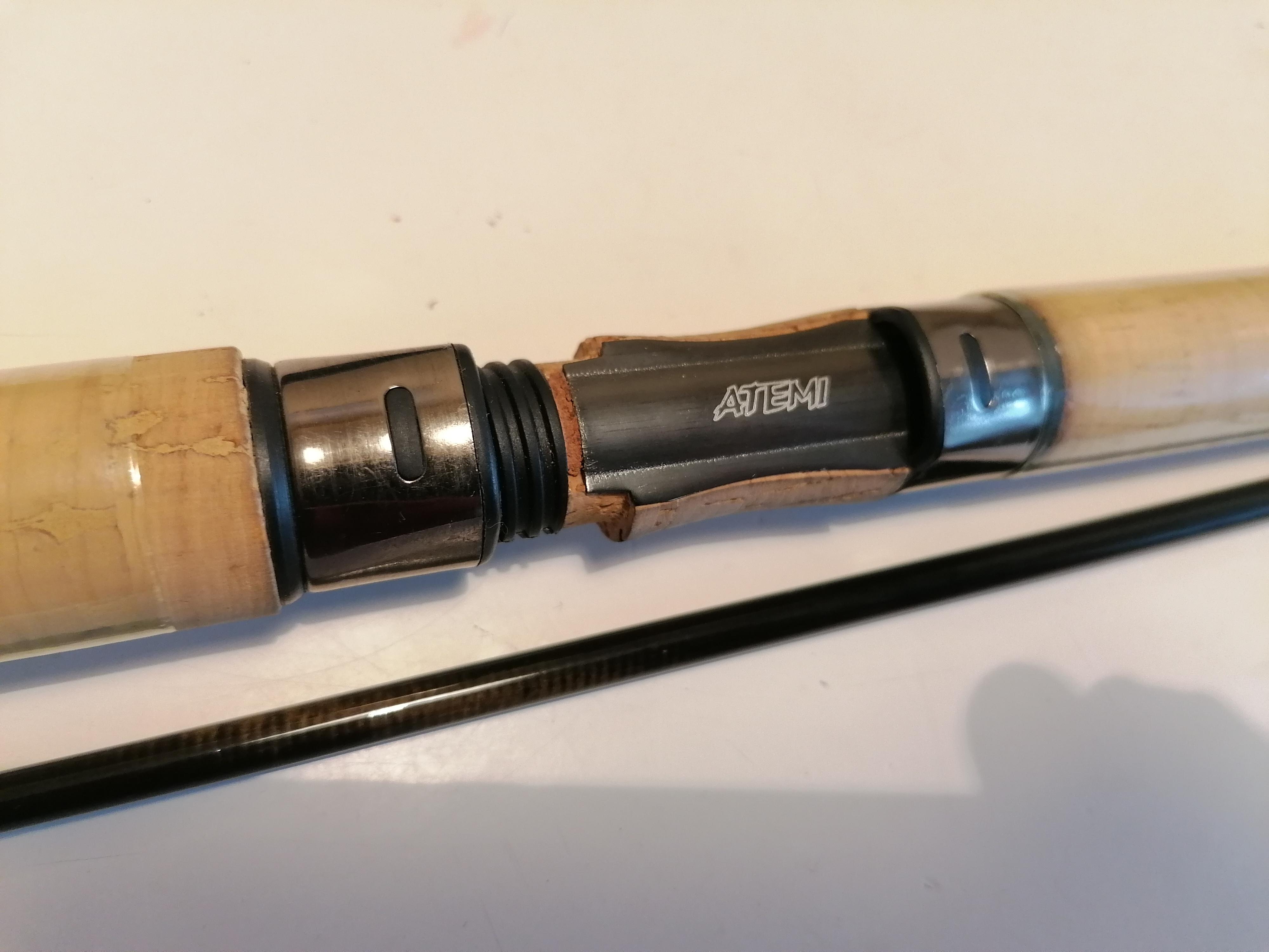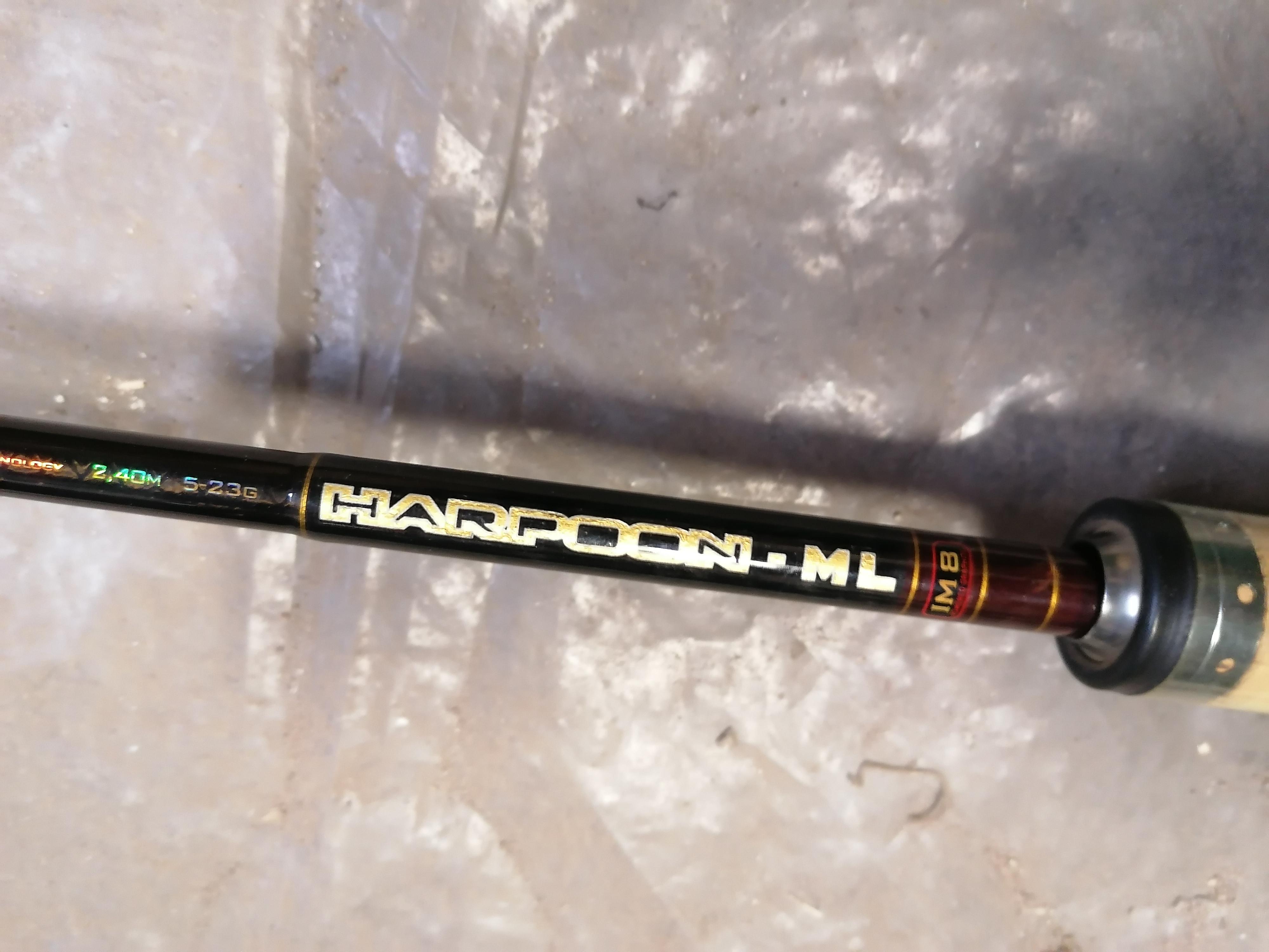 И так…. Atemi Harpoon ML 2.40m., 5-23gr. Довольно старая модель, но очень прочная, из неплохого карбона ИМ 8. ( IM 8 ), не тонкостенная, но, в то же время, не тяжёлая. Кроме красивого дизайна она ещё и весьма функциональная со строем медиум ( типа моего СурФ Мастера Фантома ( который мне ОЧЕНЬ нравится , и которым очень дорожУ ) или Шимано СпидМастер — гибкий, но на треть. НИ В КОЕМ СЛУЧАЕ НЕ «СОПЛЯ»!! ). Будет хорошо бросать и замечательно «вязать» рыбу. Чем то похож на Шимано Катану, но на мой взгляд лучше ( у Катаны с похожим тестом больше «сопливости», бросковые качества у «Гарпуна» лучше, бланк крепче, плюс дизайн красивее. Лучше лежит в руке. К тому же, начальная цена лота намного ниже Катановской . ) Удобный и надёжный катушкодержатель, длинная рукоять ( пробка ).