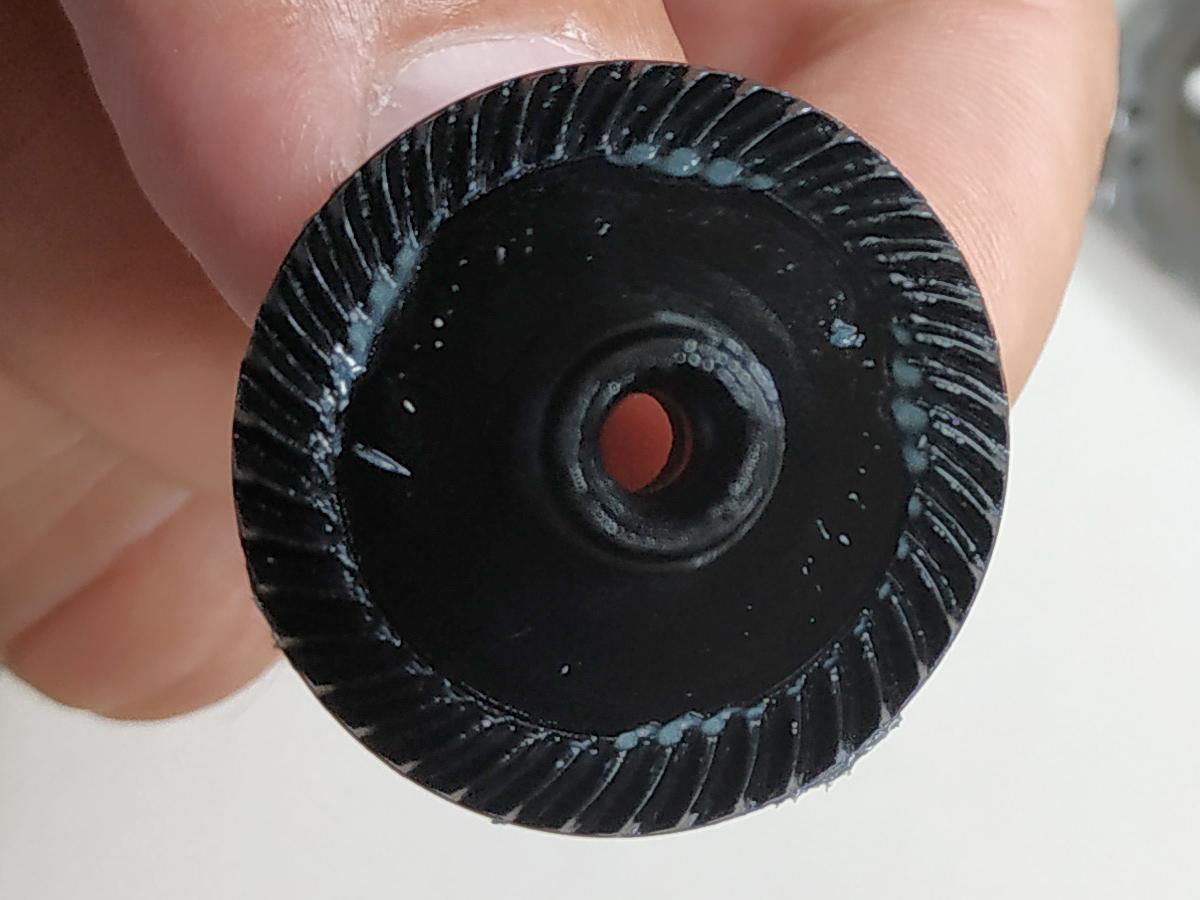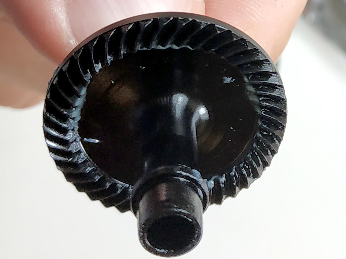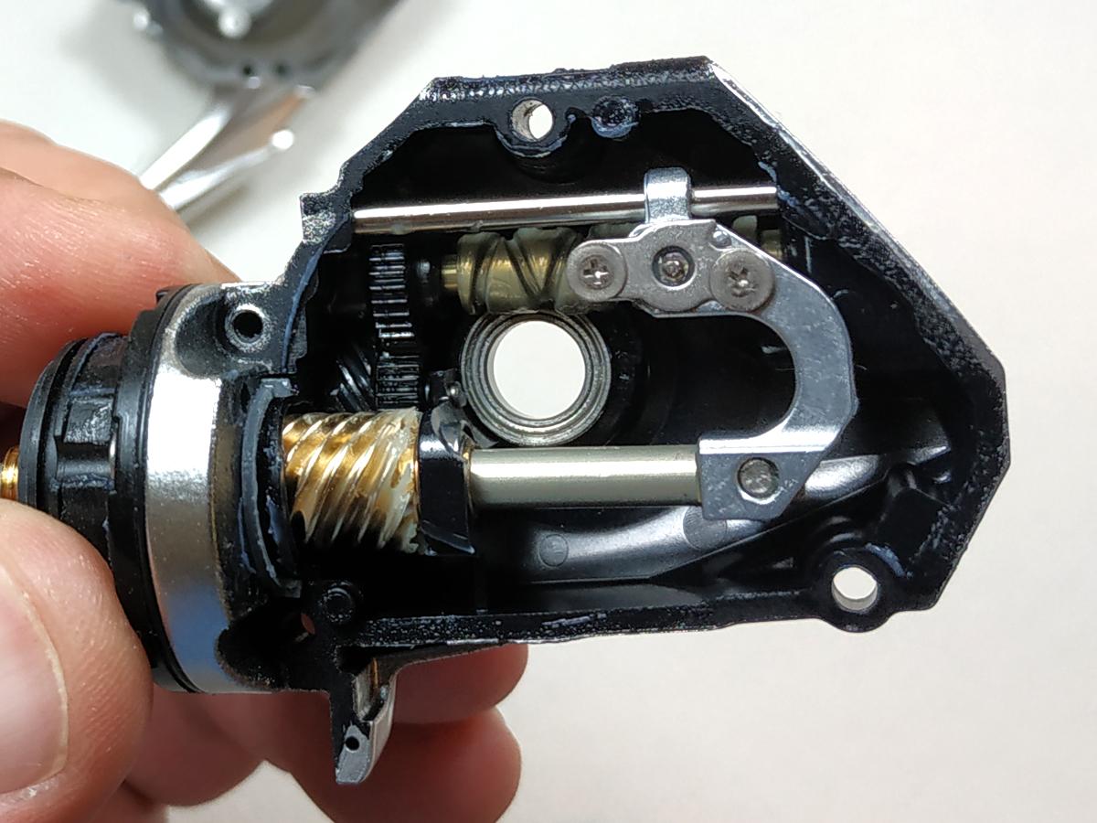 Сняв крышку в задней части корпуса, которая закрывает доступ к бесконечному винту, обнаруживается очередная новинка — фторопластовая втулка задней опоры бесконечника полностью закрытая одной стороны. Раньше сюда ставили обычные втулки и металлический кончик бесконечника при определенных условиях мог постукивать по металлической крышке на корпусе. Теперь эту проблему убрали.
