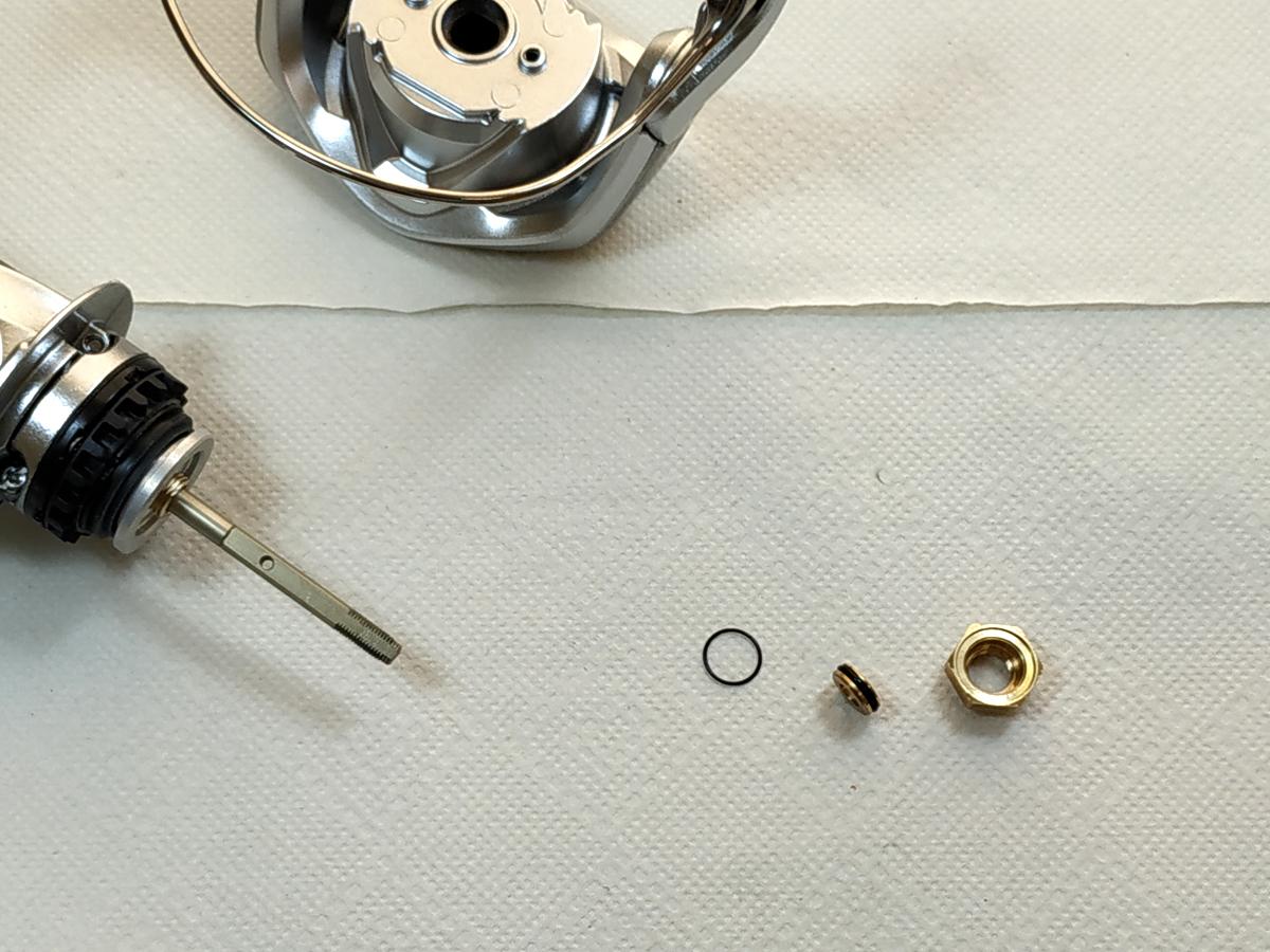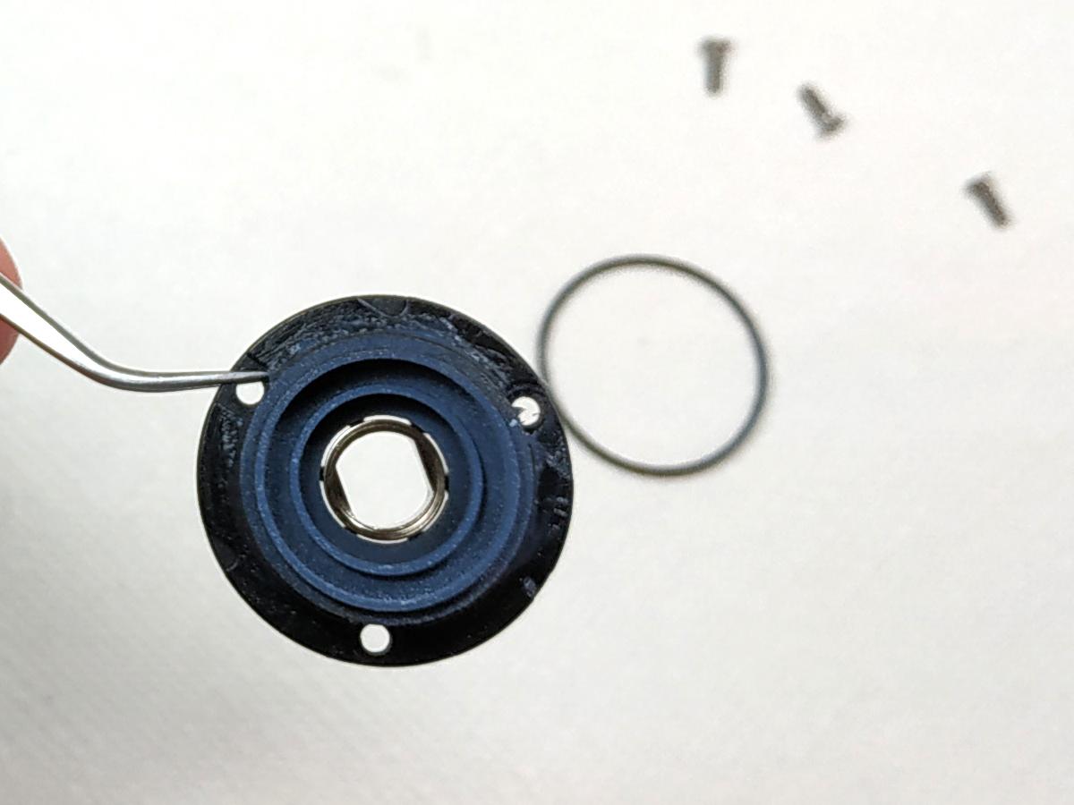 Гайка крепления ротора новая. Внутри неё находится втулка из желтого металла, которая центрирует шток. На втулку одето резиновое кольцо. Предположу, что для снижения шума от вибраций при движении штока. Посадочное место втулки сверху также закрыто резиновым кольцом для защиты от воды.