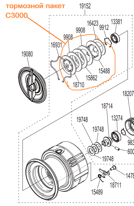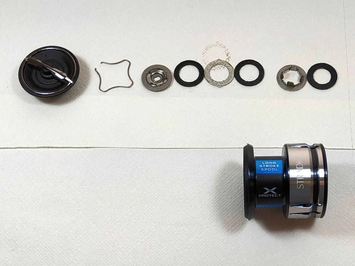 В шпуле видим обычный шимановский тормозной пакет, тормозные диски теперь из карбоновой ткани, вместо обычного войлока. Такие диски рассчитаны на более высокие нагрузки, чем войлочные. Но также надо иметь ввиду, что эти диски ставят не во все Stradic’и — такой пакет имеется в моделях начиная с C3000 и дальше. В меньших размере применяют войлочные диски. В шпулях, где в маркировке имеется “S” применяют войлочные диски.