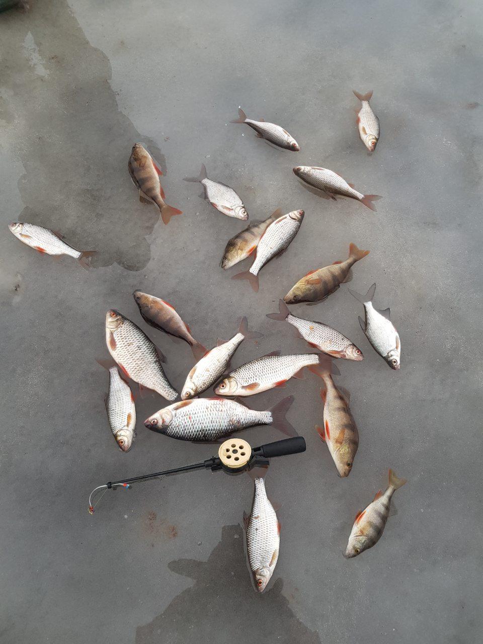 На снимке улов одного рыбака. У его напарника ровно столько же, но окуней чуть побольше, так как он больше уделял внимание не мормышке, а кивалю с балансиром.