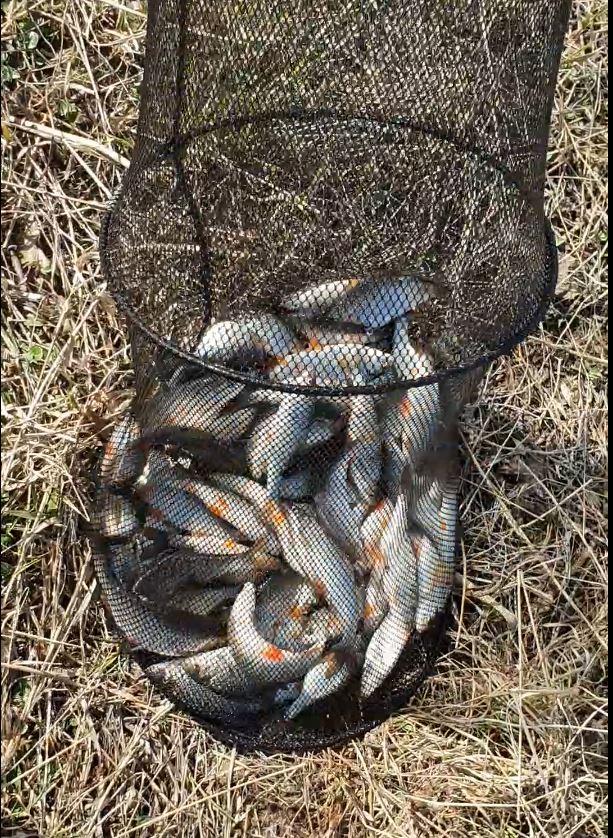 Плотва разная, от 130 до 200+ гр. Собирал в садок ради интереса ( сколько выйдет), но оказалось,что весы забыл дома. На вскидку примерно 6-7 кг.