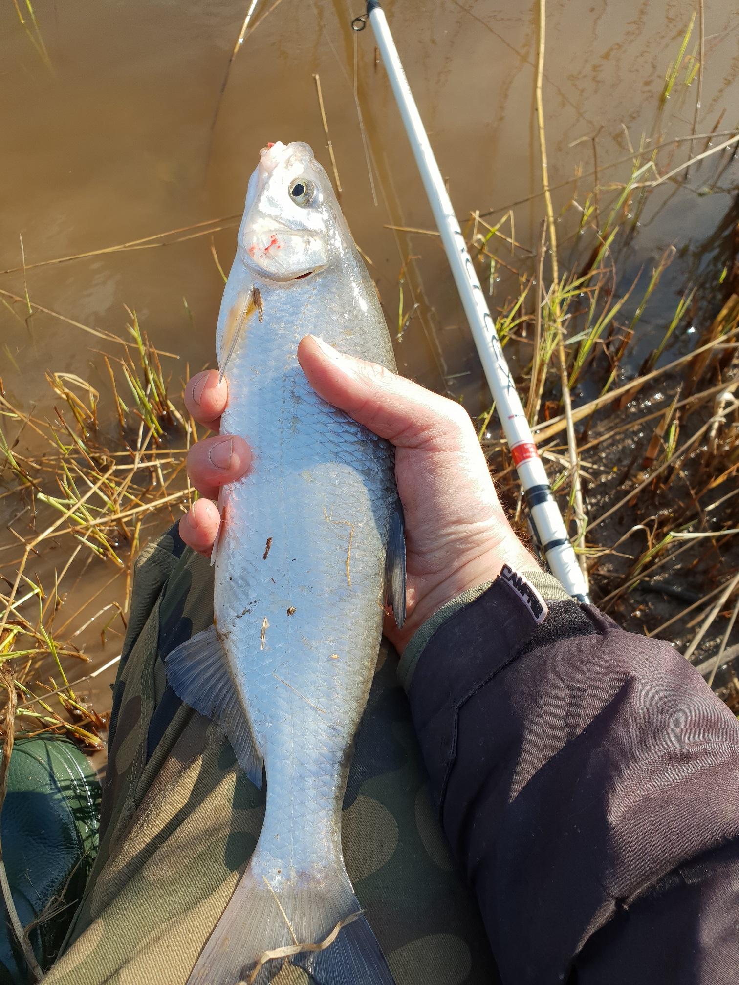 Прошли до известных ям и с первого же заброса поймал плотвину . Некрупная, неморская, но вполне съедобная.