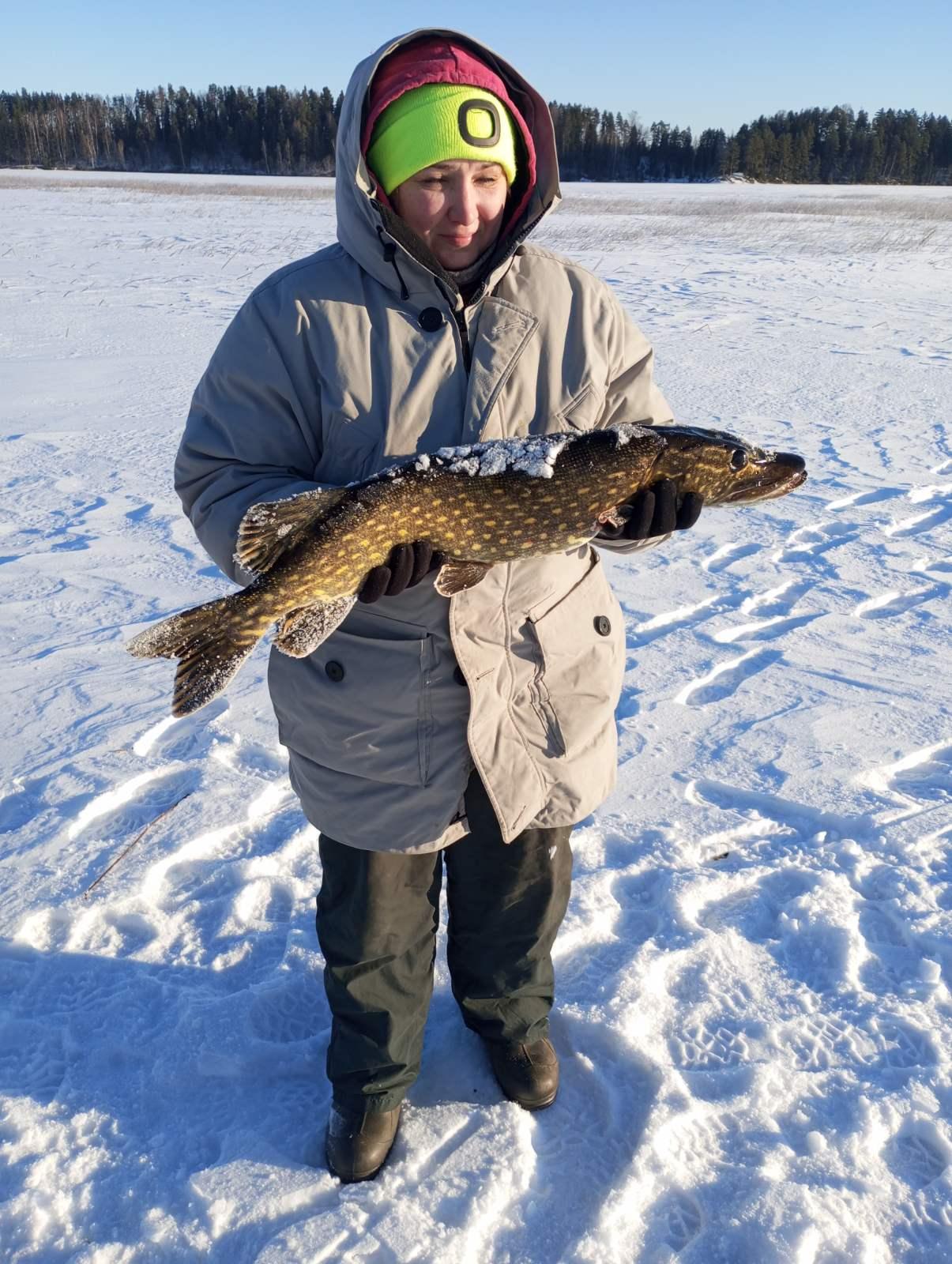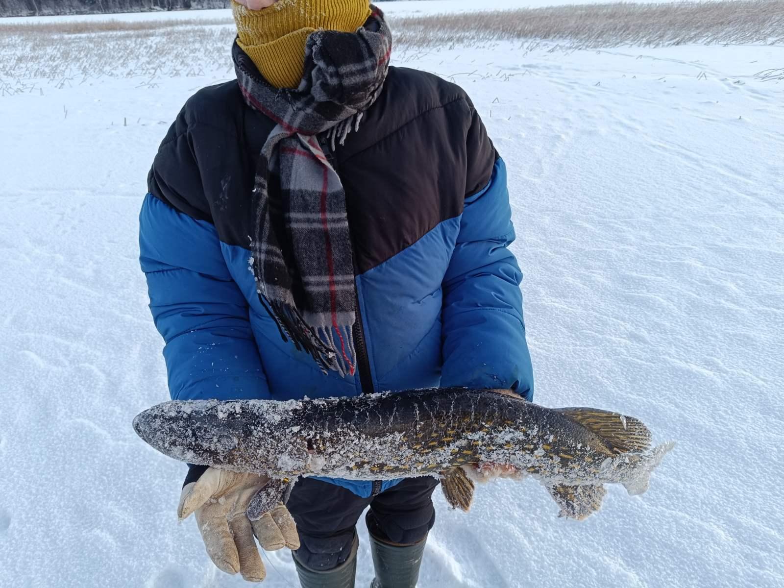 «Привет Максим! У меня проблема с компом, пишу с телефона. Поэтому опубликуй сам, пожалуйста. Сегодня с ( далее следует имя жены — прим. Рыбалинга ) посетили Паункюла. Были в том районе, где ты подсказал. Ну и ,разумеется, со своими живцами приехали, раз ты говоришь, что в канале они очень плохо ловятся. В итоге одна поклёвка, щука 3.200. И тишина. Клюнула через 10 минут после установки. Примерно в 8.30 -8.45.. К лунке подошла спокойно, а выходить не хотела, несколько раз заводили. Уже думали, что не наш день сегодня. но всё получилось. Температура была -18, полная луна, высокое давление. Может по этому больше не было поклёвок. А может они и были, но позже. Но мы ждать не стали , так как не май месяц , да и нам с нашим здоровьем, сам знаешь, простужаться никак нельзя. Поэтому ждём , как потеплеет немножко. Побалансирили чуток и в 11 собрались домой. Воздухом подышали, по снегу побродили, на солнце позагорали, за рыбу подержались. Куча удовольствия и позитива. »