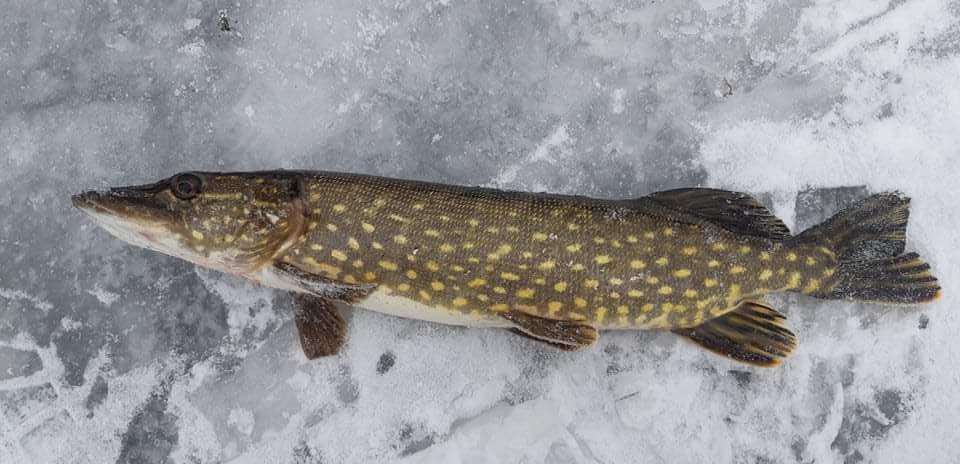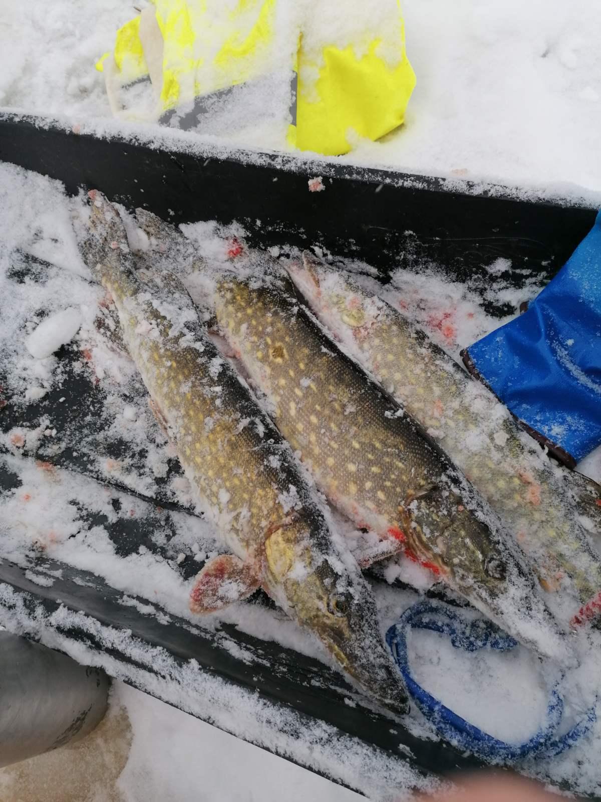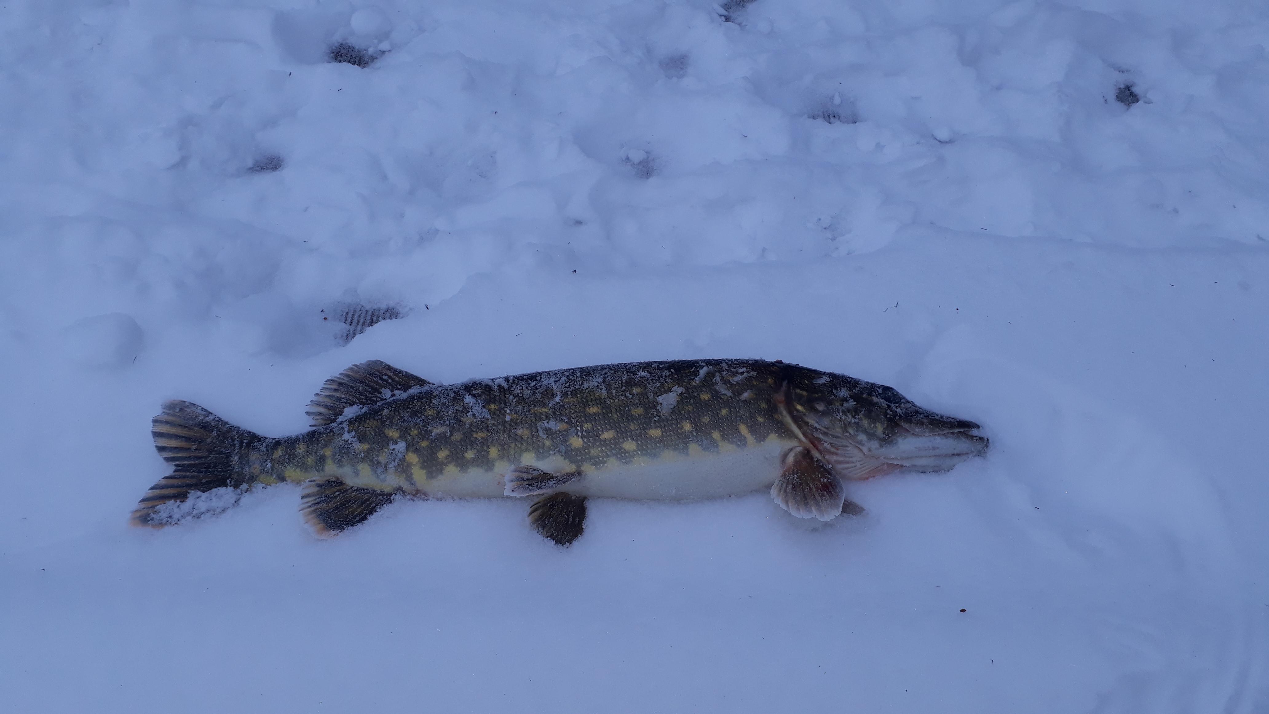 У другого рыбака на балансир сход щуки ( по ощущениям около трёшки ) и вторая , видать, подбагрилась, так как к лунке подошла животом. Боком никак не залезала, до головы не дотянуться. Багор был в санках. Пока мудрили, дёрнулась и всё оборвала. Судя по животу и бочине , была гдето 4-5 кг.