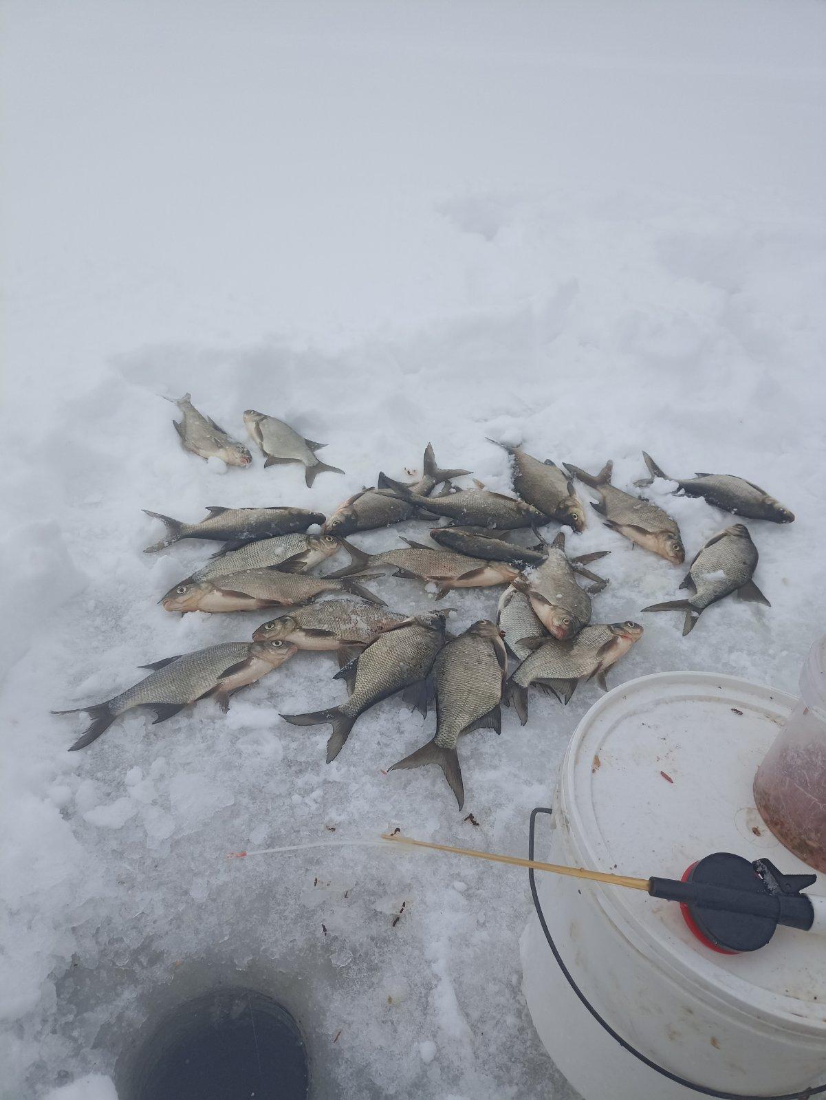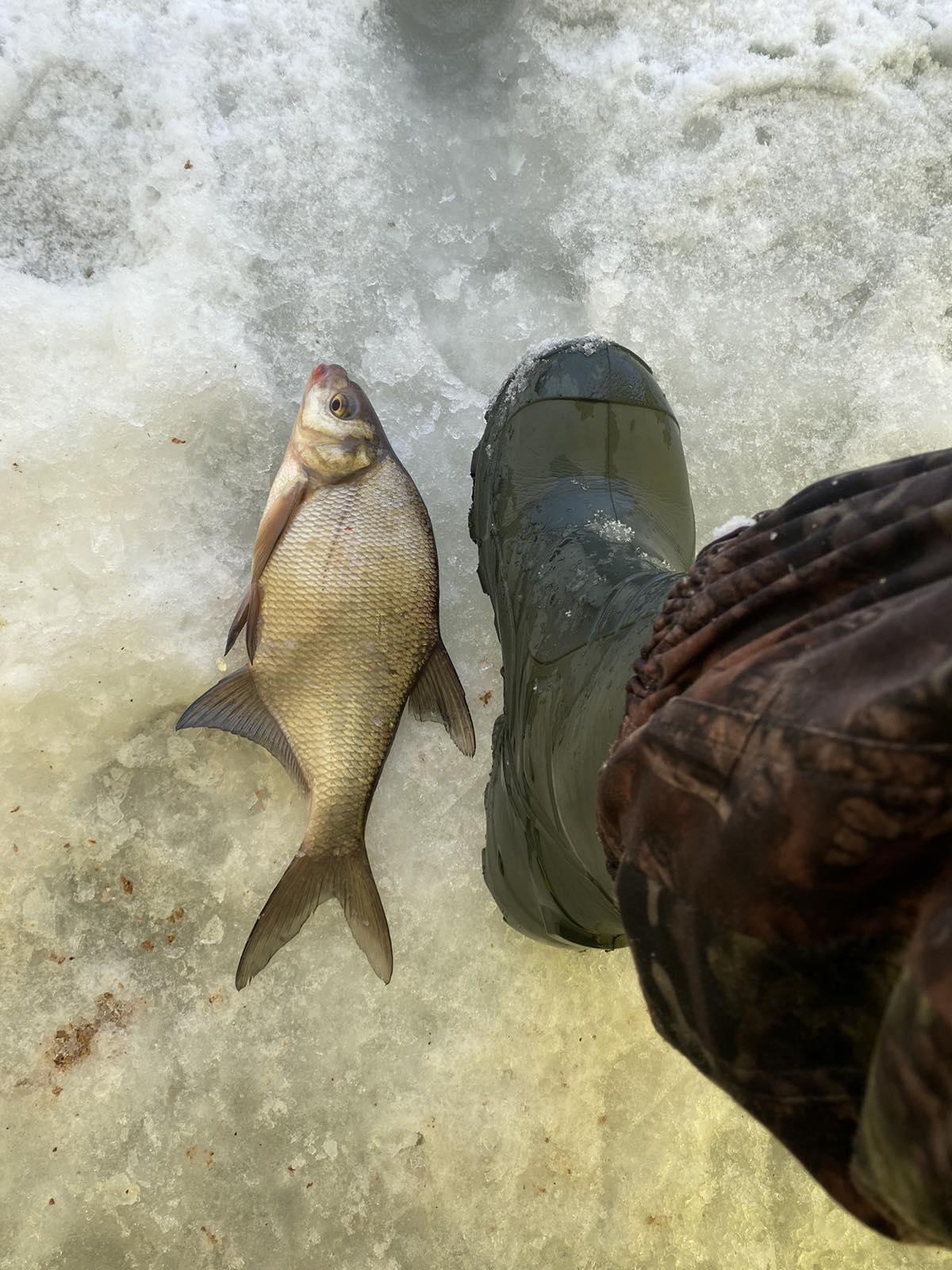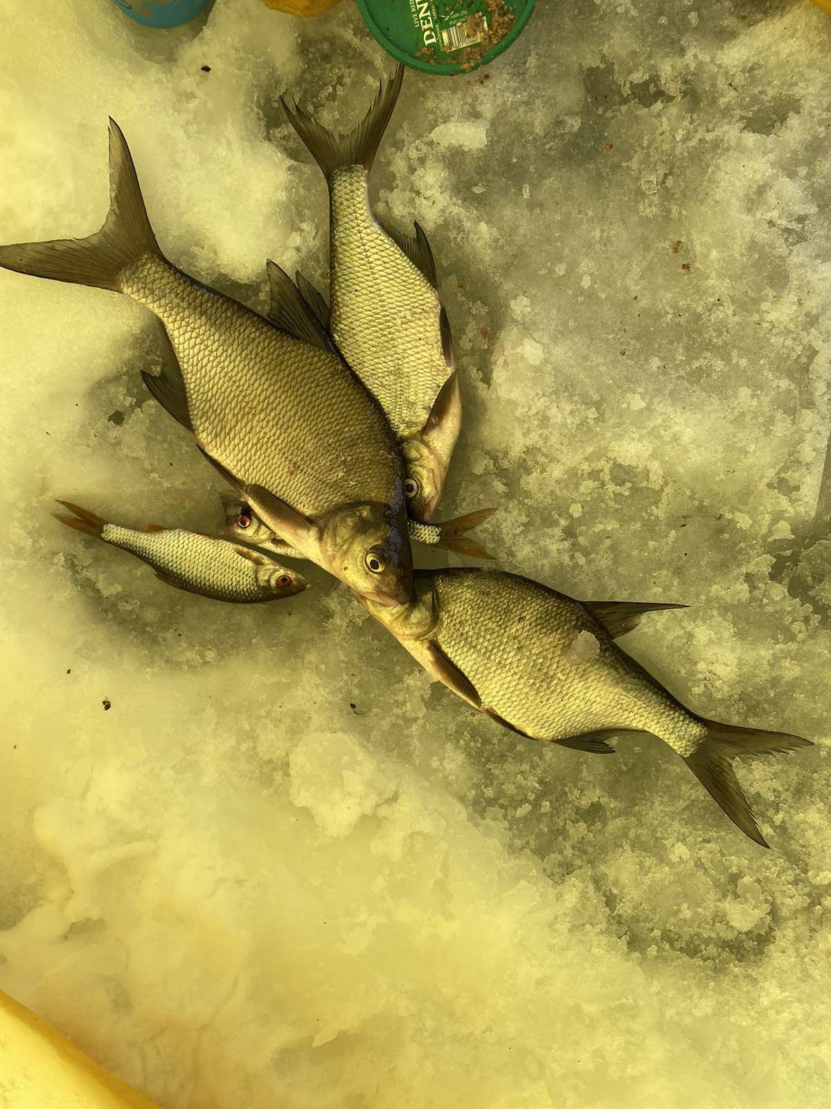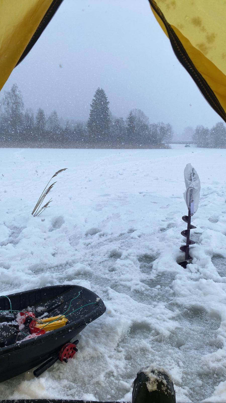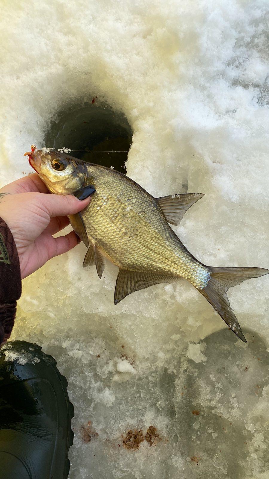 Добралась опять до водоёма.. в этот раз с ученицей ❤️. Погода нифига не радовала, пришлось деда на палатку гопнуть. Засверлились, закормились, примерно в пол воды (~5-6м) наловили плотвичек для зубастой, поставили жерлицы поближе к камышам и стали выпытывать обещаного подлещика. Но пока моя ненаглядная буянила вокруг да около, естественно никакого клева небыло. В итоге малая заявила что голодная и ноги замерзли а дед сказал, что не клюет и собрался домой. Я подсунула малую к нему в машину, помахала им в след и вернулась к временно трофейной палатке. Тишина! 👌 Пока ковырялась в телефоне, прозевала 2 лещевые поклевки на глубине ~10м, мысленно всех послала, сунула телефон в карман и взялась за удочку. Удалось вымучить 3 подлещика и пару плотвичек чуть крупнее живца. И все… тишина. Снегопад пытался задавить меня палаткой но в этот раз безуспешно. Часа полтора еще помучала удочку и сдалась. Жерлицы так и промолчали всю рыбалку 😒. Короче отпустила рыбу, борясь с ветром свернула палатку… ну и всё. За то подышала и с подлещиками поборолась на тонюсенькую лесочку 👌🎣