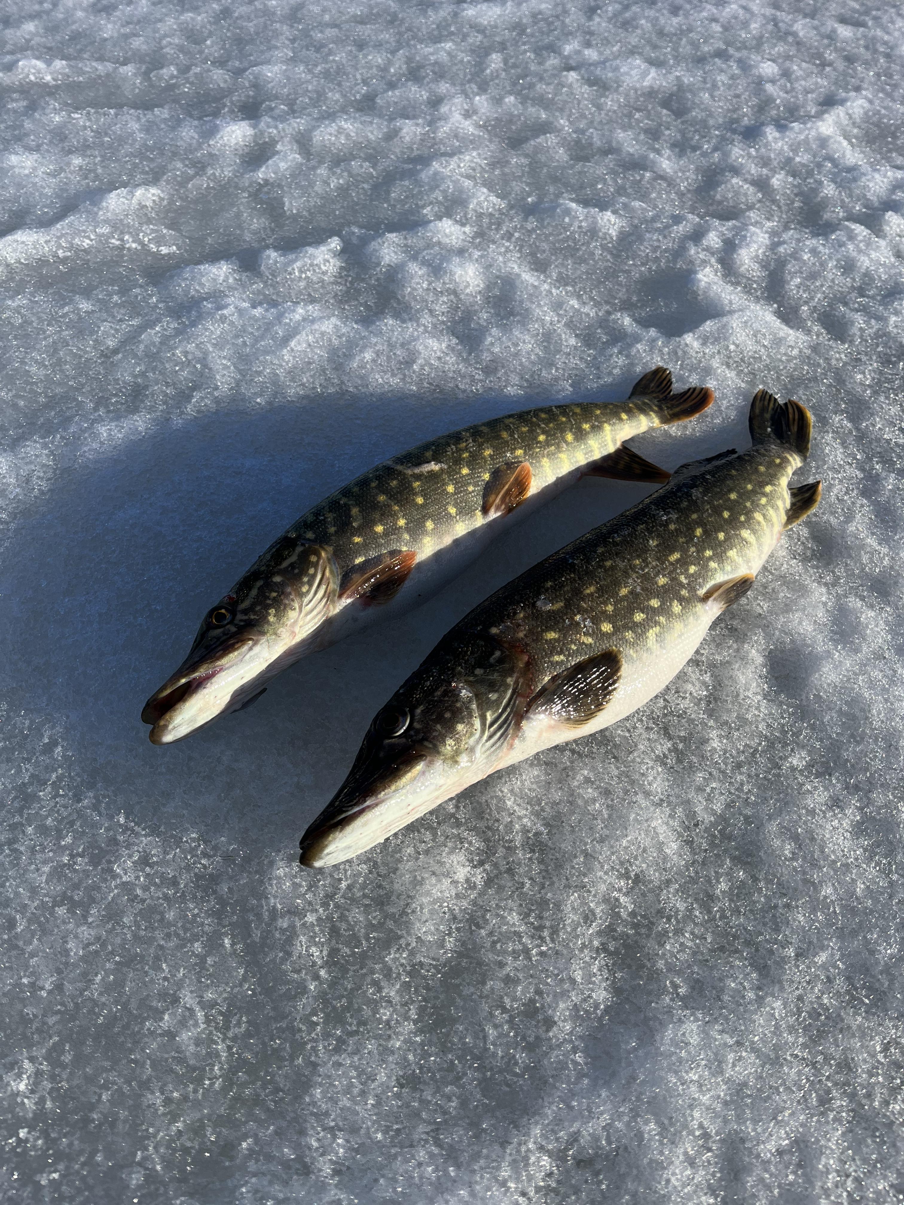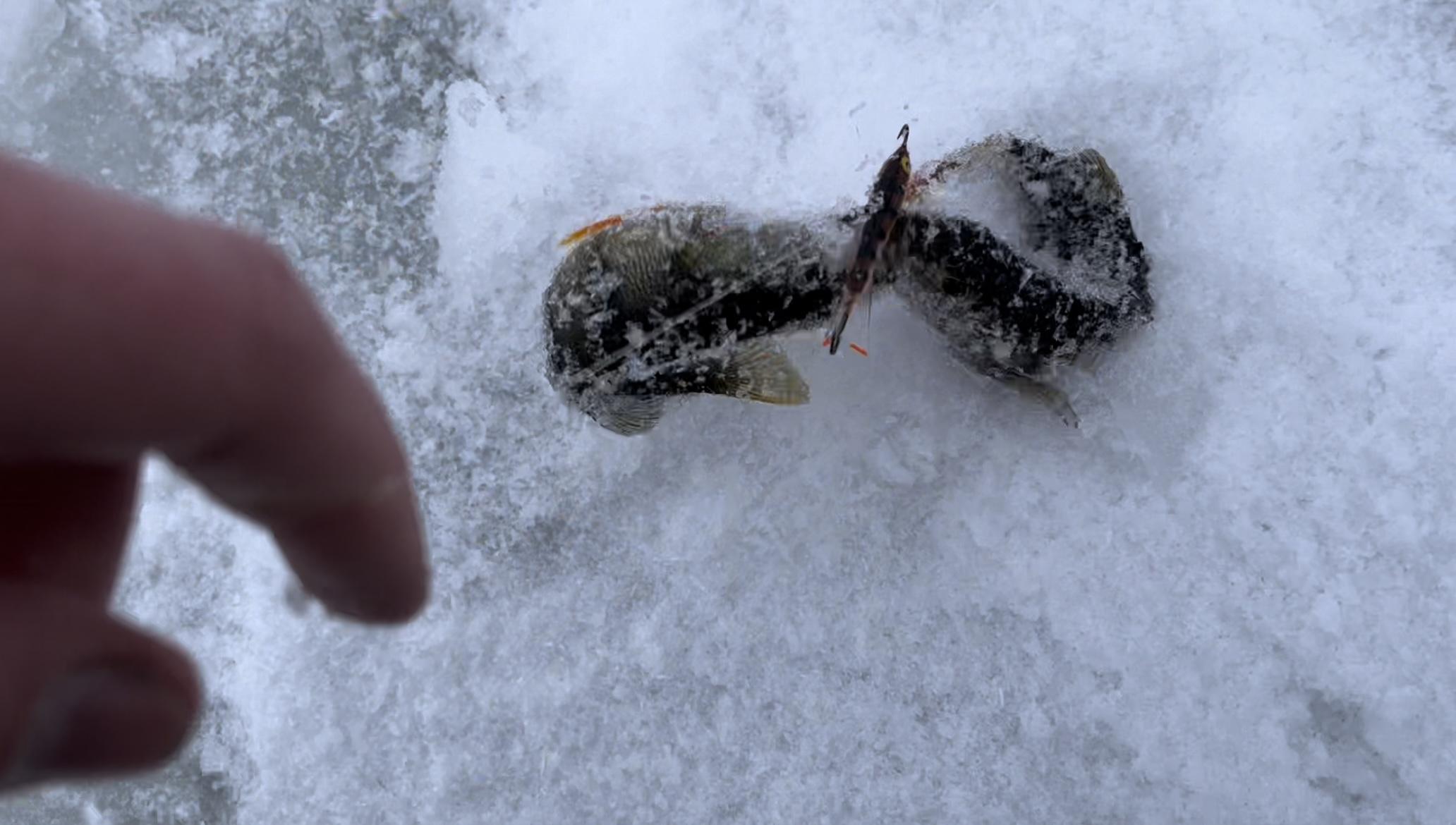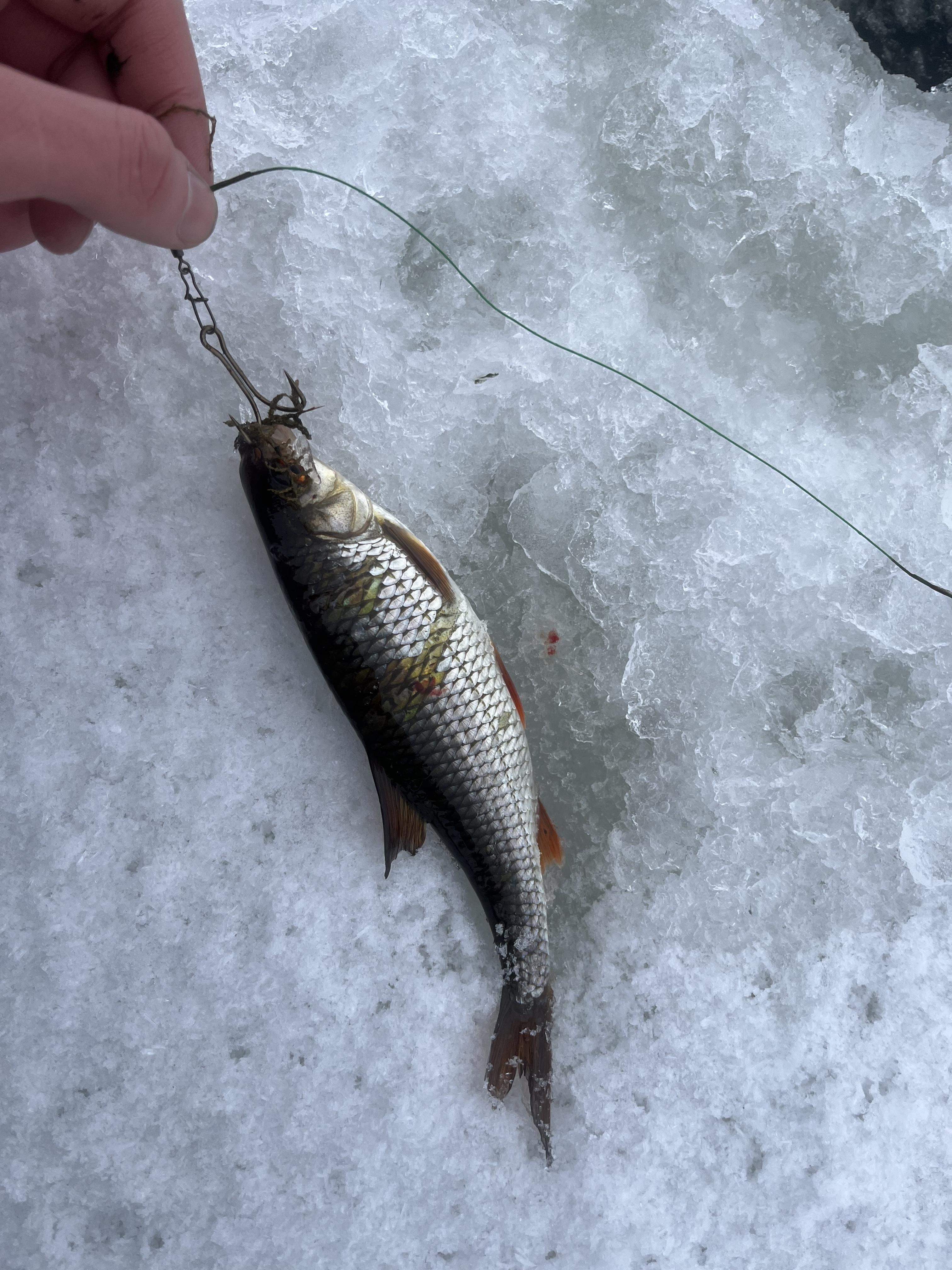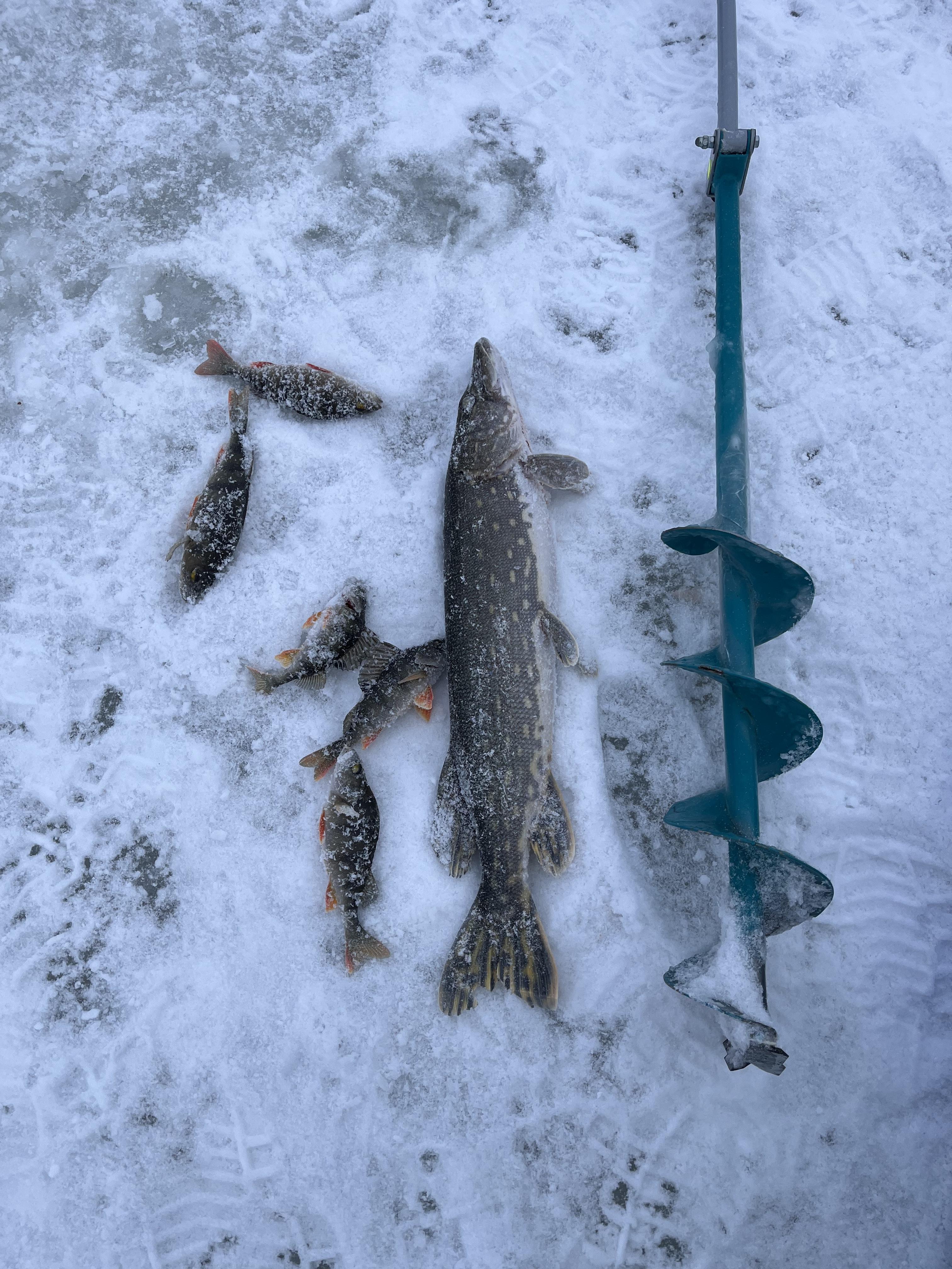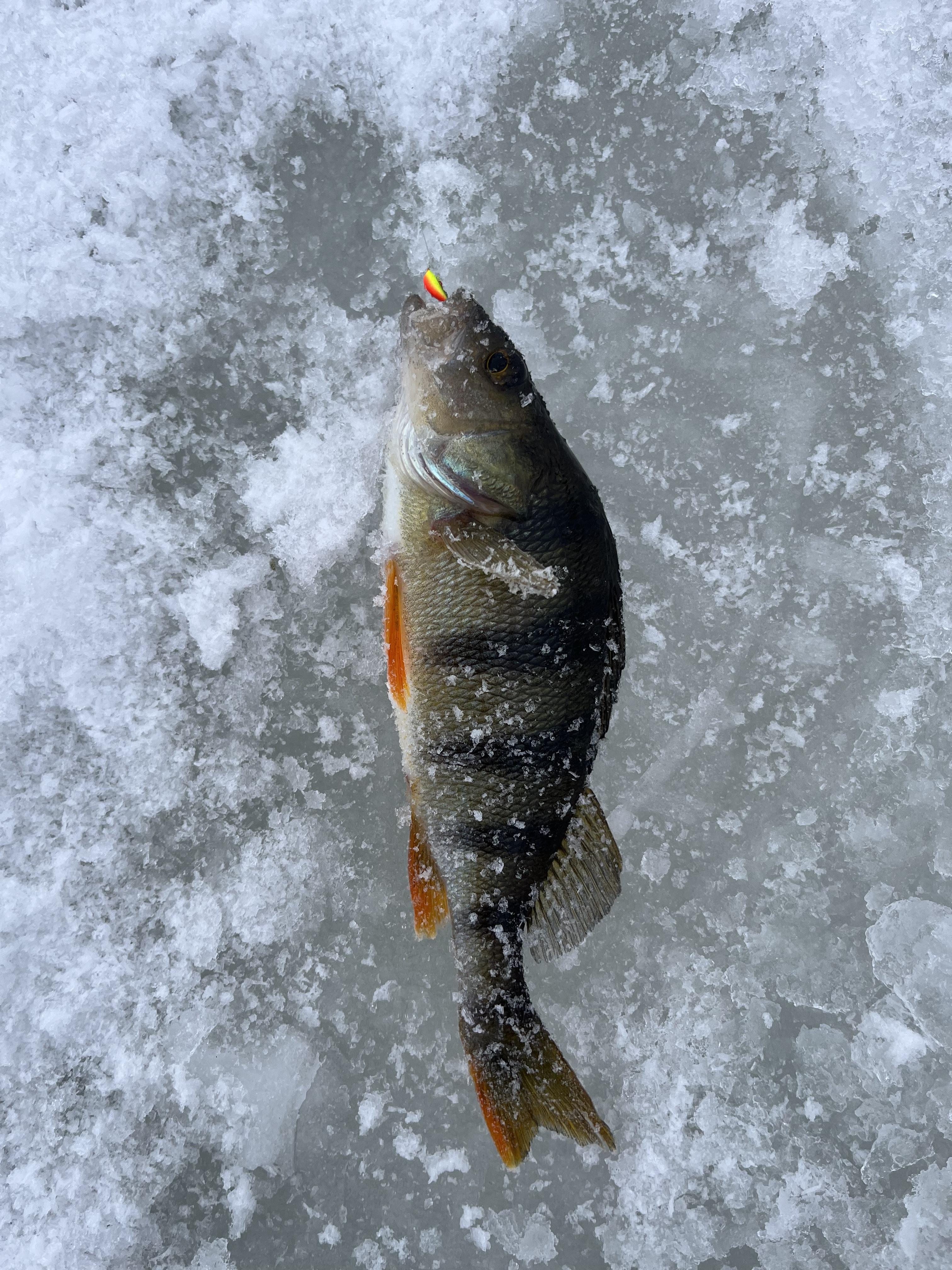 Прибыв на место к пол 9 на озере ещё никого не было. Хороший знак — значит все лучшие места свободны, осталось их только найти 😁 Стал активно буриться, кормиться и вот спустя полтора часа времени и десяток другой лунок первая рыба была поймана. Нано-окунь тут же отправился на лакомство щуке, как и не нано-плотва, пойманная вслед за нано-окунем)