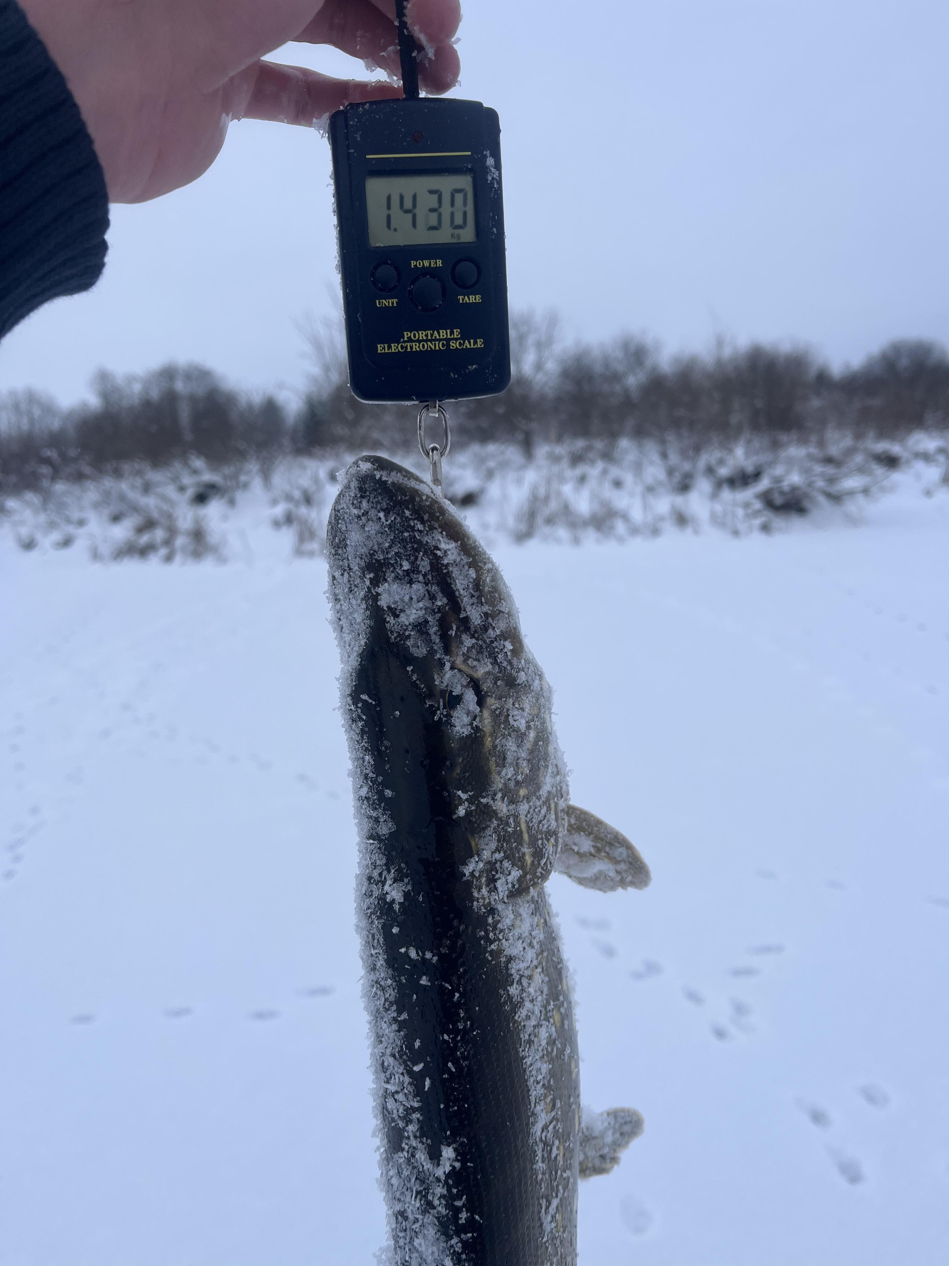 Ну ничего страшного, зарядил по новой и пошёл дальше развлекаться на матросиках)) Через минут 20 опять флажок, но уже на окунька и на меляке в траве( глубина метр от силы, а то и меньше), в отличие от плотвы, что стояла на глубине метра 2. Уже с багориком 😂 пошёл проверять, подхожу, а там разматывает, да активно так, почти все вымотала. Ждать не стал и подсёк сразу. И ловкими( надеюсь)) движениями рук щупачок оказался на льду. Сперва показалась около двушкой, уж сильно упитанная и сильная) но взвешивание показало кило четыреста