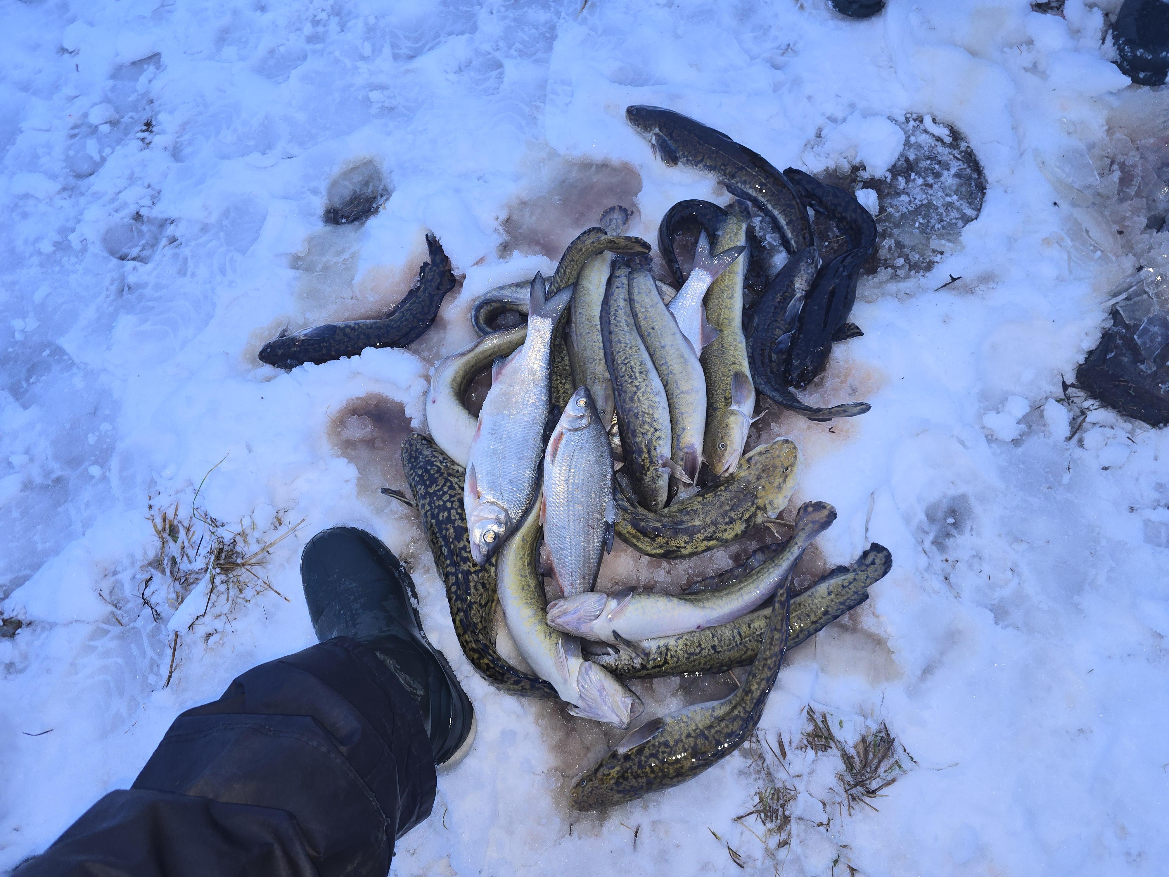 Рыбак ловил с 15 до половины второго ночи. В улове 2 весьма неплохих вимбы ( 37-38см ), 6 мерных налимов. Семеро из немерной налимной братвы плавают дальше.Игоря БЛАГОДАРЮ за информацию !!