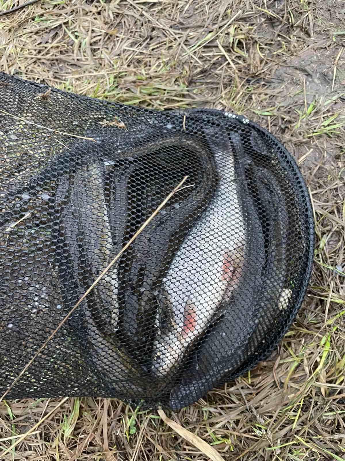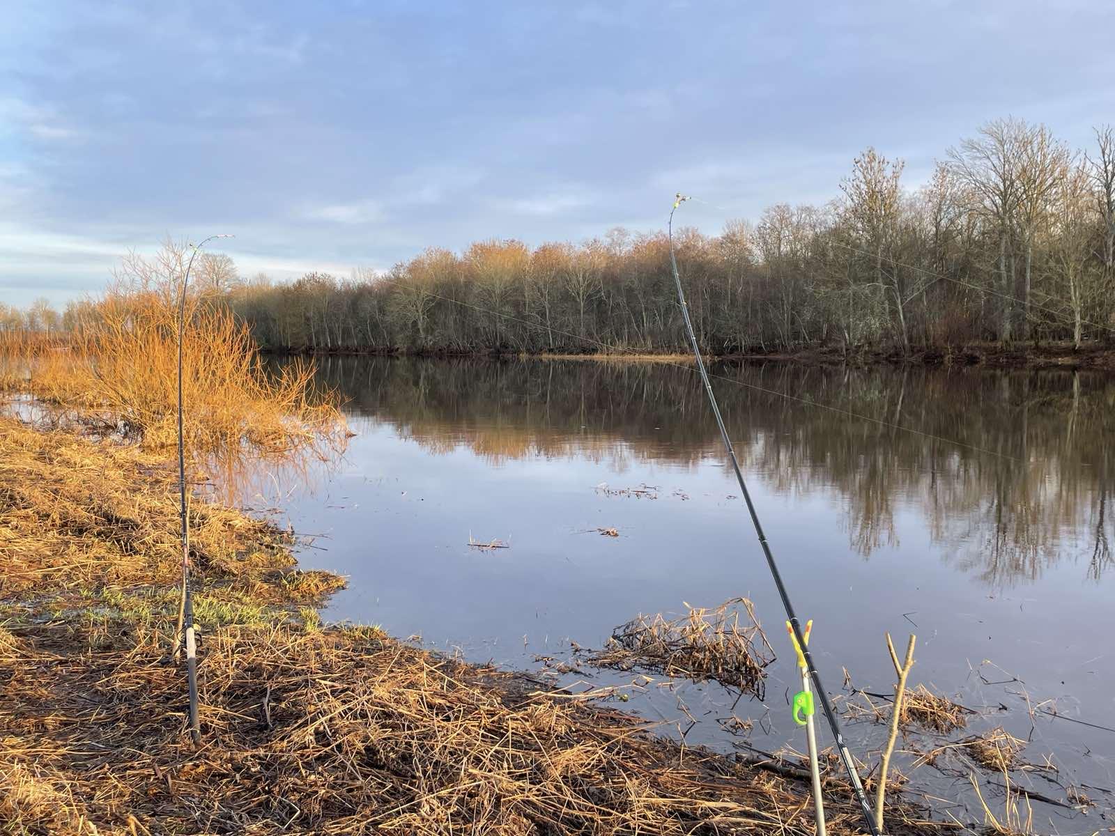Ночью продолжало нести мусор, брёвна, кусты, пучки травы. Дважды фидеры чуть не унесло. Но с клёвом всё в порядке. Есть рыба.