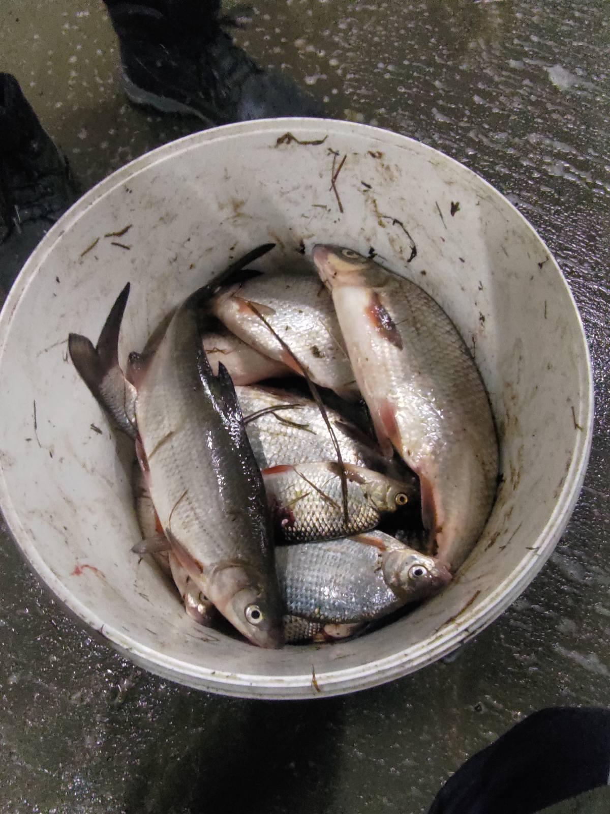 В таком настроении просидели всю ночь. Но ночью грустно. Два налима и одна вимба. Вимб всего 4 шт. Зато Плотвы ведро 20 л под завязку 😅. Можно было больше, но куда столько.