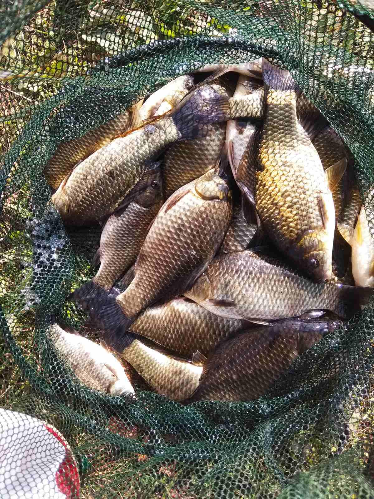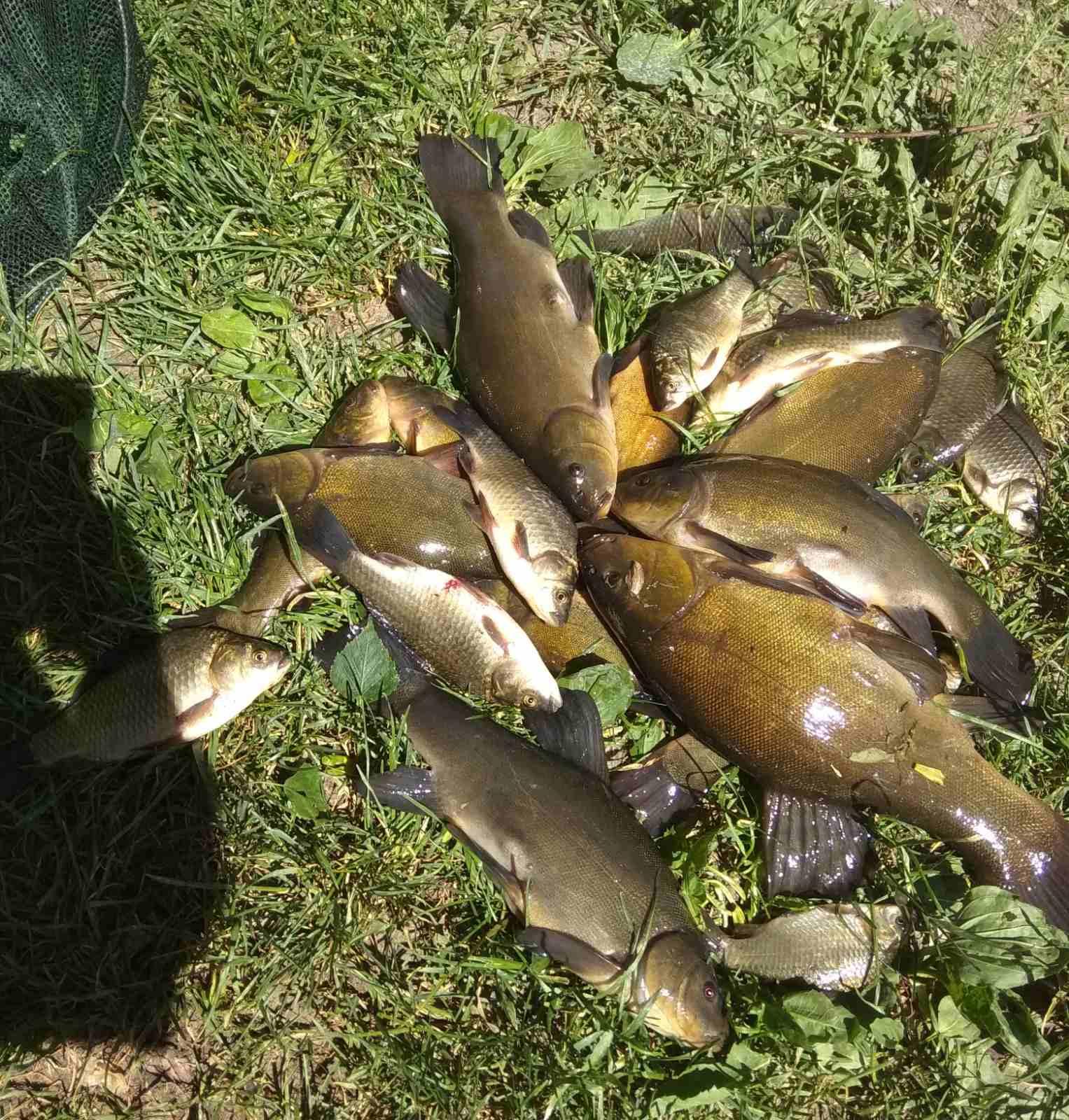 Караси 27 штук. Лини 15 штук ( 6 отпущено ). Всё на удочку. При чём можно ловить как с лодки, так и с берега.