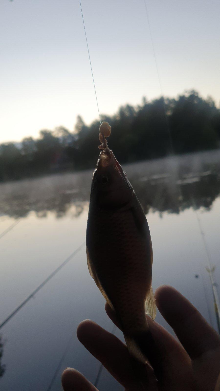 Замесились поздно, уже смеркалось. В 21.25 Паша поймал мелкого линька ( сэмов так 25 ), а Серёга чуть позже на свою болонку выцепил карасика.