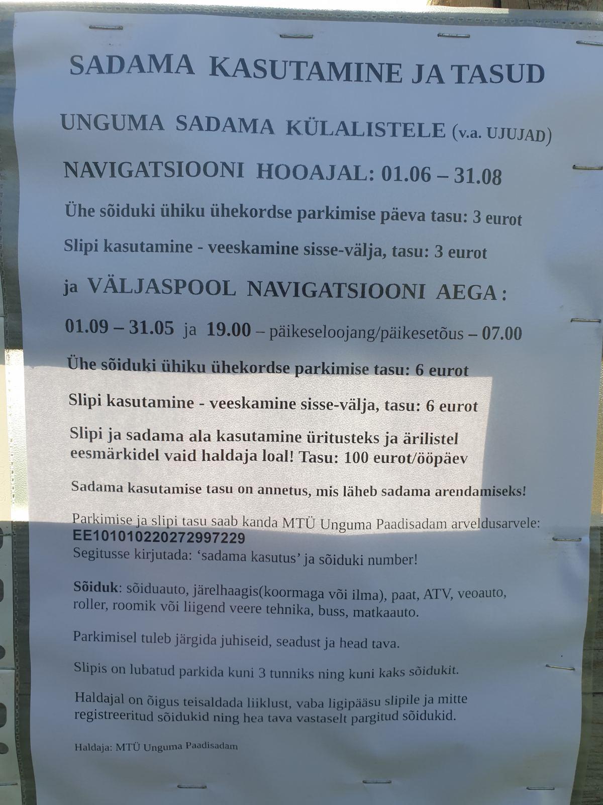 klymbaУчастникНасчёт Unguma sadam, вопрос интересный. Территория порта закрыта, лодки мы скидываем получается в камышах а не в порту. Парковку используем перед портом а не внутри. Если откроют порт с хорошим слипом, то можно и заплатить. А так, даже не знаю. Где можно узнать, где начинается территория порта?