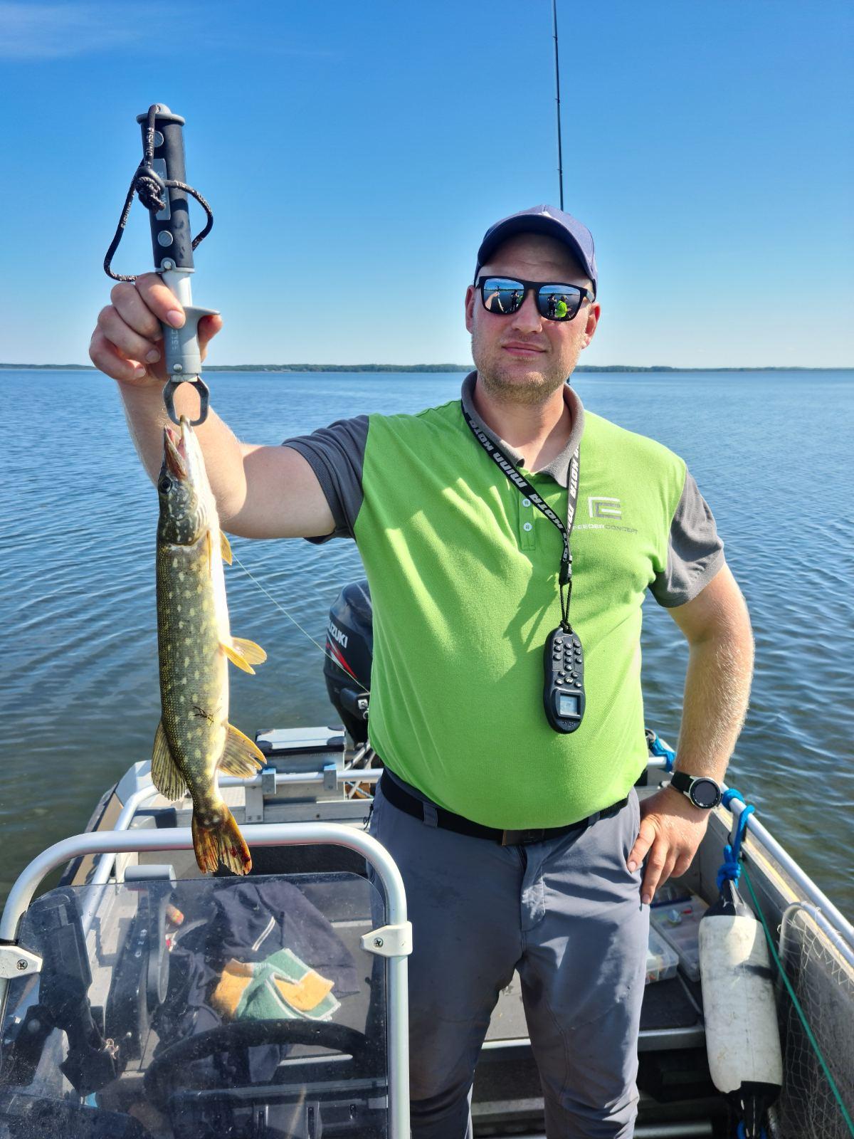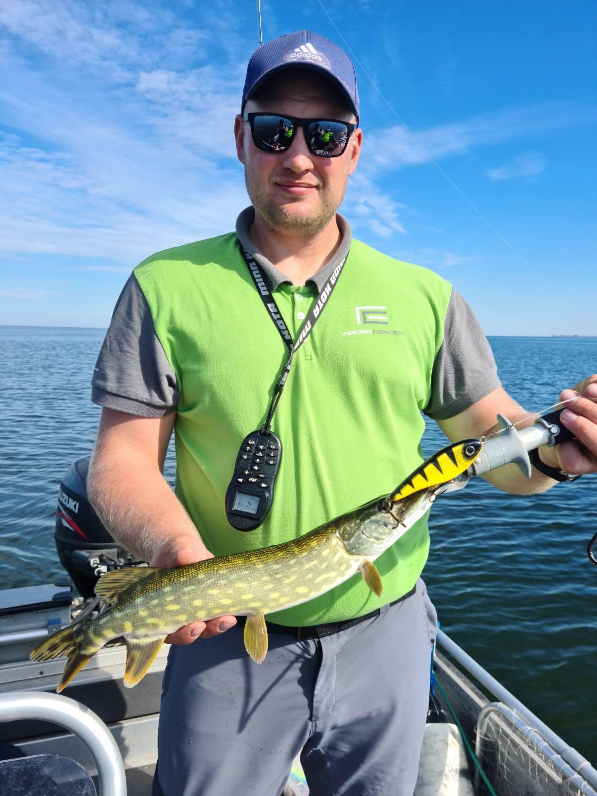 С его слов, взял три щуки. Все примерно такого размера, как на фото. ( Для начинающего, да ещё и на Кюбике — очень неплохо.)