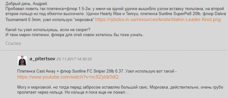 В этом узле плетня обвивает флюр и есть пара-тройка узелков из плетни, которые как бы могут «грохотать», но это ничто по сравнению с узелком из флюра. Флюр остается прямым и никак не препятствует прохождению сквозь кольца. Прочность узла.. — ну если внимательно посмотреть видео, почитать под ним описание, то становится понятно, что его применяют на морской рыбалке в Австралии, ну а там в море слегка другие рыбы, чем наша счука. И если раскопать в интернете диалог с картинки, то станет понятно, где Питерцов его применил и чего это я к нему пристал с распросами. :)