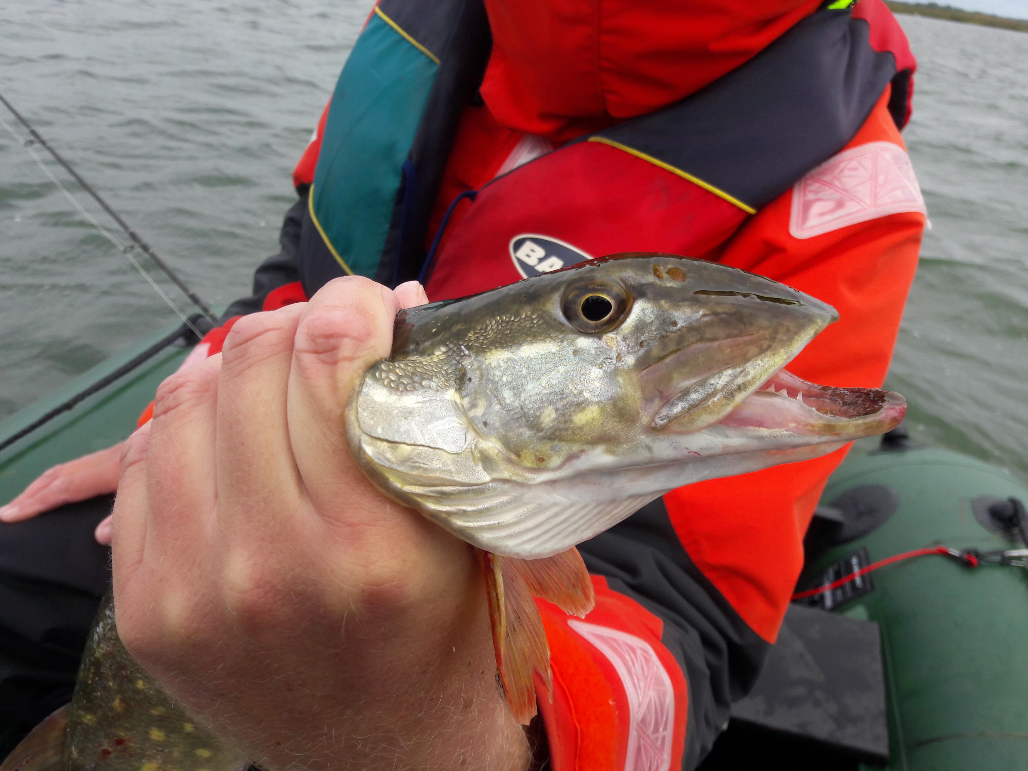 Затем через минут 15 щука ещё трижды атаковала эту приманку: два раза промахнулась ( ну, волна как никак, воробей прыгает ), а третий ушла, наколовшись.К тому времени к дождю, ветру и волнам мы уже как то привыкли и решили выйти на глубину, где я на сукре поимел 2 поклёвки и вытащил одного шнурка.
