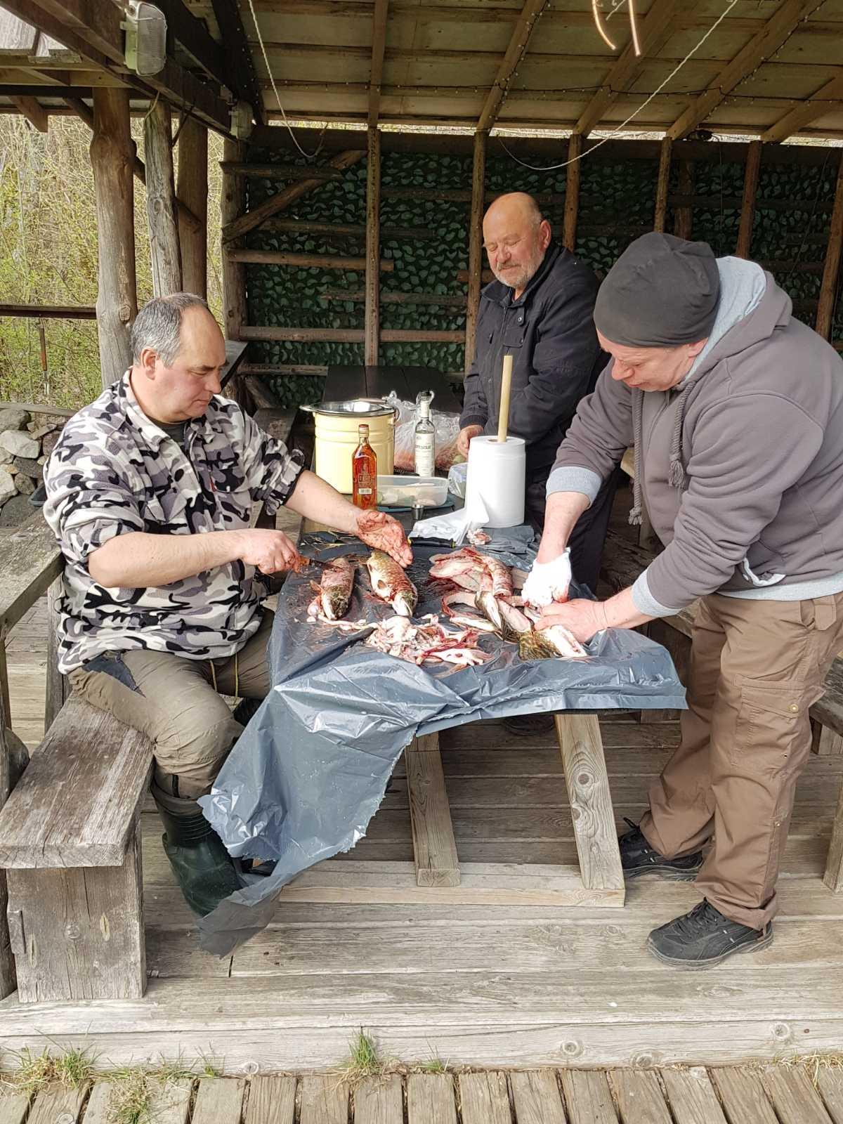 Поэтому, здесь важна ни столько сама чистка рыбы, сколько «дипломатические» кульбиты и согласования с владельцами базы. )Итак, прошло минут 20-30 , «добро» получено, и начинаем чистить рыбу. Обычно этим занимаюсь я. Алексей на подхвате ( жабры долой, рыбу помыть и прочее ). Если есть группа поддержки ,она чистит картошку, морковку, лук и т.д. Нет группы, опять таки , это делаю я. Так как в этот раз рыбы было много, допработа легла на плечи Татьяны Kajur и Алексея.