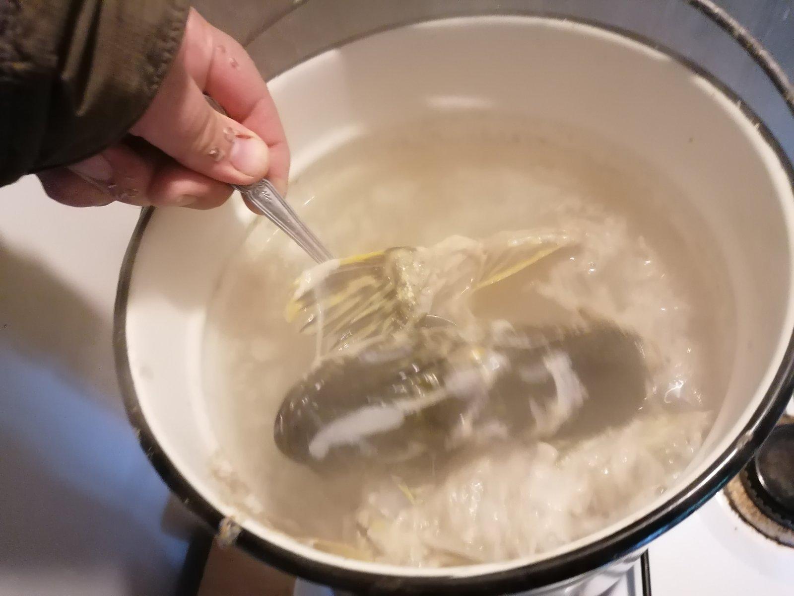 На 5-6 литров воды у нас пошло 7 щучьих голов, 3 хребта с плавниками и хвостами и четыре полноценные тушки ( т.е. целиковая рыба без головы, но с хребтом и хвостом ). Доп ингредиенты СЕЙЧАС нас не интересуют, потому что речь пойдёт о наваре.