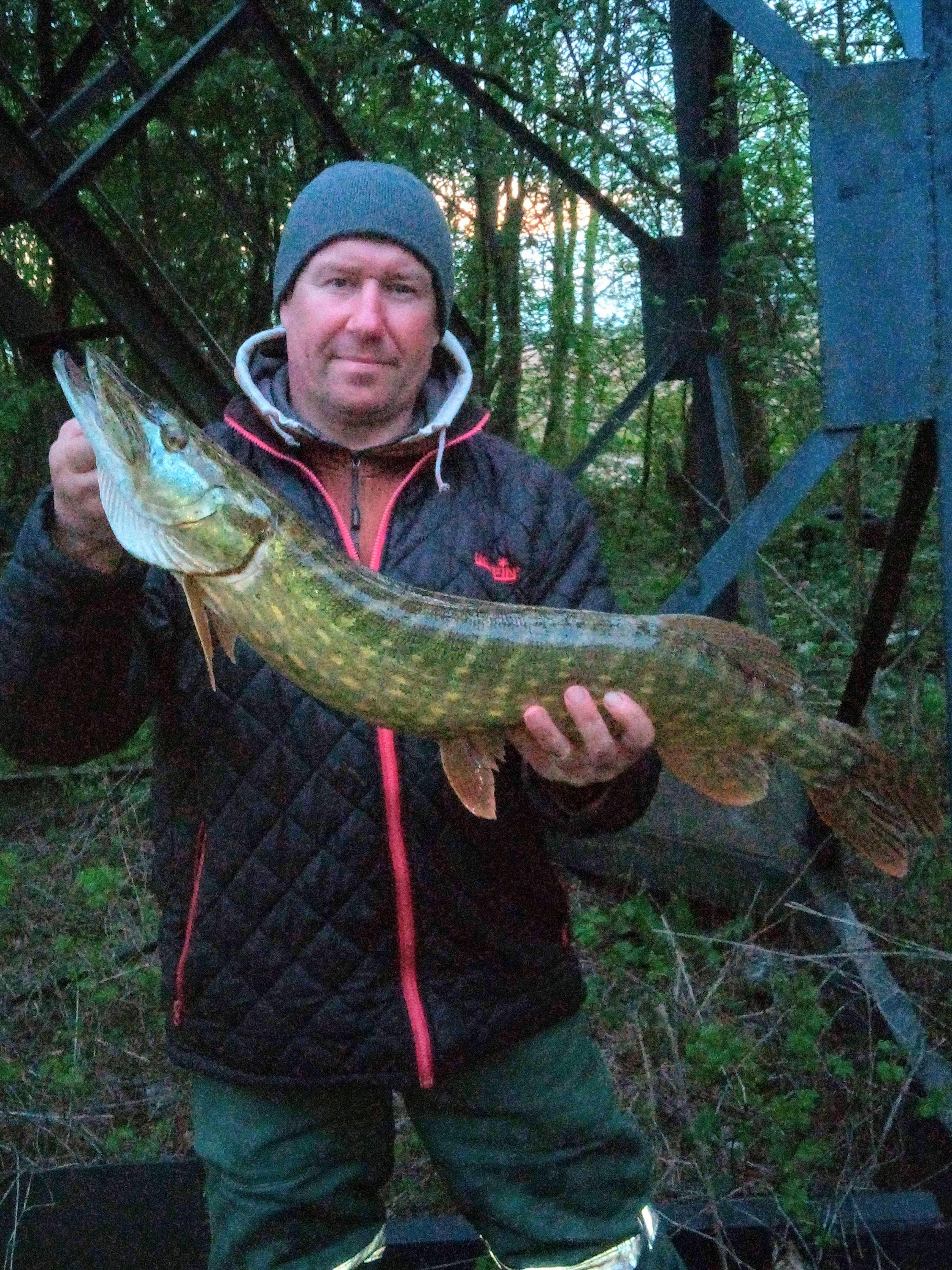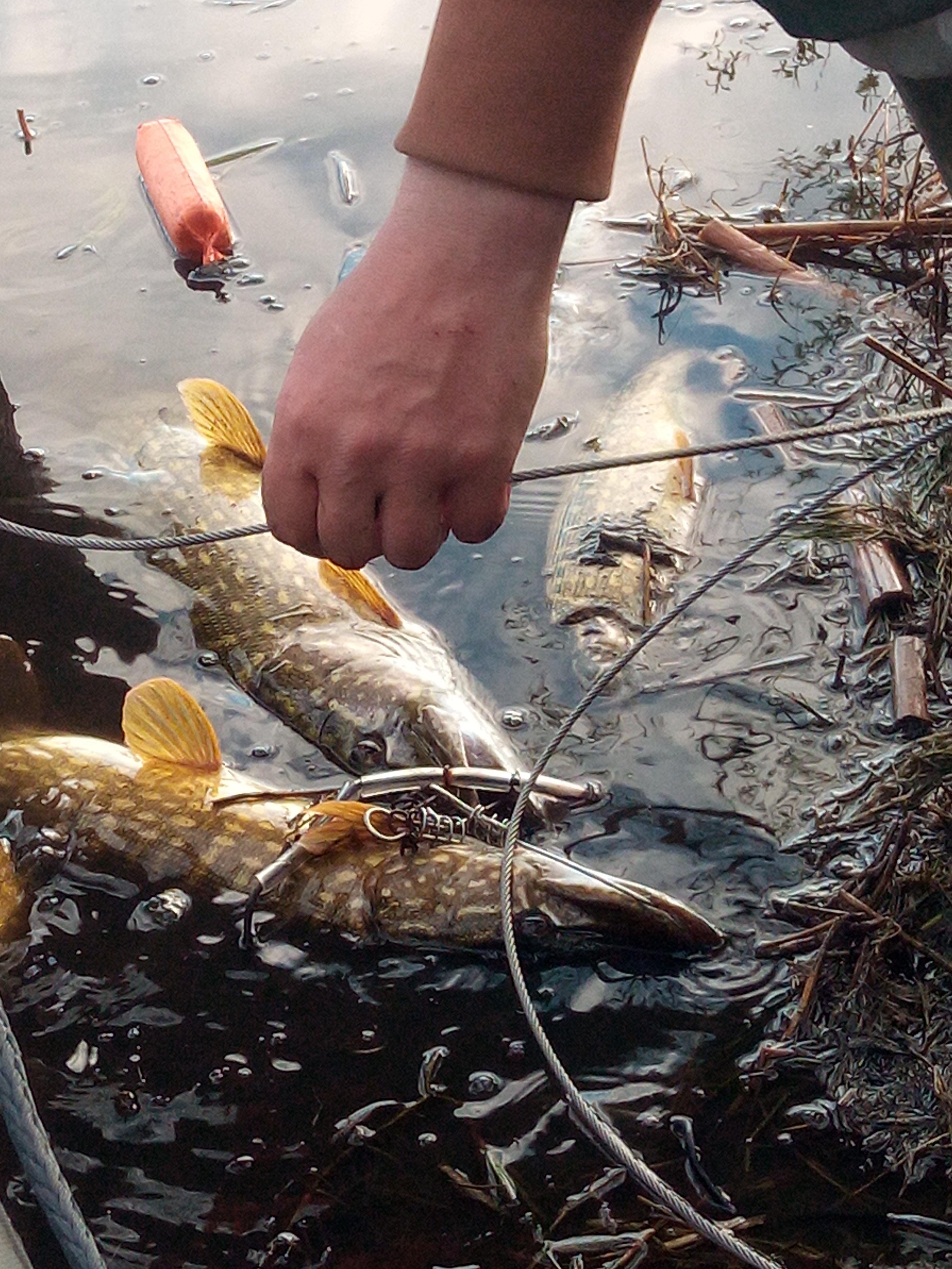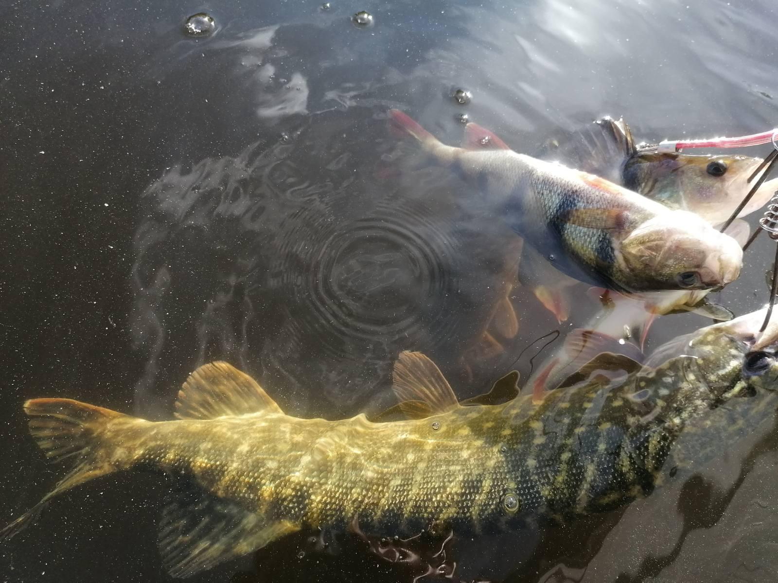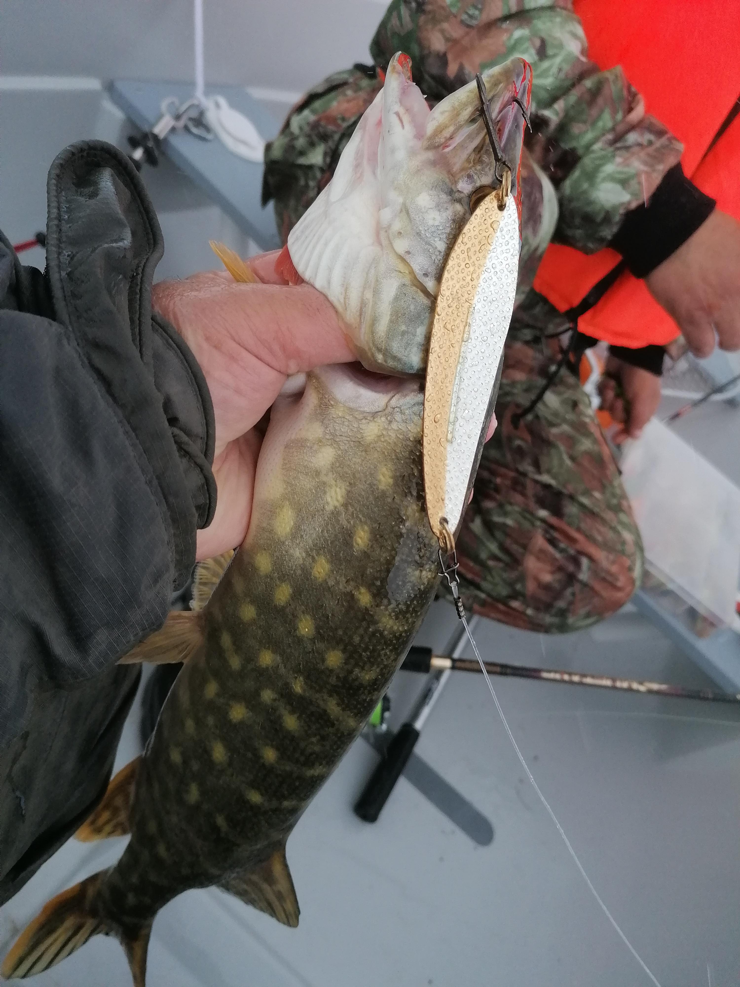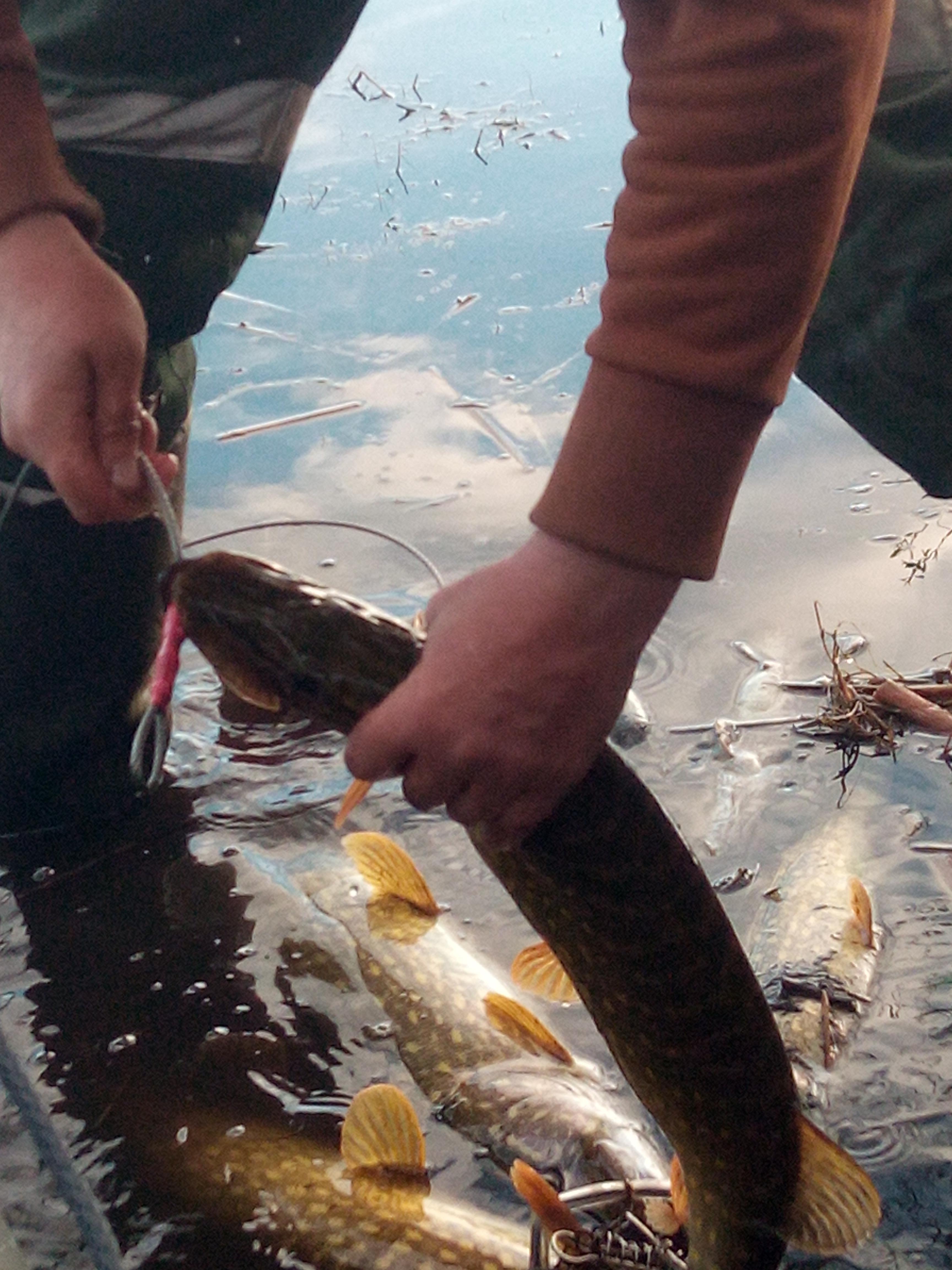 За следующий час беспрерывных передвижений и киданий мы всётаки смогли насадить на кукан ещё 2 щуки ( одну неплохую ) и трёх окуней.