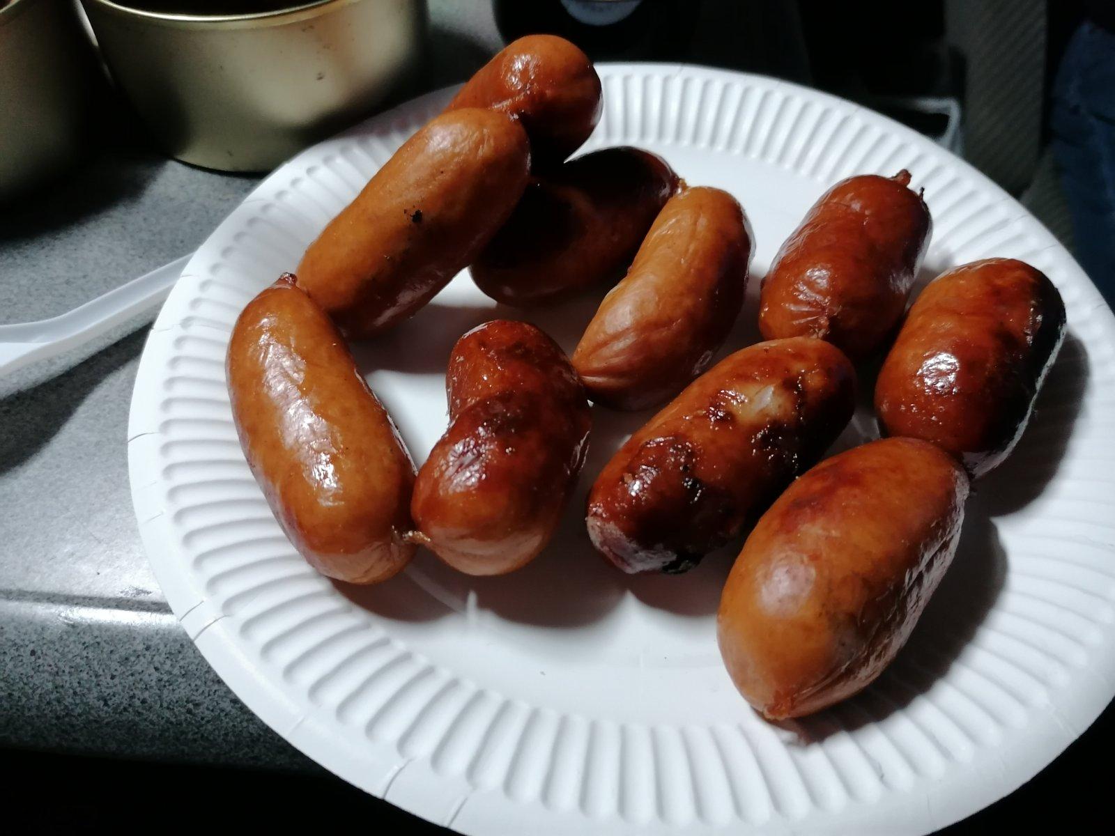 Выходя на берег, я даже как то немного подзамёрз, а тут горячая тушёнка и тёплые колбаски.