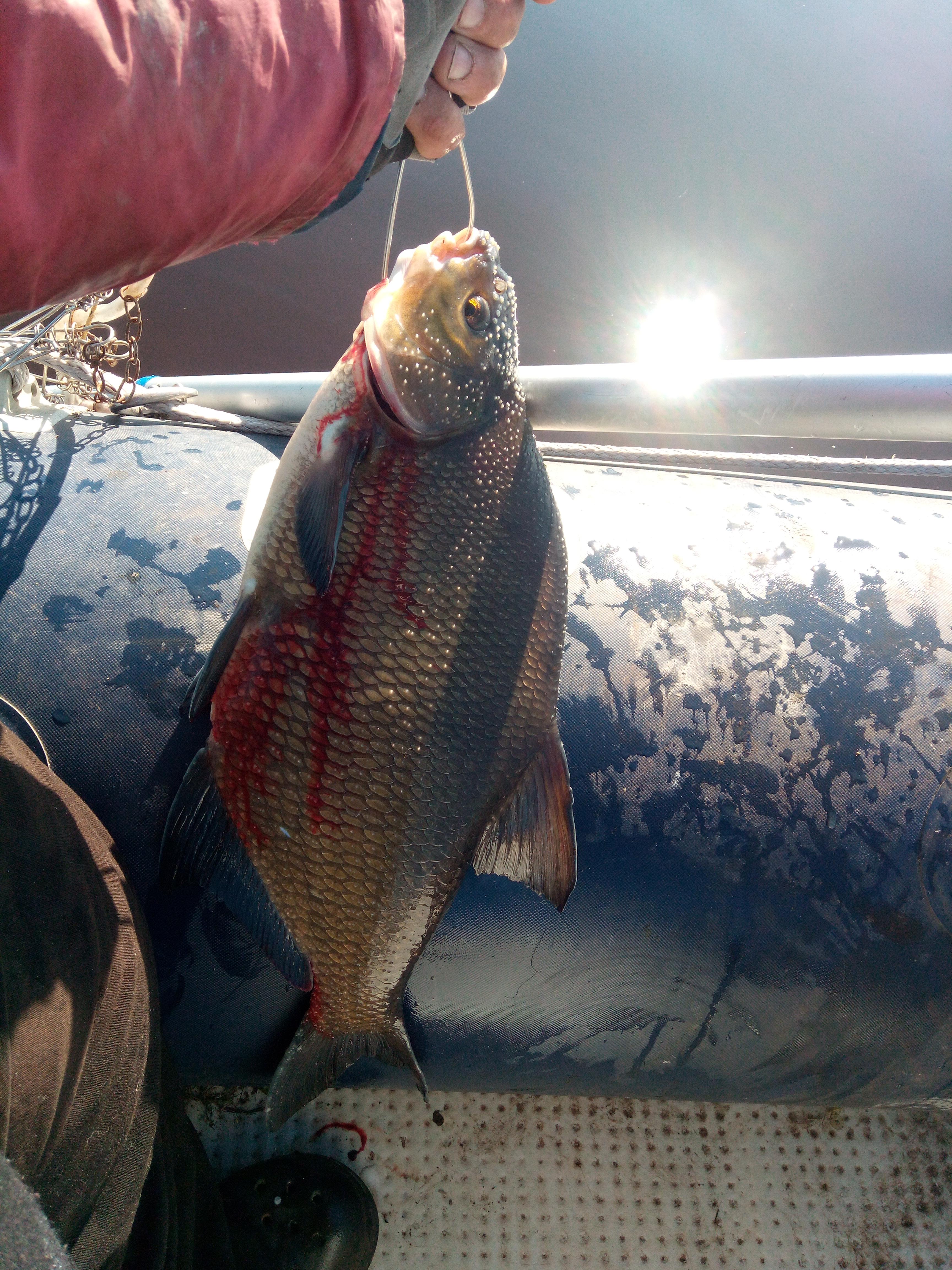 Нет, не трёшка и даже не двушка, но рыба достойная, так как вела себя очень агрессивно и упорно не хотела подходить к лодке и лезть в подсак. При осмотре выяснилось, что взяла она не чисто в рот, а подбагрилась за «подбородок».