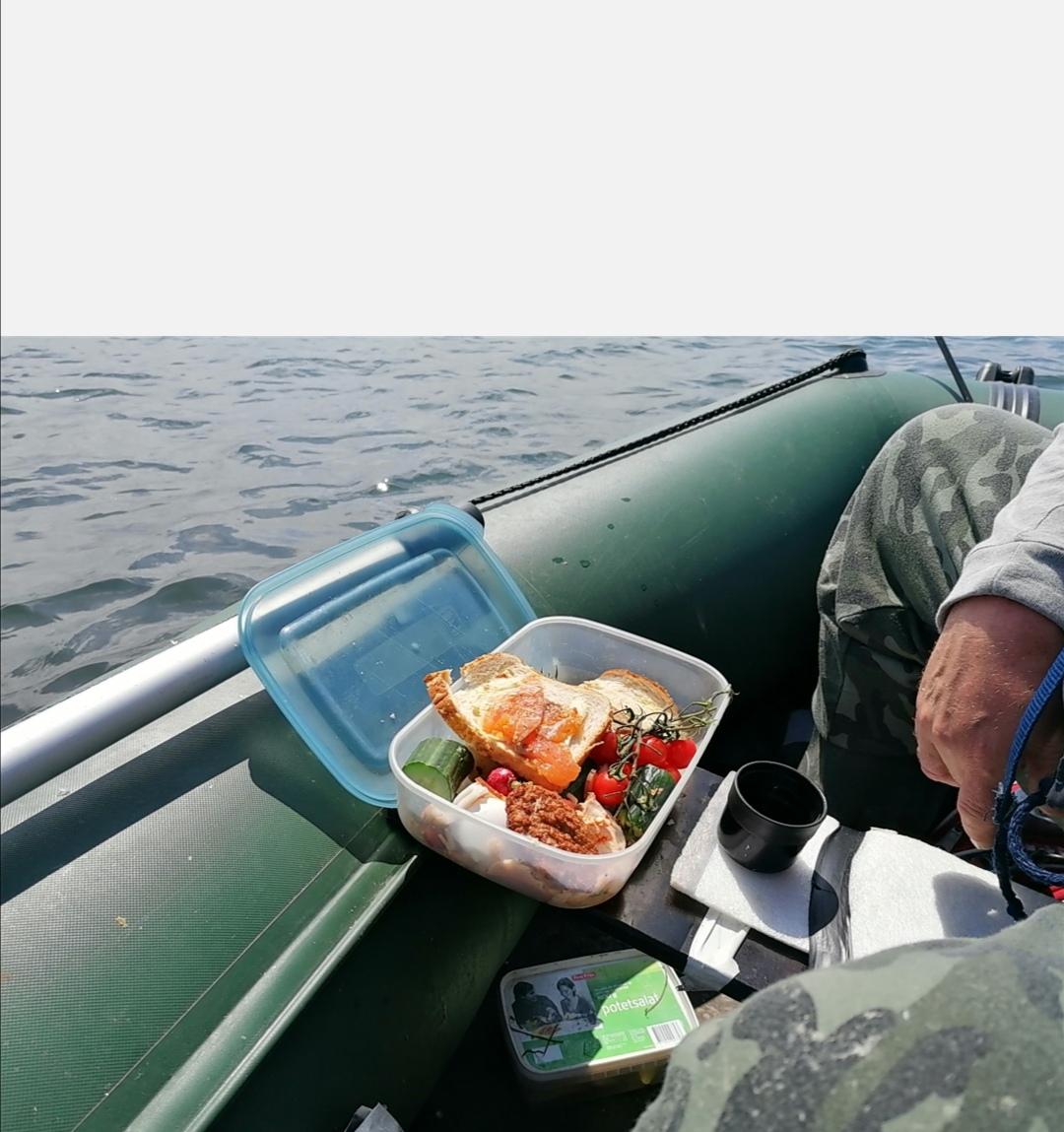 (Не пугайся, читатель! Такое количество ящиков обусловлено большим наличием скоропортящихся продуктов ( ведь ехали то мы на два дня ) и сопутствующей жарой, а не желанием увезти три «кюльмкаппи», набитых под завязку килошными тушками.)))Но первый паром в выходной день идёт поздно, и со всеми сопутствующими ( дорога, собирание лодки, второй завтрак на берегу ( ведь первый был в 4 утра и мы уже проголодались ) на воде мы оказались в половине одиннадцатого.