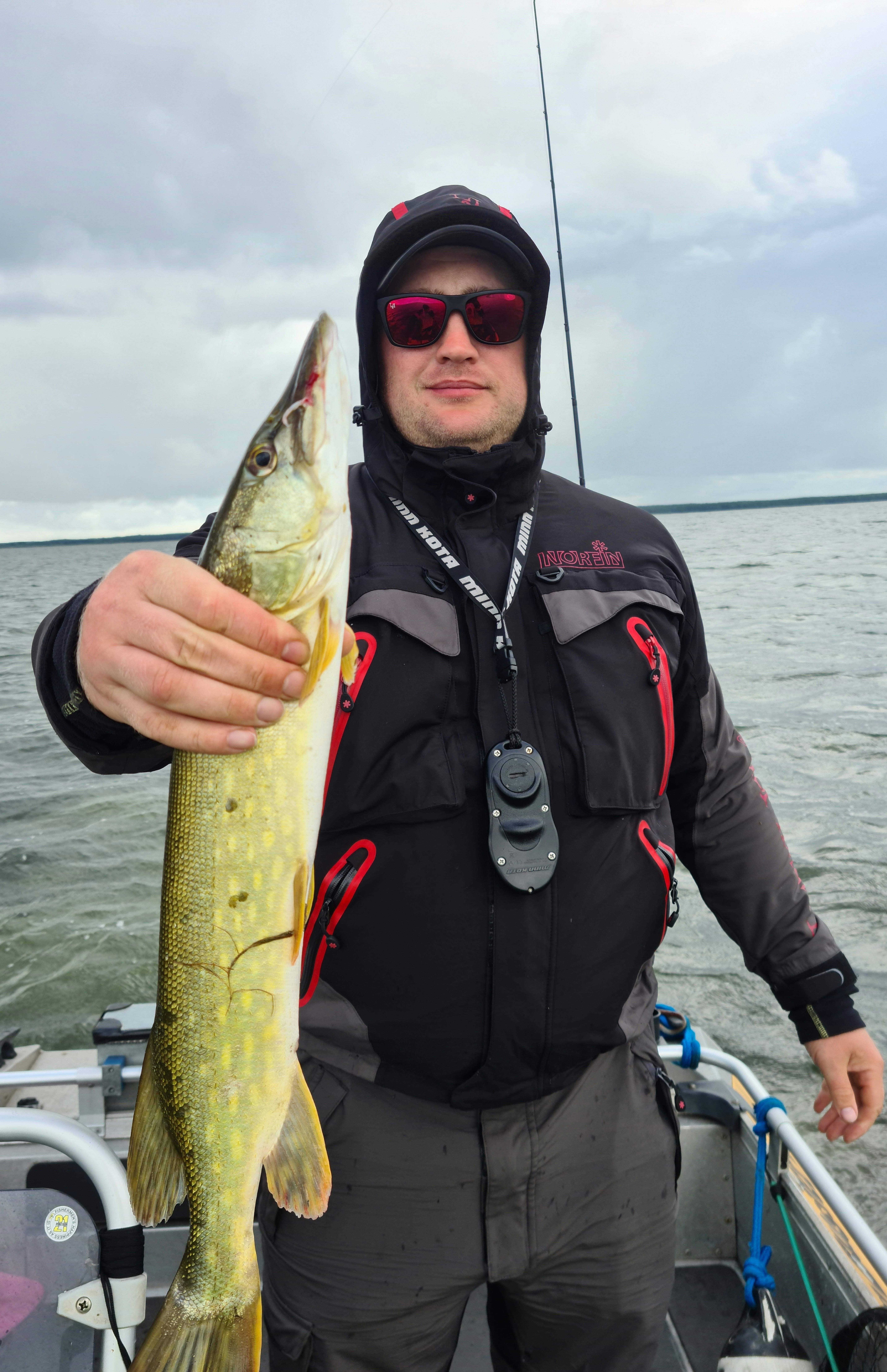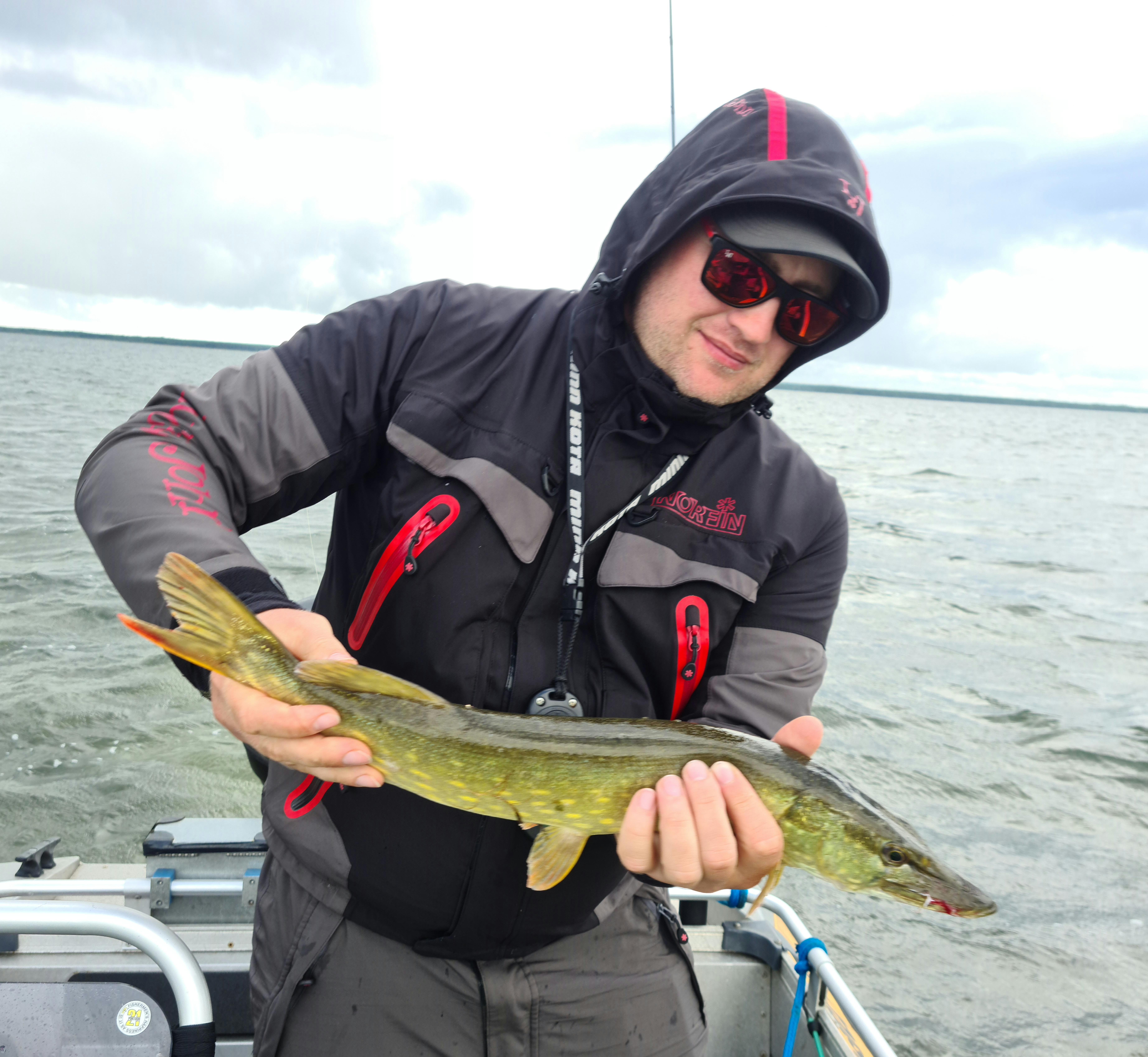 Накануне все щуки были пойманы на Сукре. Учитывая, что следующий день от предыдущего особо не отличался ( лишь ветер усилился ), предполагалось, что Сукре опять будет рулить. Так и получилось. Но когда два хвоста были подняты на борт, я решил поэкспериментировать и на другие приманки. За следующие несколько часов я поменял 3 бэби бастера, 2 тини бастера, 3 слайдера Сальмо, Штормовского воробья, Косадаку Интру 95 , Куусамоскую «черепаху», просто колебло Куусамо ( 27гр., ни разу без травы не пришло ), два вида Вильямса ( колебло ), два безымянных воблера.. Не смотря на то, что у всех этих приманок в купе абсолютно разная игра, разные расцветки и я делал разнообразные проводки, ничего из этого кроме Косадаки щуке не понравилось. Одну взял. При этом напарник опять поднял несколько хвостов на Сукре. САМИМ экспериментом я остался доволен: вывод не то что НАПРАШИВАЛСЯ, а был просто очевиден: работает вертушка.