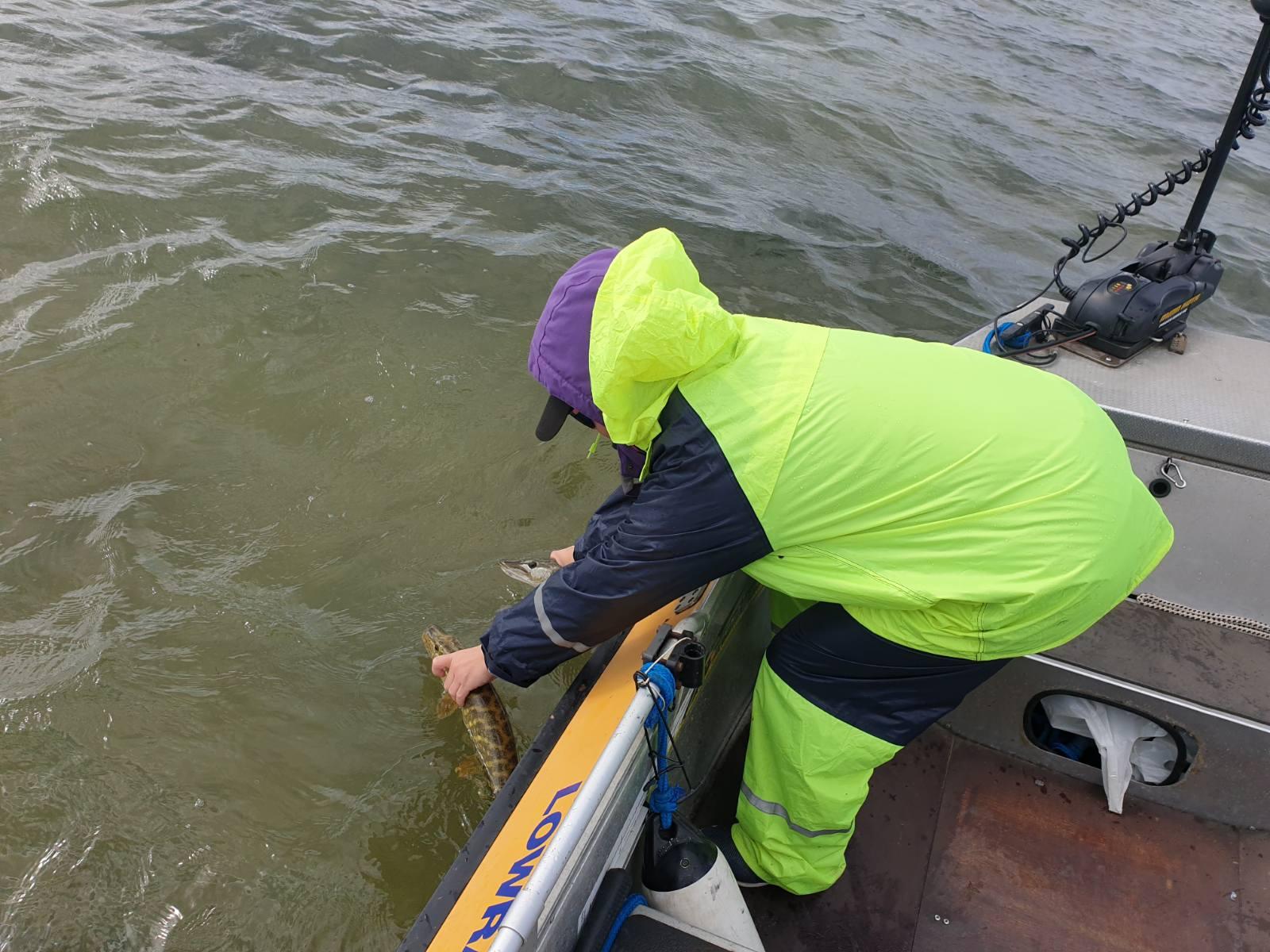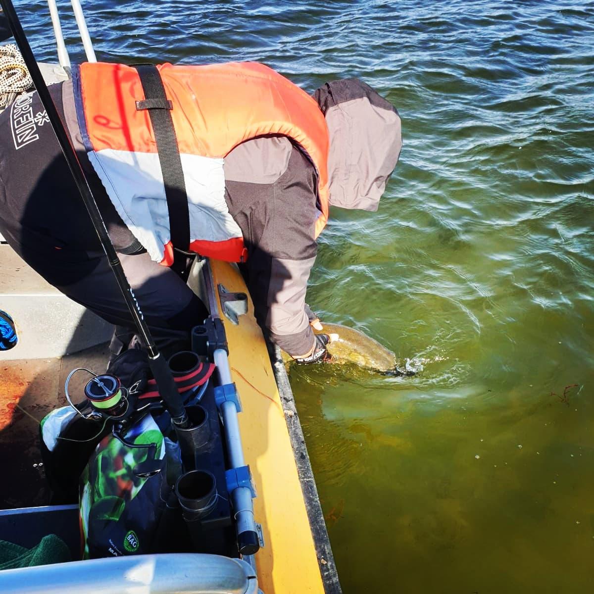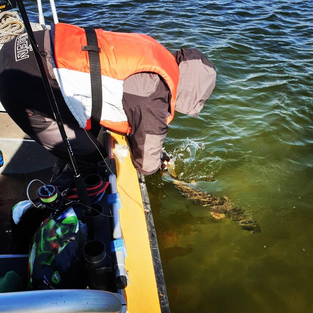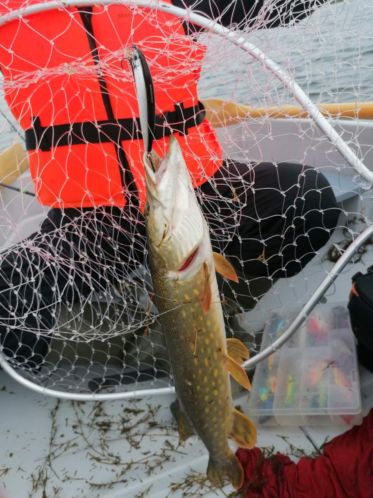 Подсак мы разложили ещё на берегу, но при выходе нас нещадно сносило, работали вёслами и подсак мешался. Поэтому мы его сложили.)) Никто не ожидал, что рыба возьмёт со второго заброса. Ну, и пока мы его раскладывали, моя щука и сошла.