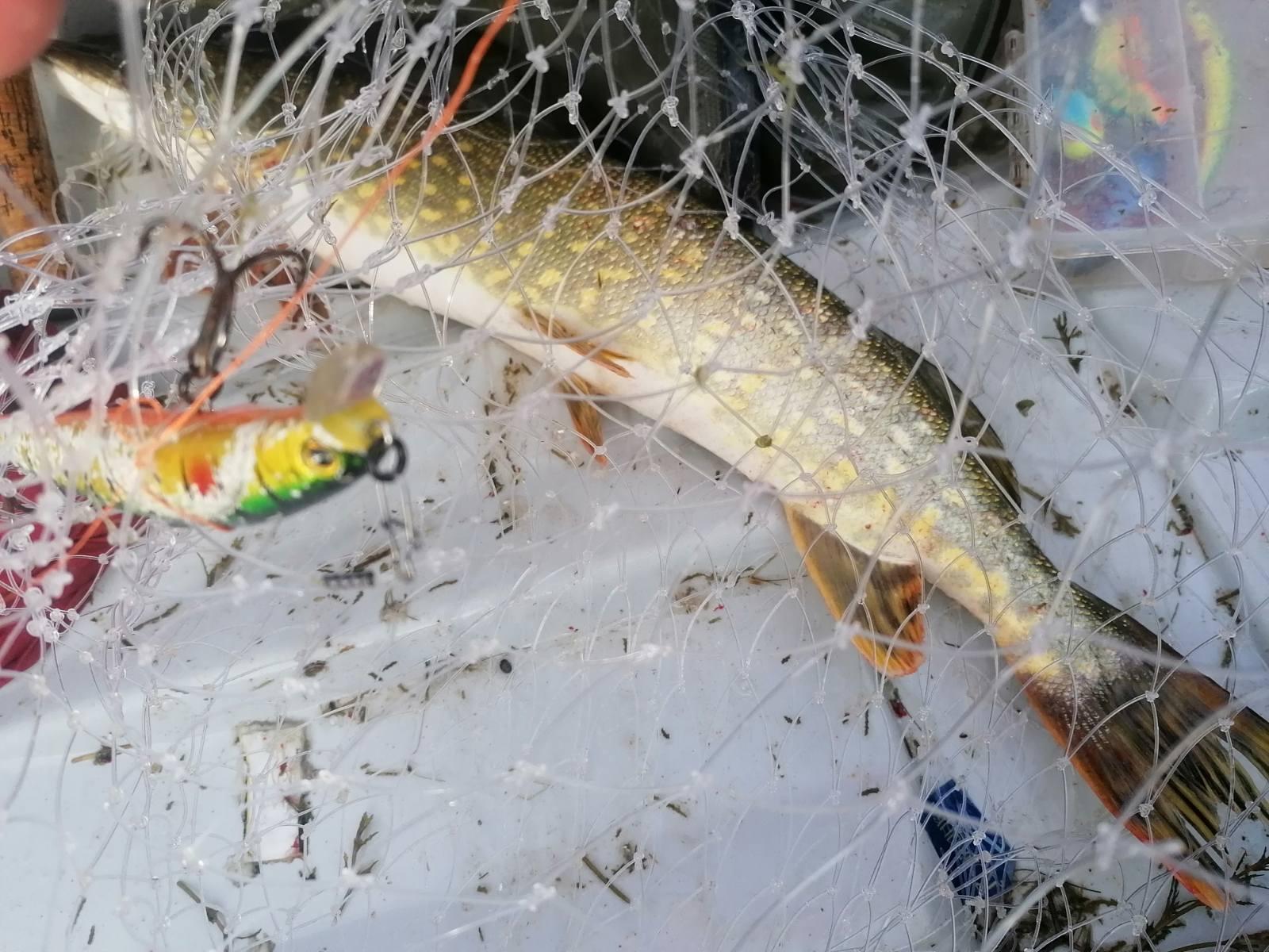Ставлю яркий Вестин ( джерк в тонущем варианте, 38 гр ) и со второго заброса цепляю щуку. Подвожу к лодке, вижу, что зачётная , ( где то между полуторами и двумя кг ). Так же успеваю разглядеть, что взяла не в рот, а подбагрилась под жабры.