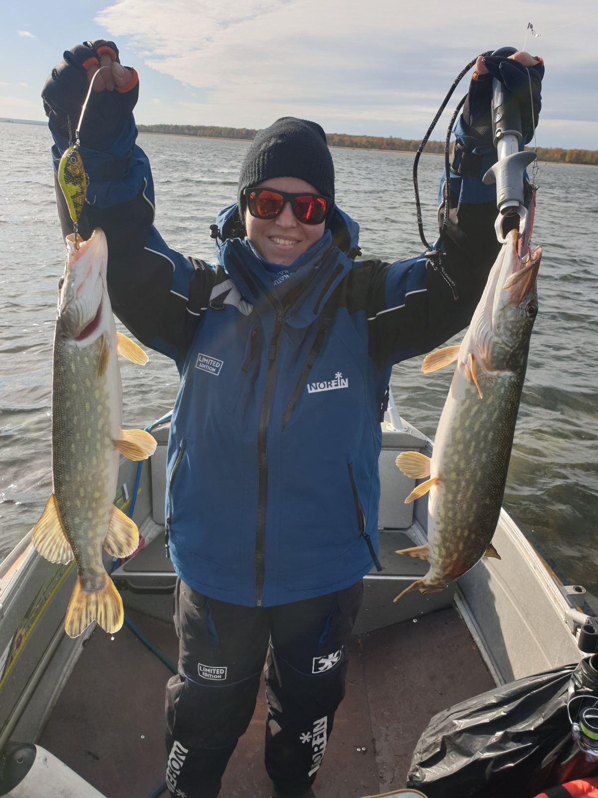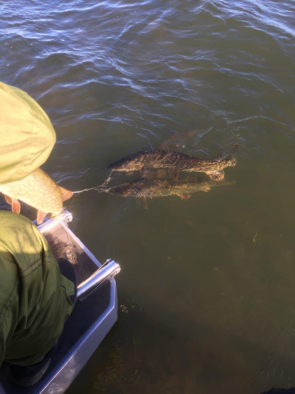 Ловим на разные приманки. Две щуки уже в лодке и три мы с Димой отпустили ( нет, мерные конечно, но мы же не рыбьи педофилы! )))