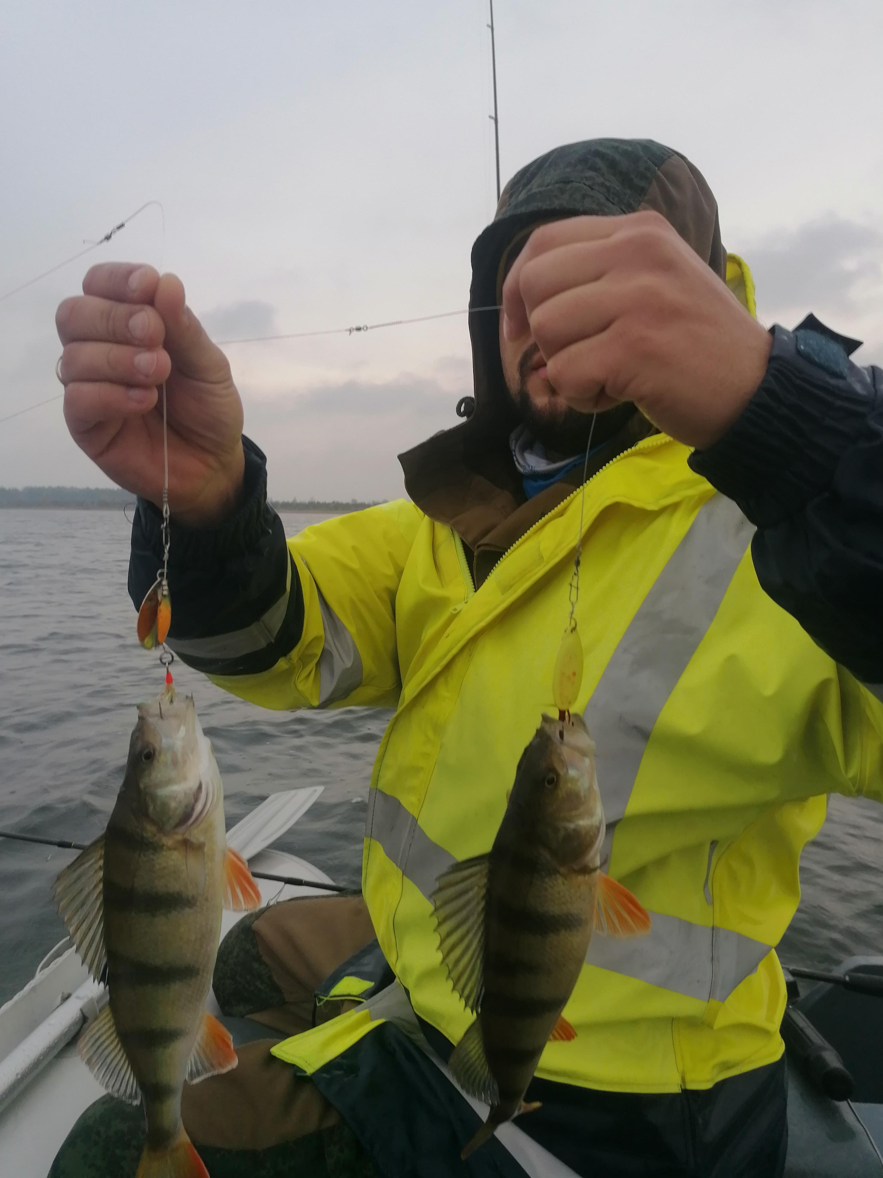 Тут же с Димой ставим вертушки и с разницой в 3-4 минуты вытаскиваем по окуню. А потом ещё раз, но….