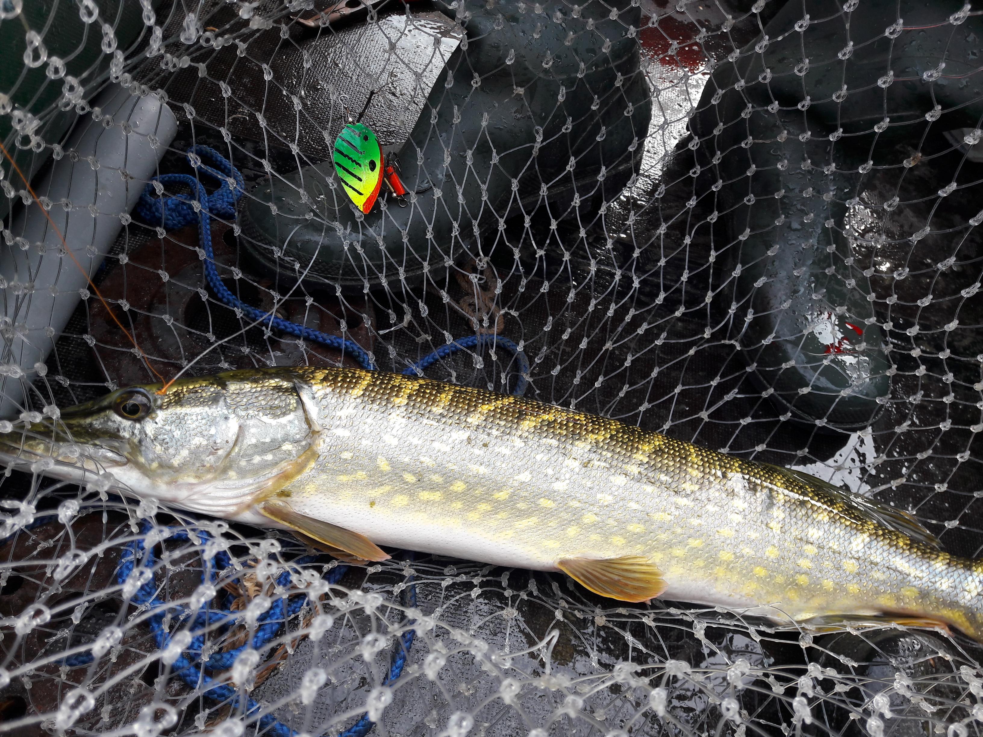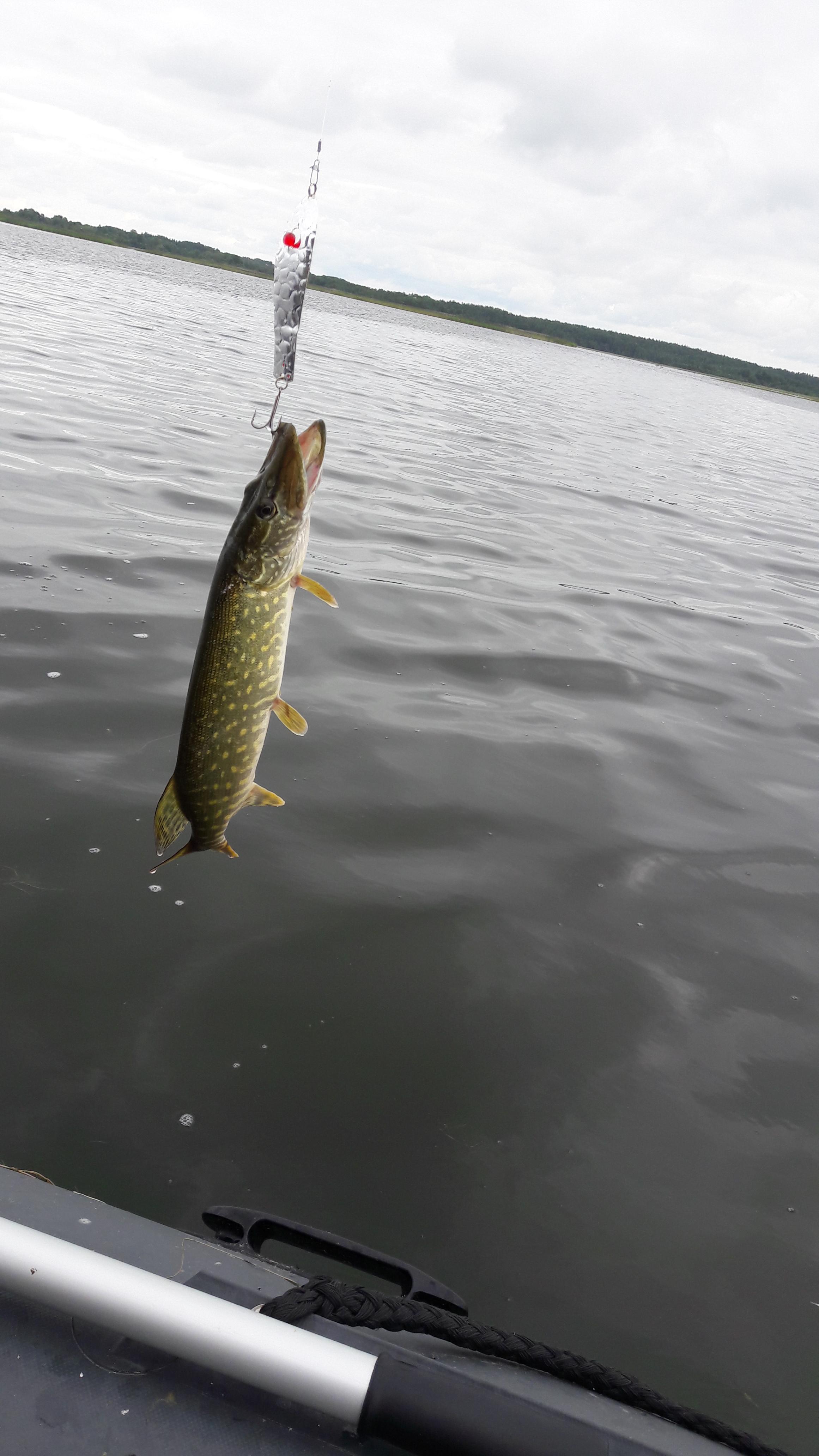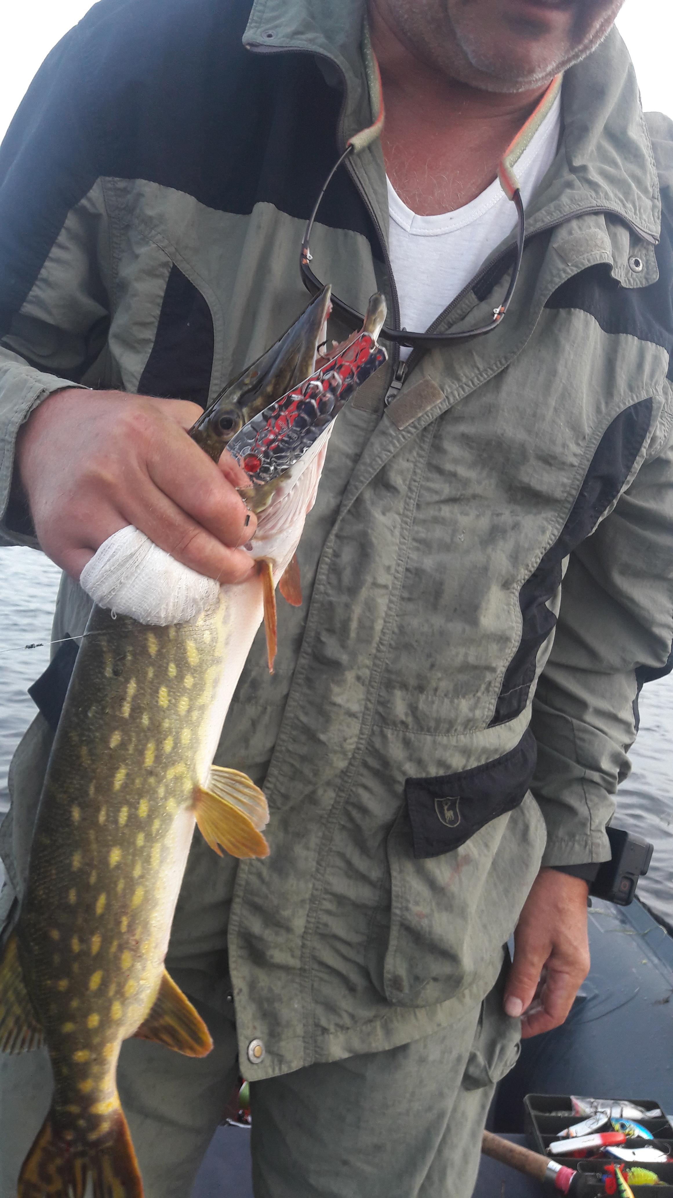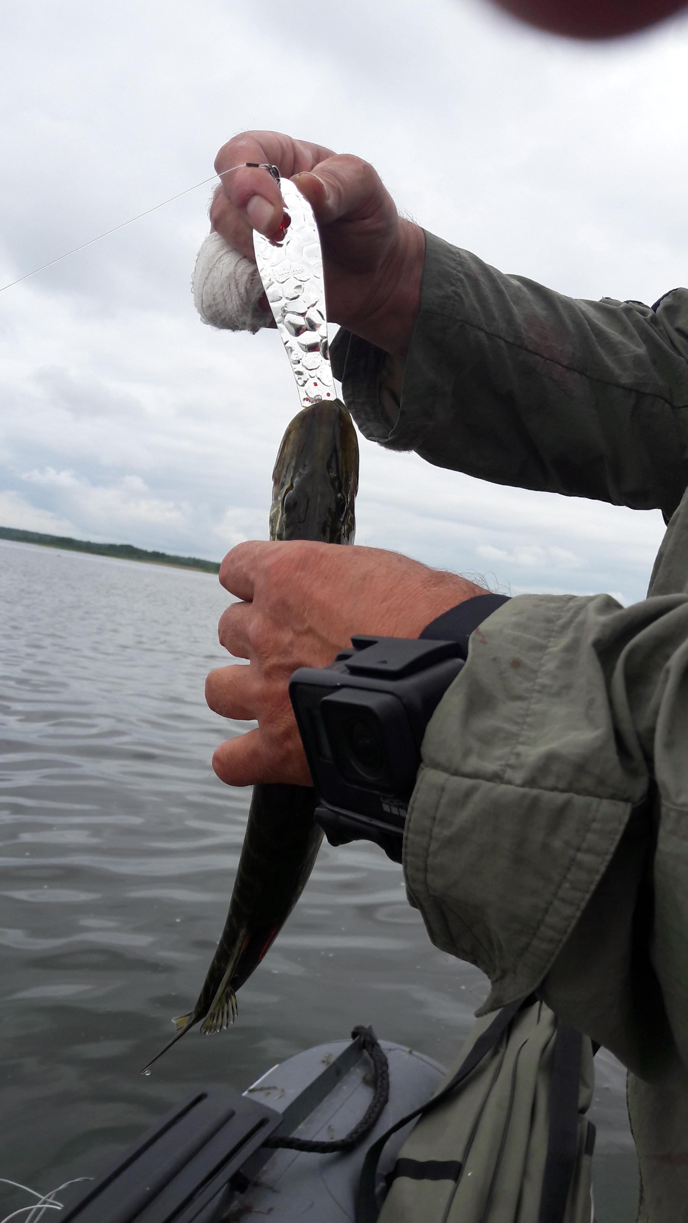 А вот Гуннар отличился. Подобрал цвет Куусамоской блесны ( которая у меня тогда нифига не ловила ) и надёргал на неё щучек, пока какая то зубастая зараза не откусила её ).