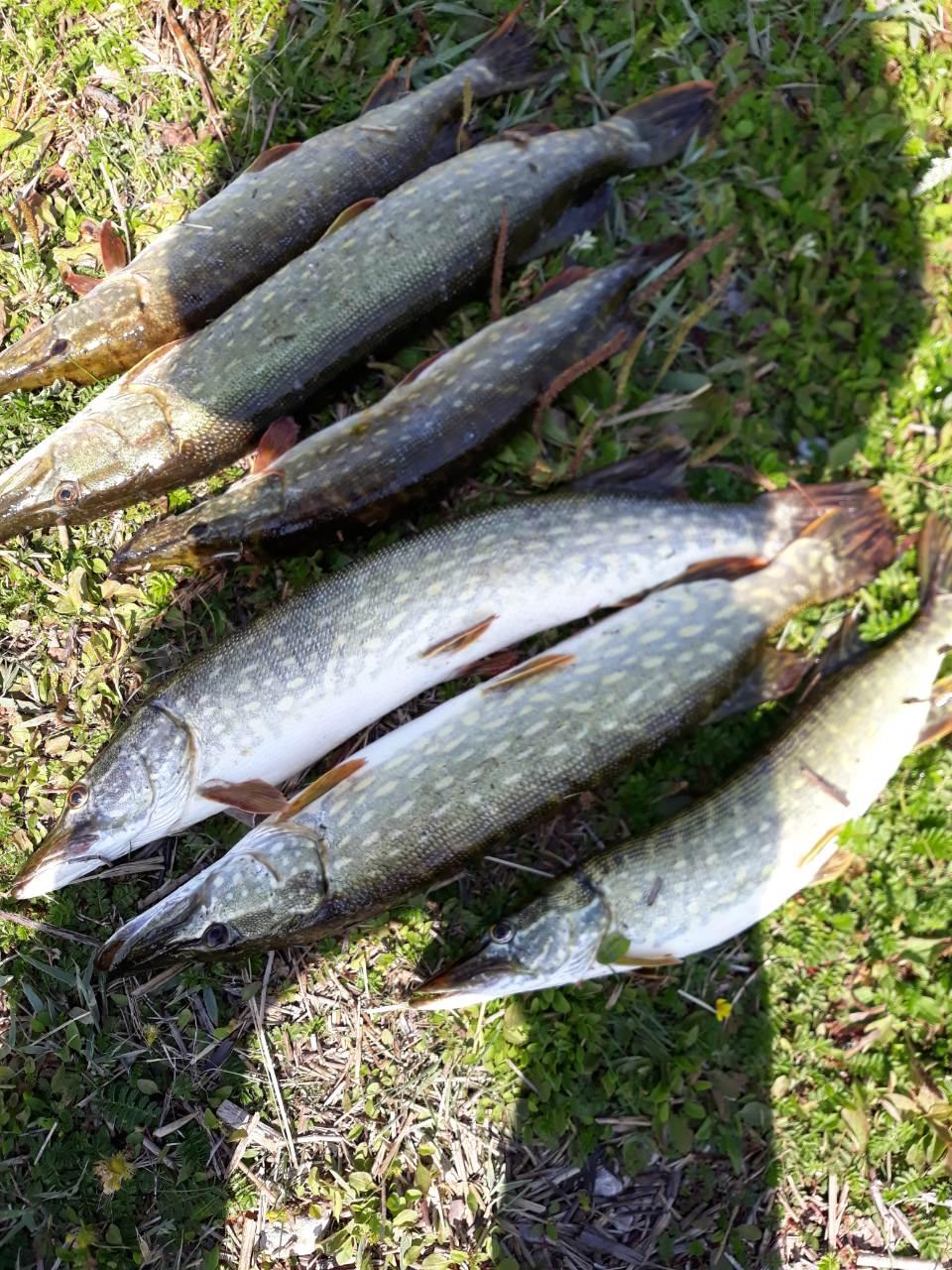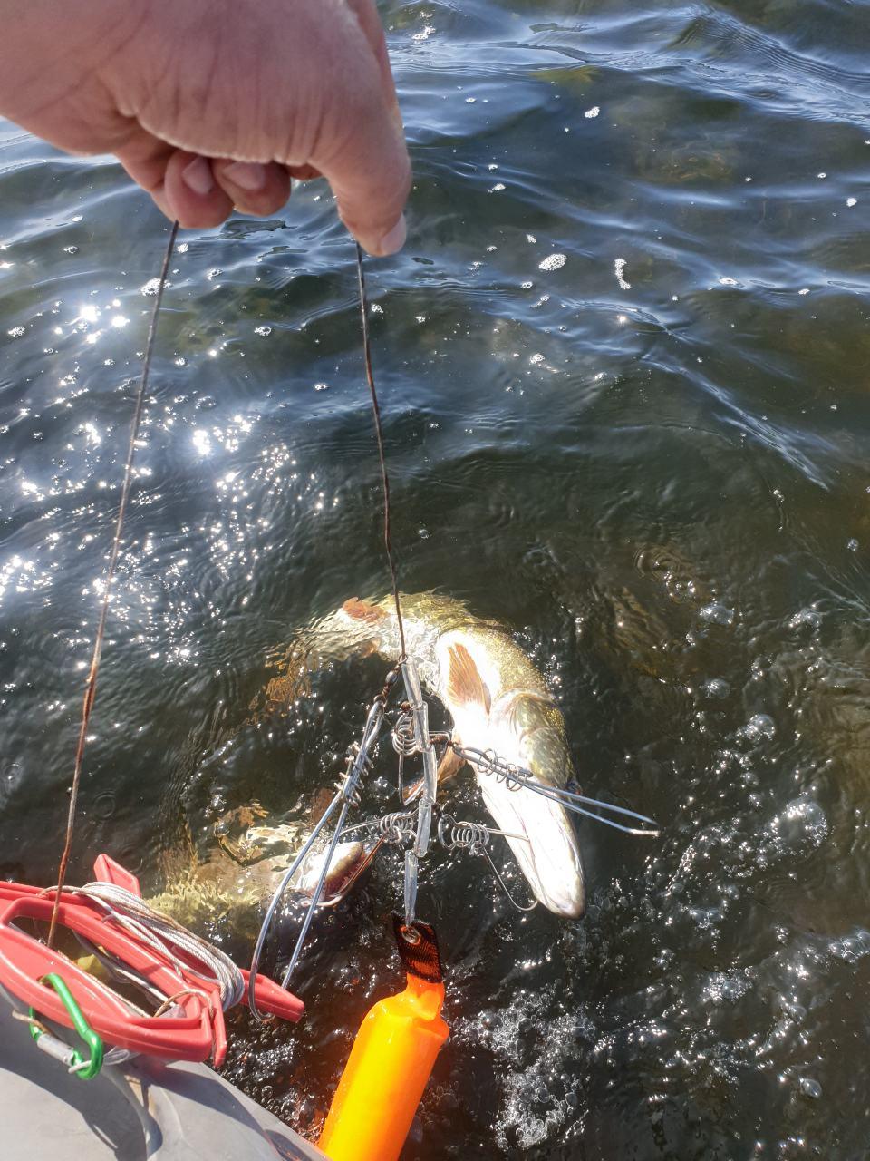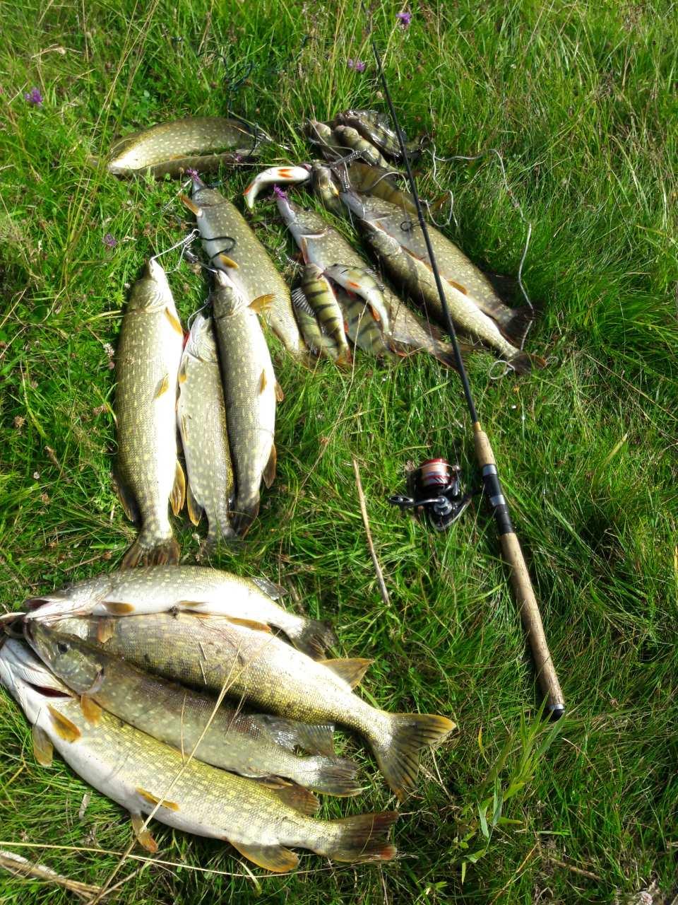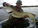 А вот Гуннар отличился. Подобрал цвет Куусамоской блесны ( которая у меня тогда нифига не ловила ) и надёргал на неё щучек, пока какая то зубастая зараза не откусила её ).