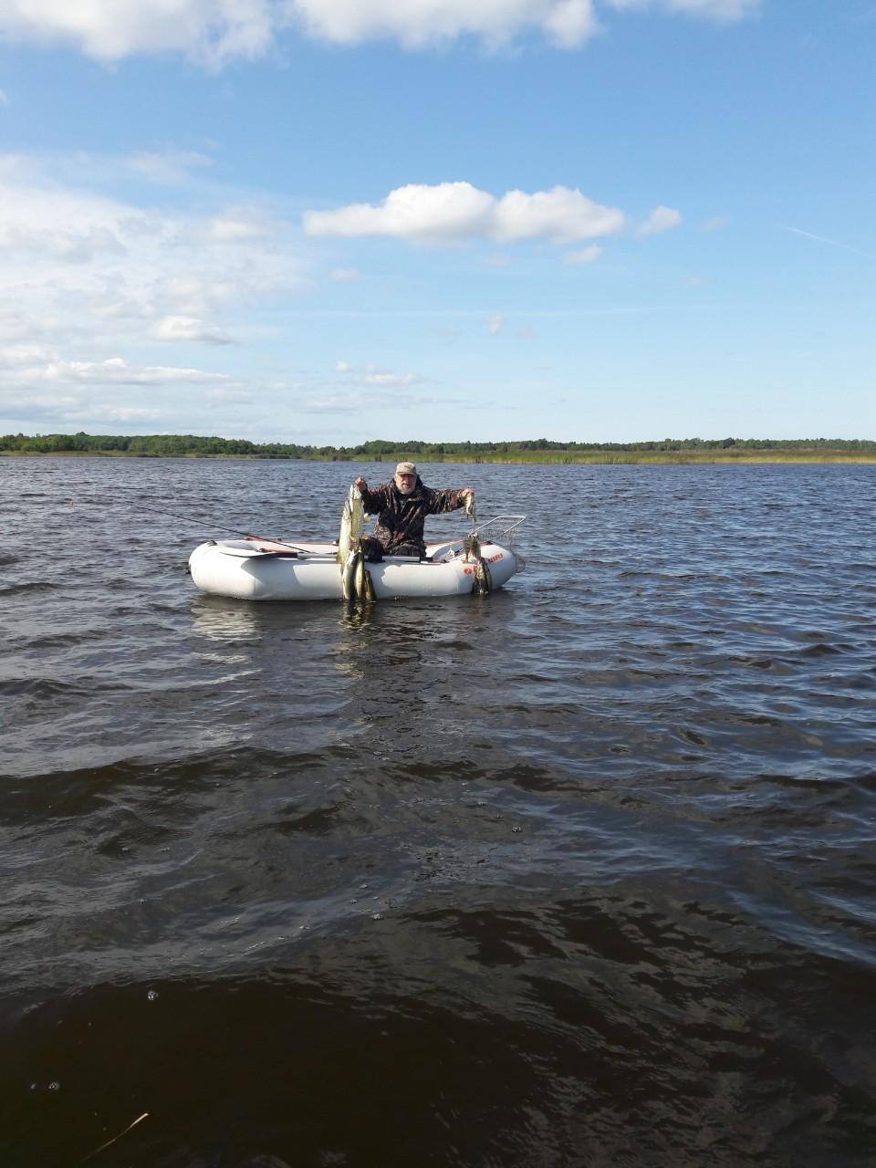 Больше ходим на вёслах, чем под мотором.Вышли в «перспективное» место , которое нам сдали рыбаки-приятели — а там глубины 25 сантимов. Всё видать насквозь и вдаль на 15 метров. От лодки никто не шарахается , даже наоборот: наглые караси гоняются друг за дружкой, не обращай на нас никакого внимания.