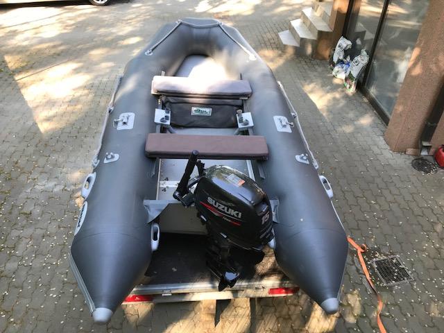 Лодка в отличном состоянии. В комплект входят мягкие чехлы на сидения с нижней сумкой, держатели для спиннингов, держатель для эхолота, чехол для перевозки лодки на прицепе. Также днище лодки усилено дополнительными швами от протирания об песок на мелководьях. Цена нового комплекта с доработками 1300 евро. Дополнительно возможно приобрести мотор Suzuki DF 15kW. Цена лодки 700 евро. Цена мотора 1950 евро.