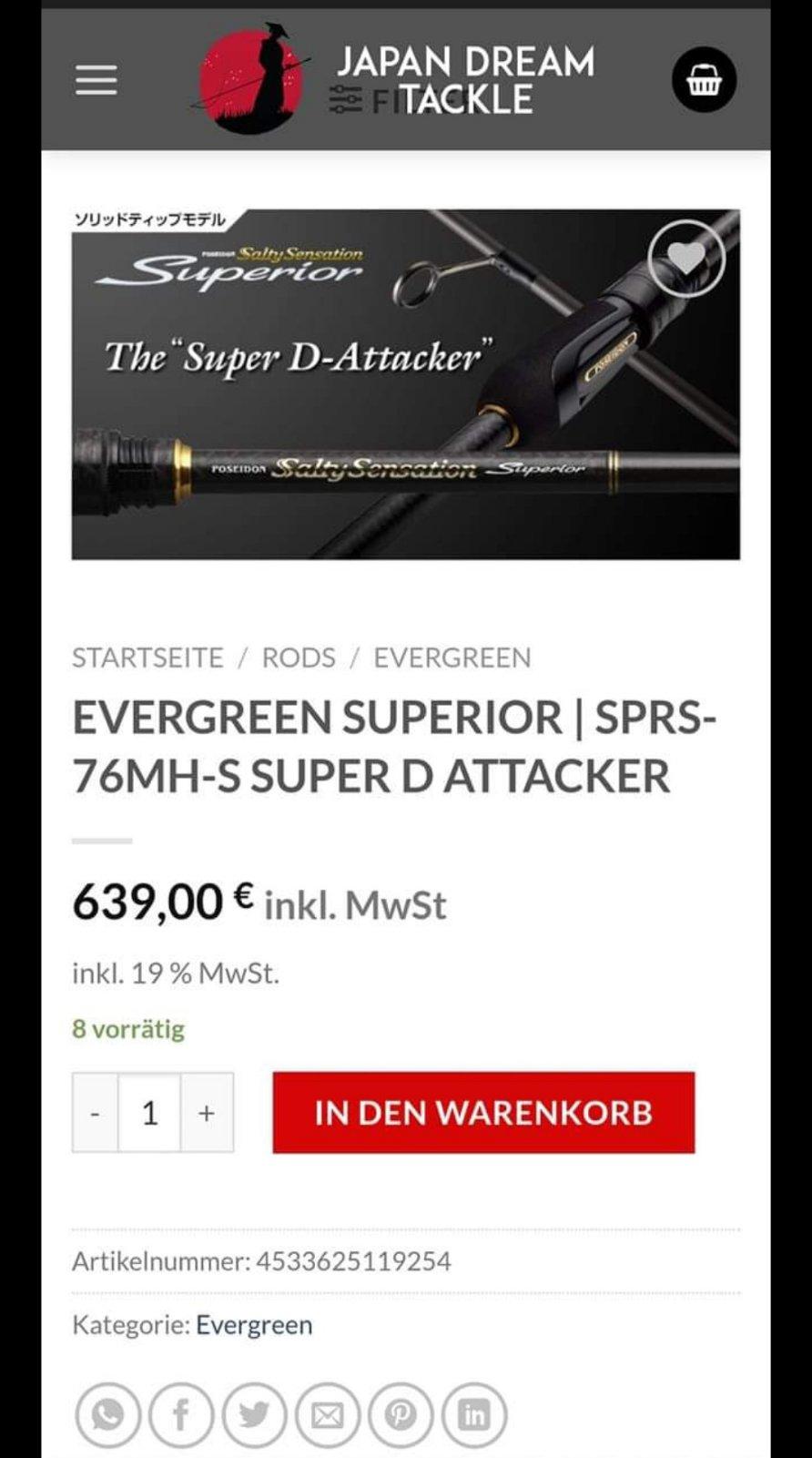 Продам спининнг! Evergreen Superior Solid Tip SPRS-76MH-S Super D-Attacker Хорошие состояние, на рыбалке был 5-7 раз, все целое , не битый . Цена: всего 330€ Куплен был за 590€ сейчас он дороже , новый стоит в районе 640 евро.. Находится в Таллинне, если нужно можно и почтой. По всем вопросам звонить или писать. Тел:+37256965156 Эдгар.