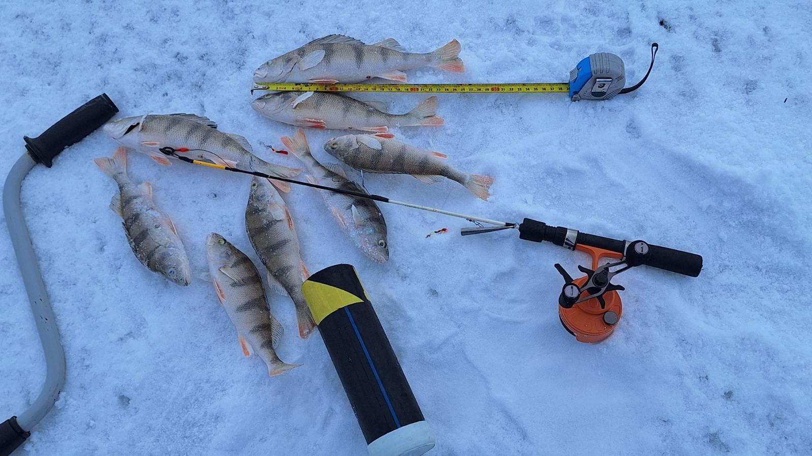 В итоге Виктору удача ни то чтобы улыбнулась, но хотя бы как то оскалилась. У него в улове оказалось 8 окуней. У напарников намного скромнее: два и один. Хотя все втроём насверлились до звёздочек в глазах. Надышались свежим воздухом тоже нехило, наверное на неделю вперёд, так как до точки шли пешком более 5км в осну сторону ( в шесдесят с хвостиком ещё ТО удовольствие )).