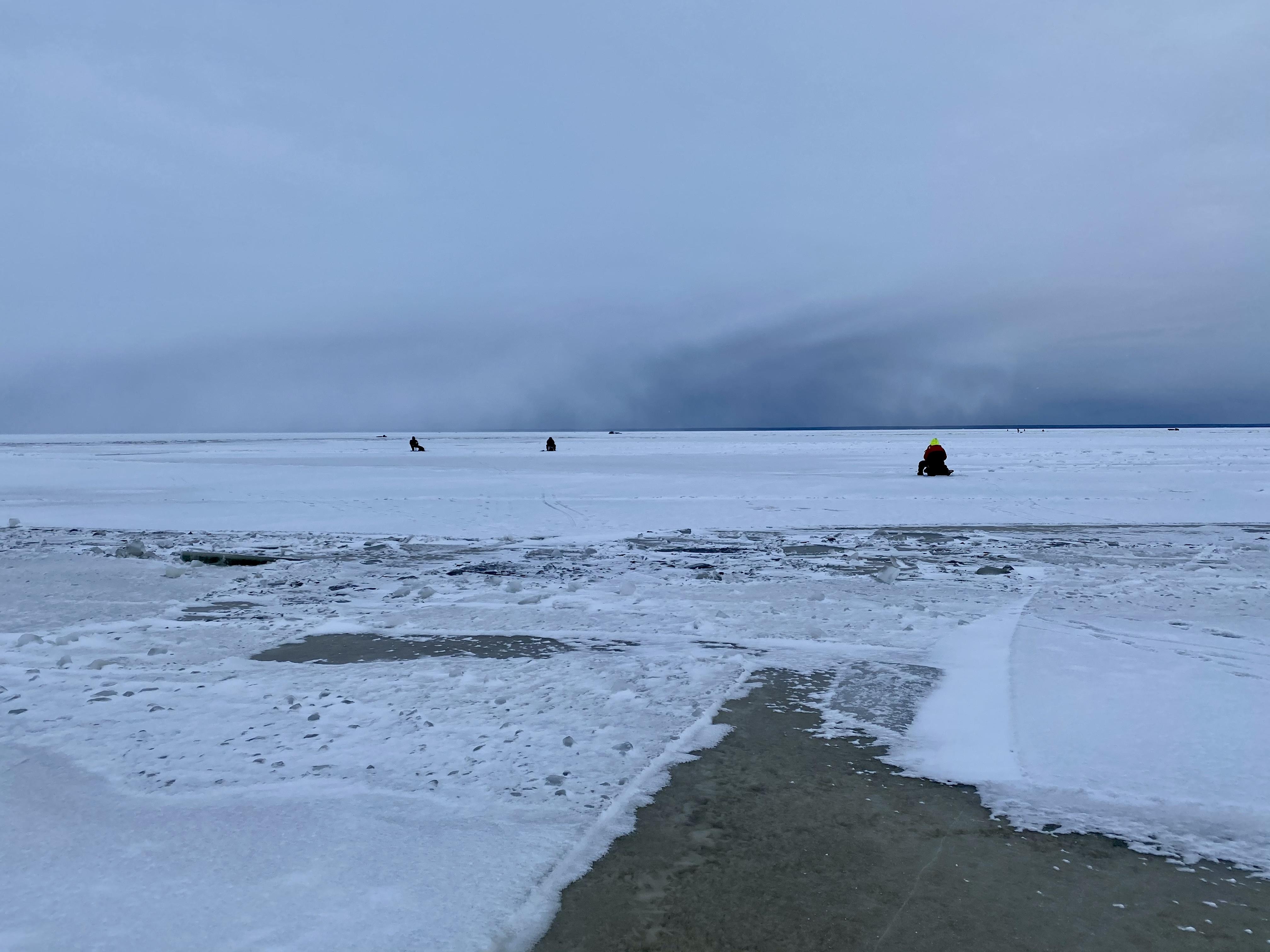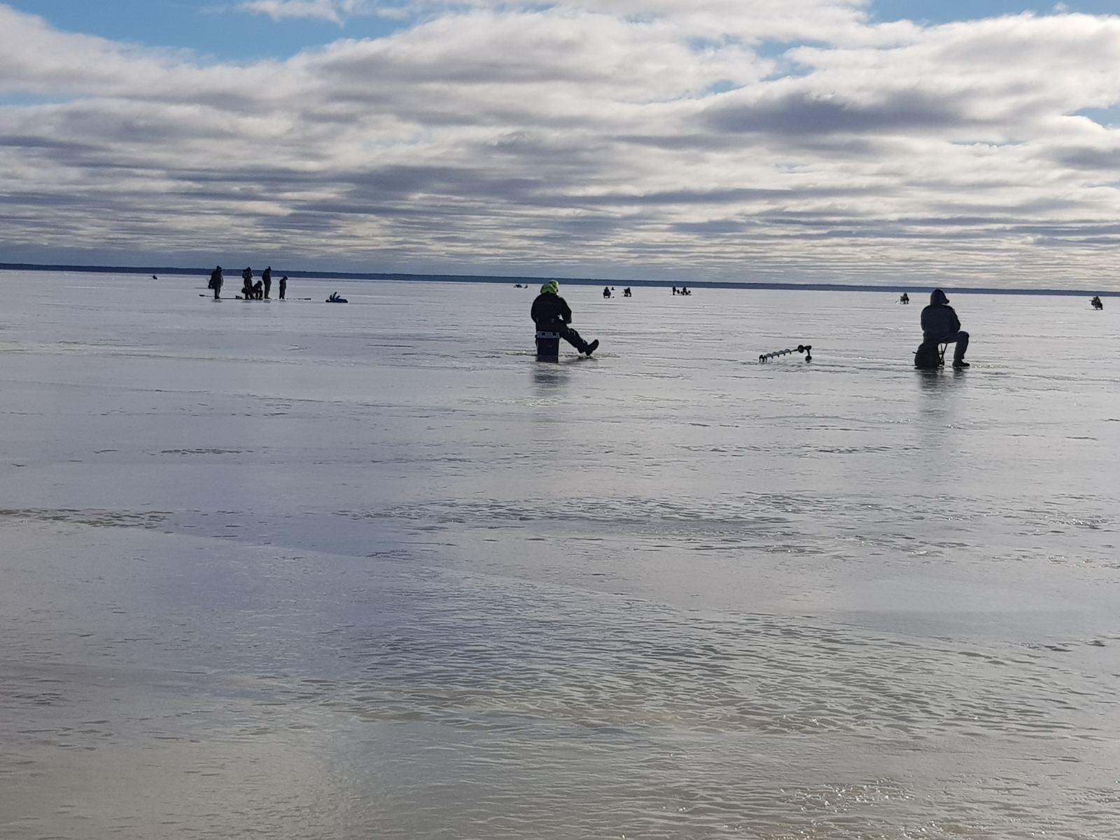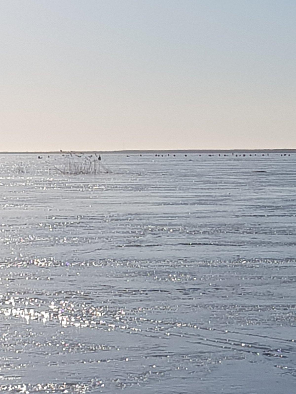Мы немножко припозднились , но около 10ти были уже на льду. По нашим скромным подсчётам через час-полтора первые рыбаки должны были уже двинуть в берег.