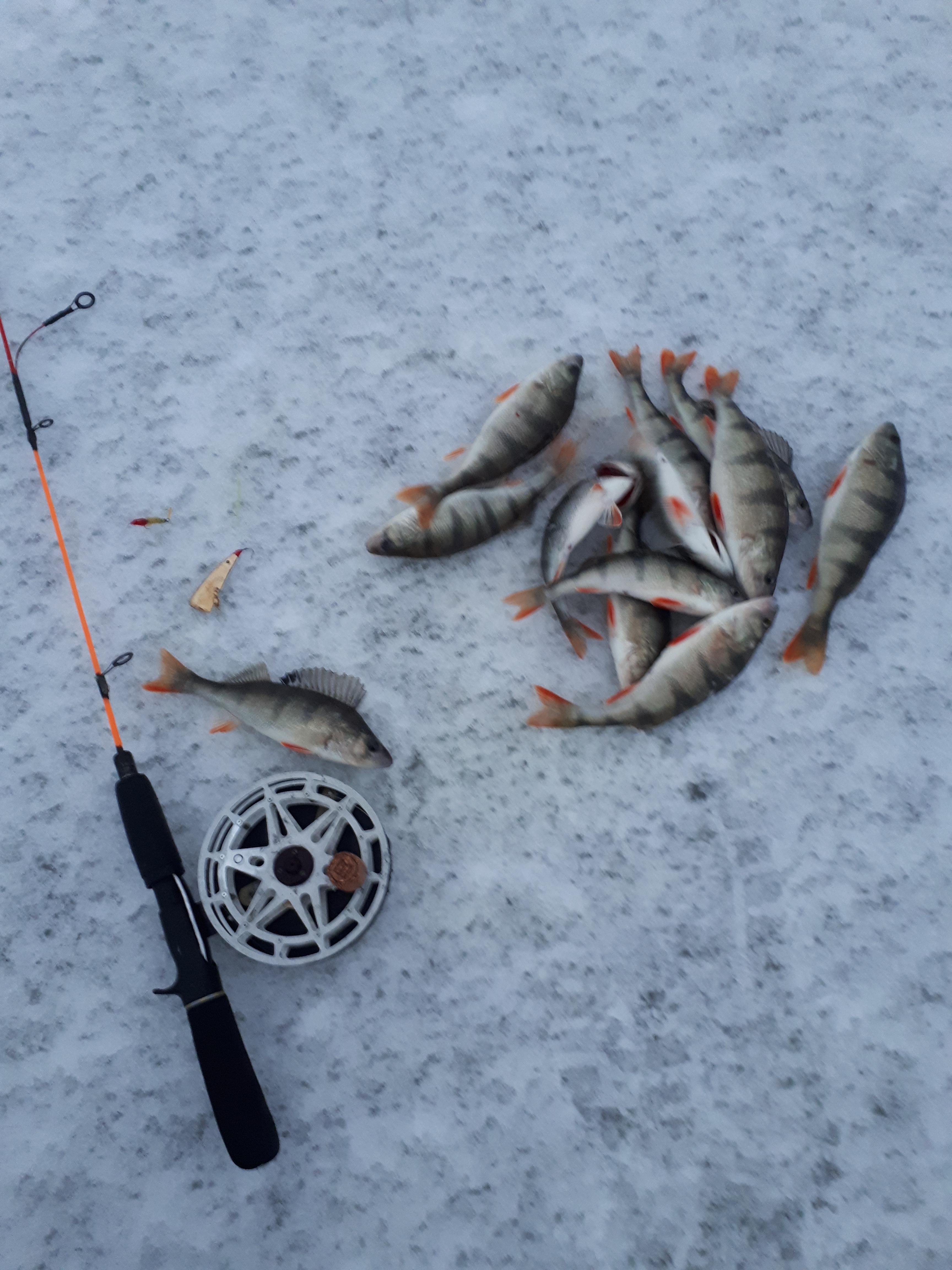 В итоге дошли до народа,который ловил на 3-4 км. напротив СПА,там взял 9 мерных окуней на разных лунках,было много мелочи.