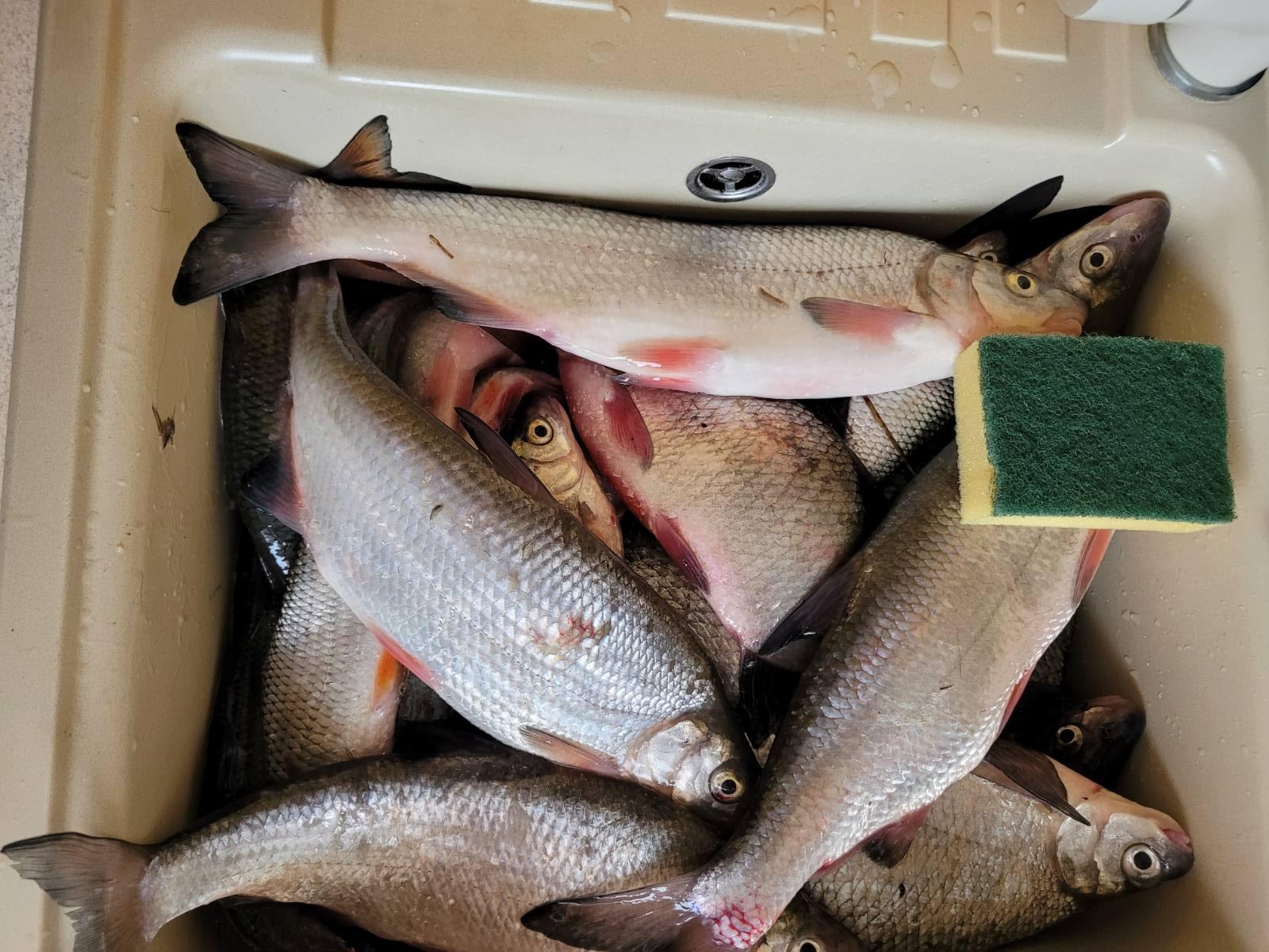 И не видно было, чтобы все подряд рыбку вылавливали. Мы тоже не сразу нашли свою «точку». А потом дело пошло и за 4 часа я нарыбачил 33 вимбы и десяток мерных плоток. Вимба не крупная (средний вес 350 гр), но и маломерок было не много. Для меня этот размерчик очень удобен для сушки.