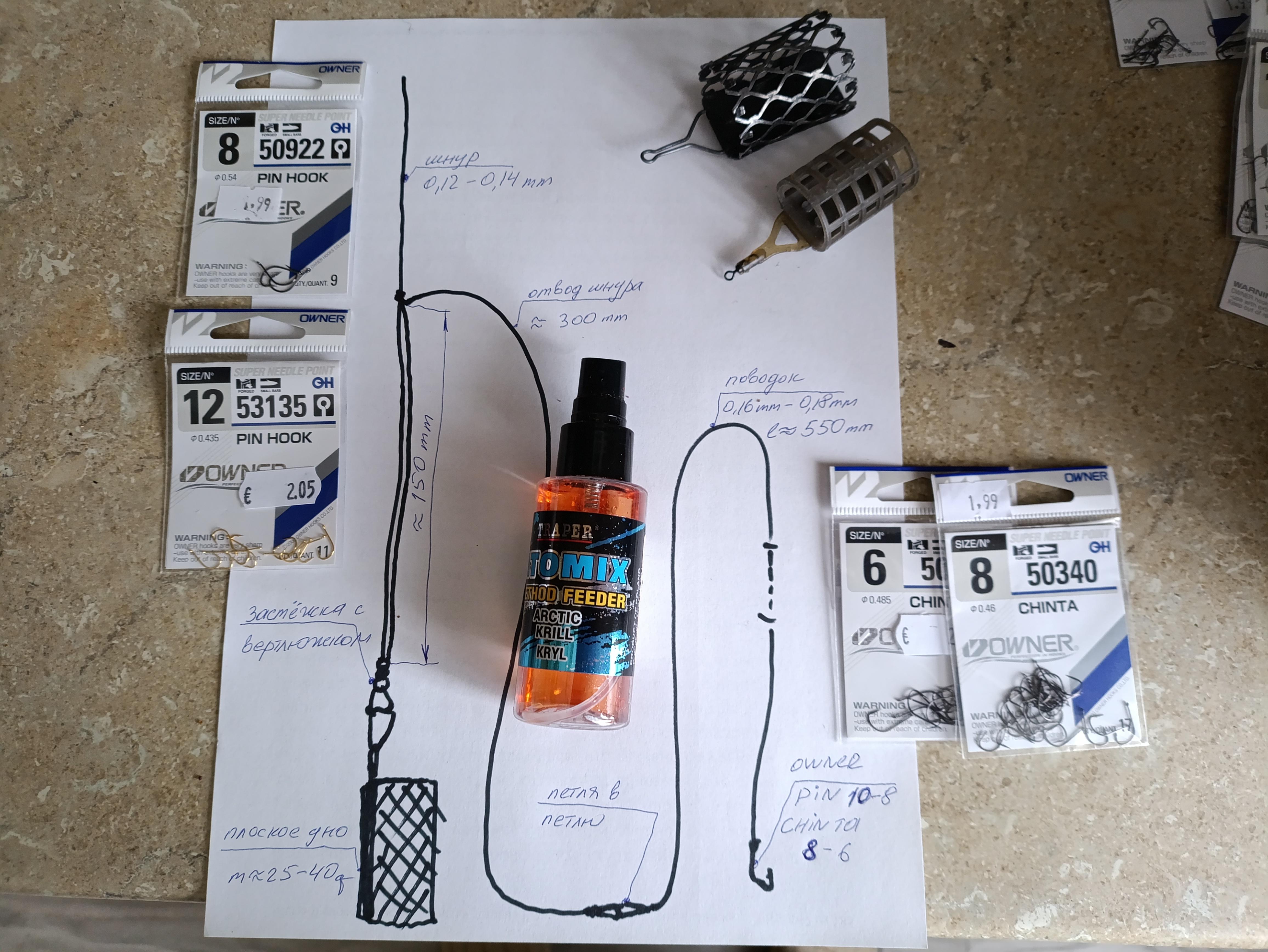 Один знакомый рыбак попросил поделиться своим фидерным монтажом и т.п. Набросал ему эскизик. Прикладываю его и здесь. Может быть кому-то пригодится. Т.к. реализация поклёвок весьма высокая и никаких сходов и обрывов. Лично у меня все цифры в размерах минимальные. Т.е. шнур 0,12 мм, крючки номер 12 — 8, поводок 0,16 мм.