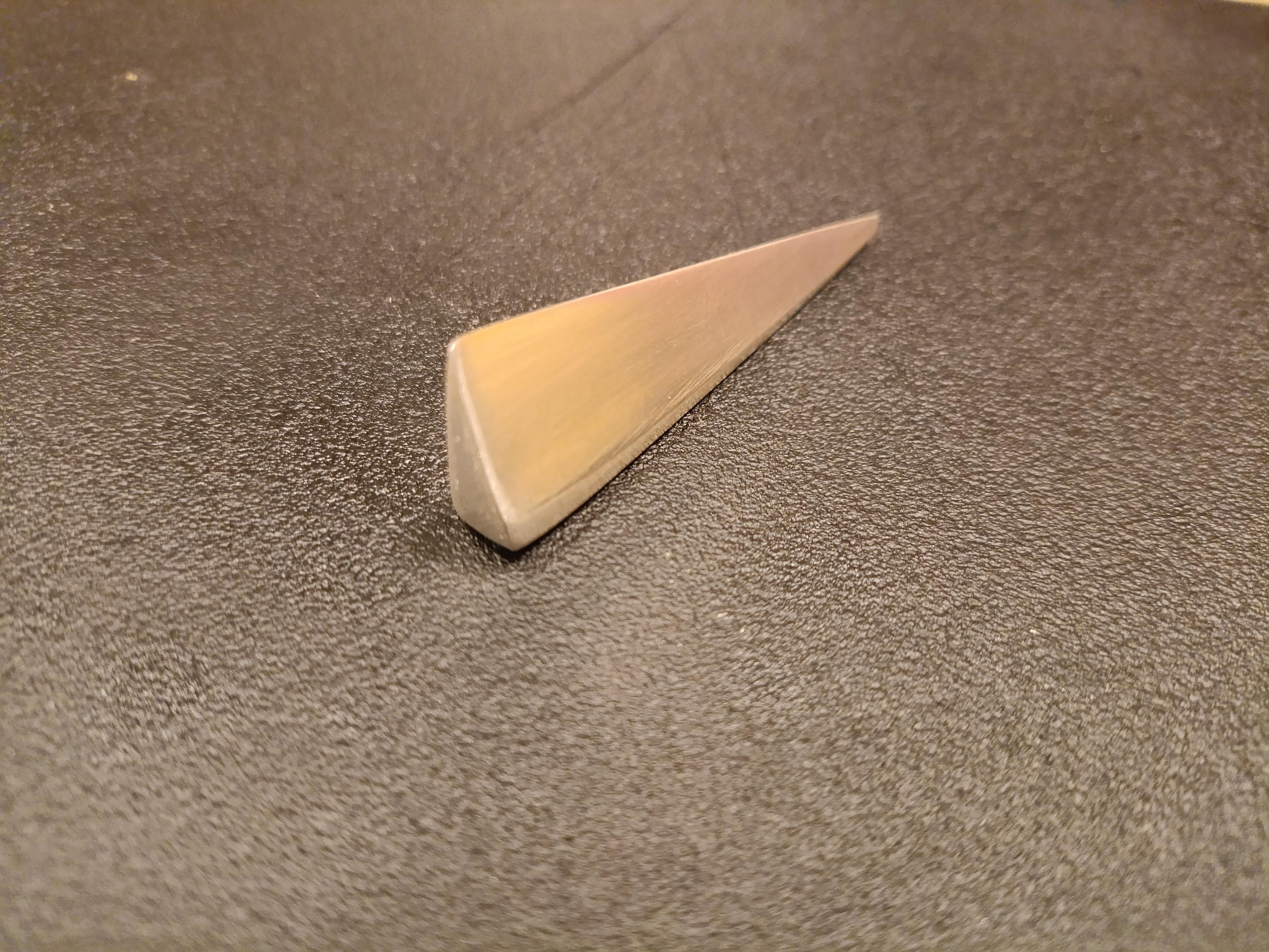При тестировании КТ47 на 8 м видно (да и по быстрому отыгрышу блесны при падении после дёрга), что это очень быстрая блесна. Также можно это заранее предположить и по её геометрии. И у меня возникла мысль на КТ в исполнении 47 мм, 9 гр сделать «угол атаки» больше. Проще говоря — в районе перехода 3-х граней в одну блесну изогнуть сильнее, чем на оригинале КТ36. Мне думается, что блесна будет играть более активно, её стремительный бег несколько замедлится. И при КД она будет играть лучше.
