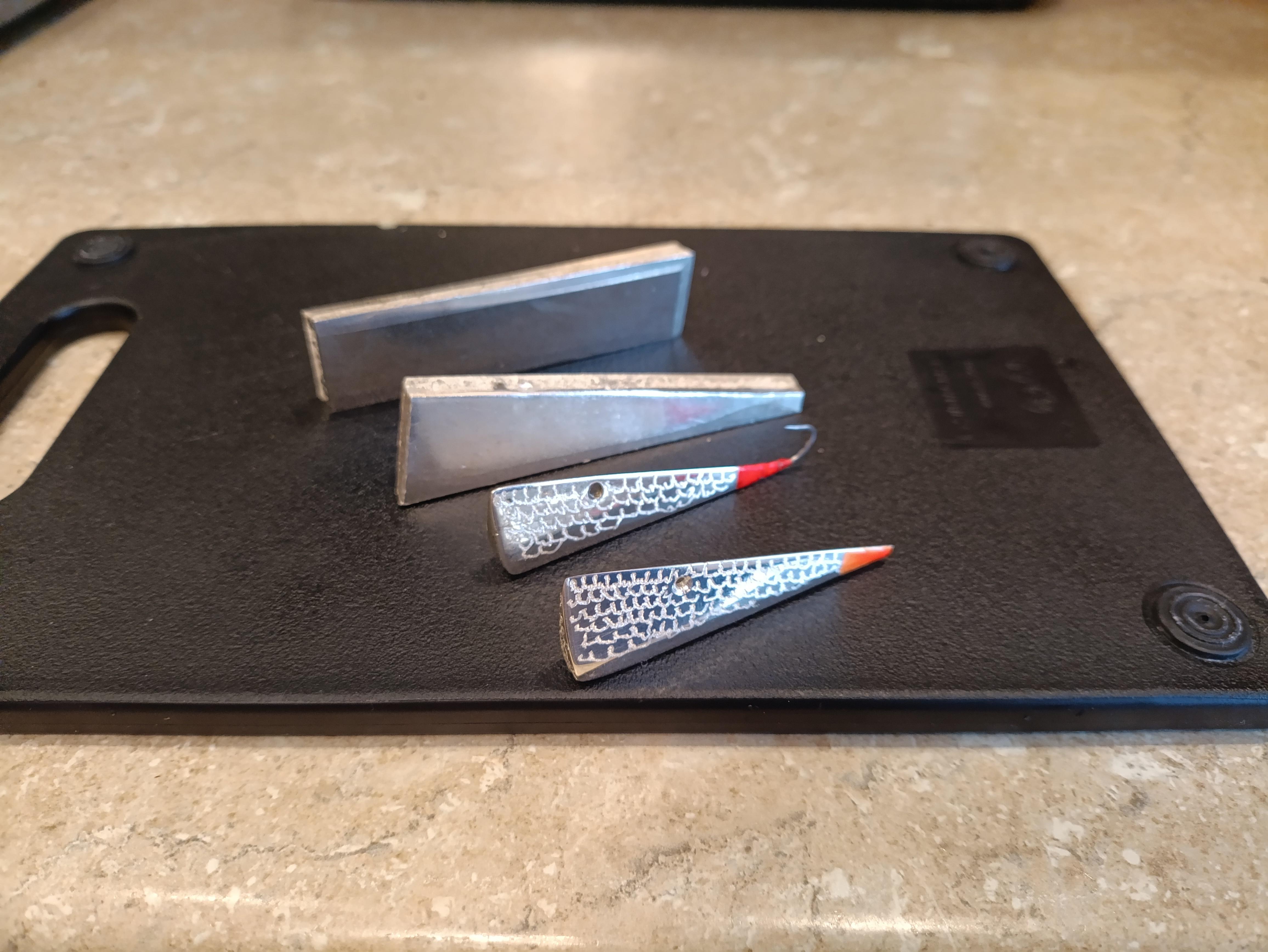 Один рыбак окуней на Чудском как-то особо не ловит. А вот налим — его тема. Дал образец (она без покраски) блесны для копирования. Скажу сразу, что точную копию я сделать не стремился. Старался функционал выдержать. Блёсенки от 17 до 20 гр и от 55 до 65 мм. Впервые такое мастерю. Поэтому долго возился.