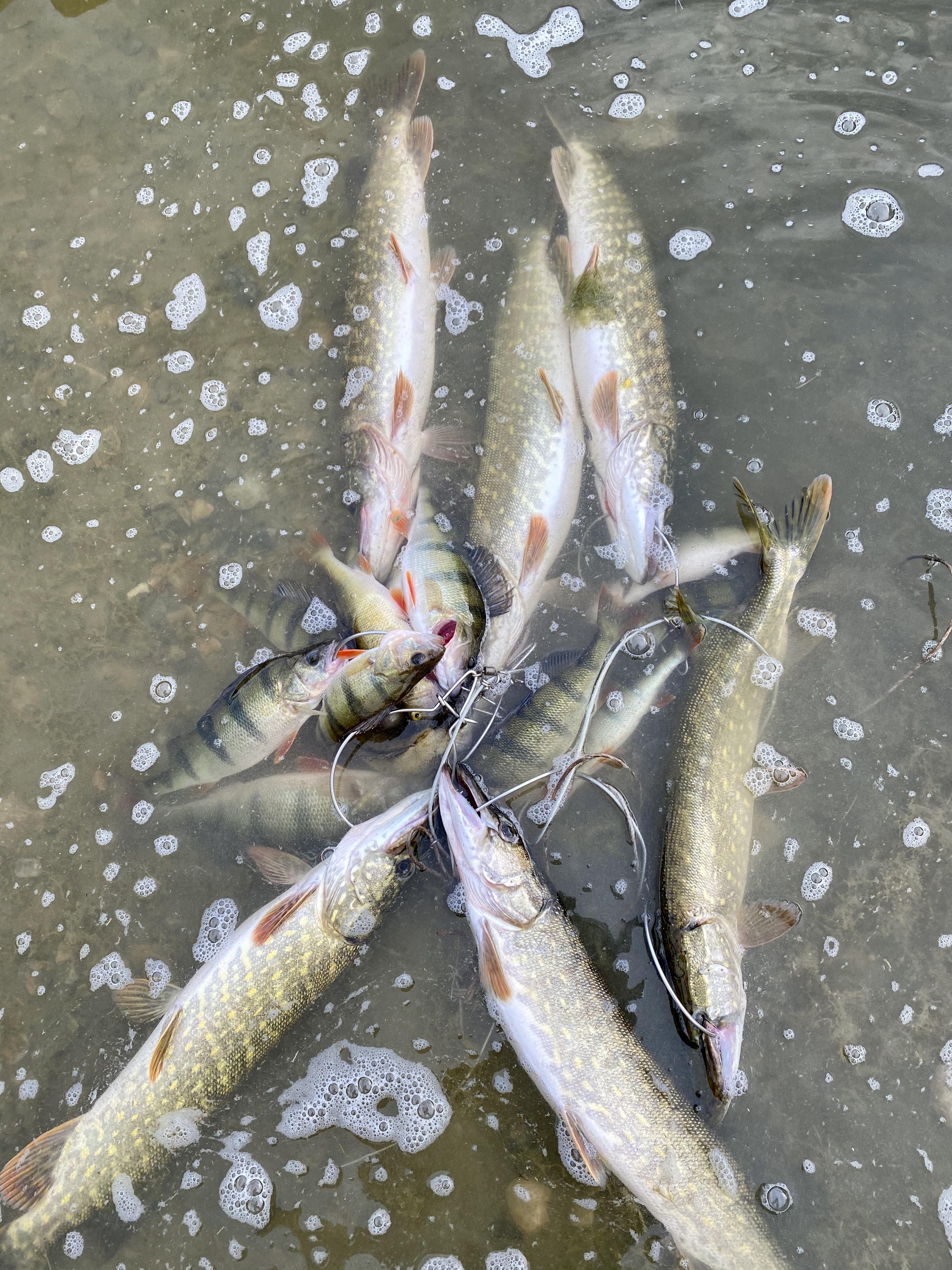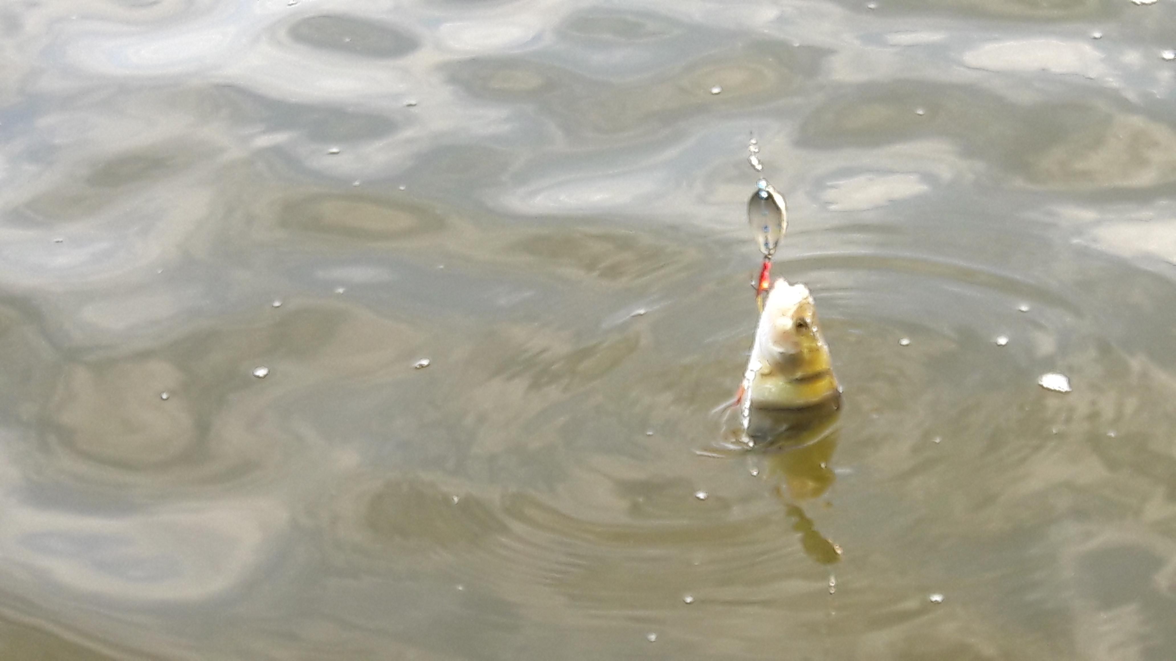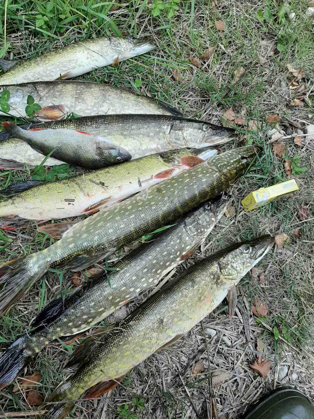 Щуку так и не увидел, десяток окуней с одного места, брал очень осторожно на маленькую вертушку с подсадкой на крючок кисло-зелёного резинового хвостика, который постоянно откусывали, из них только три пол килошные уехали со мной, остальные растут.